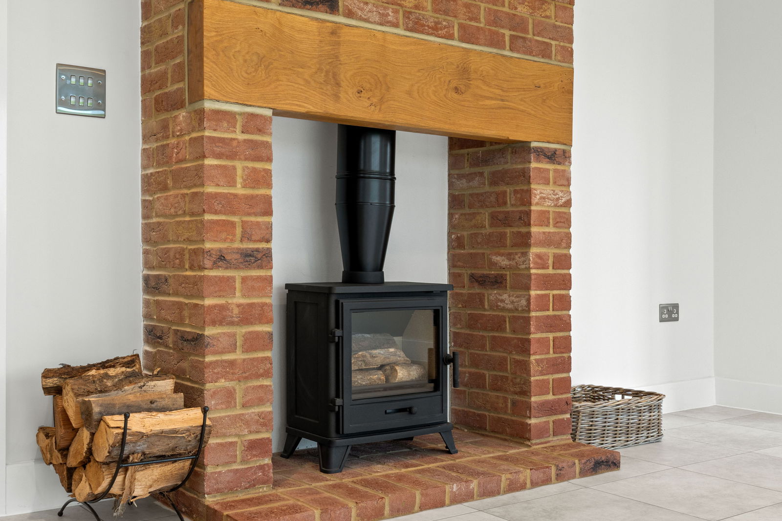 At the front of the house, the family room is a versatile and well-sized space. Whether used as a second sitting room, playroom, or a home office, (taking advantage of the ultrafast fibre optic broadband data connection) it has sumptuous neutral carpeting and is filled with natural light thanks to a double window that frames the courtyard entrance. Moving across the hall to the larger reception room, again you find high quality carpeted floors, and dual aspect views with a large window at the front and bi folding doors opening out onto a patio. This room leads through double doors to the open plan dining area and kitchen. Here you really appreciate the continuation of the garden views through the high quality Velfac glazing which is a constant throughout the property. Velfac are renowned for manufacturing energy efficient windows and doors, all to the highest specifications, working to achieve an energy smart home. The dining and kitchen area benefit from practical tiled flooring, a more traditional feel in this space, along with the wood burning stove in the characterful brick chimney breast. This sociable space is ideal for family gatherings, and the flow from kitchen to outdoors created by the bi-folding doors into the garden works perfectly in the summer months, and in the colder months the wood burner adds atmosphere and draws you into this heart of the home. As you would expect, this kitchen has everything you need for a busy family; an electric range oven, side by side American style fridge freezer (plumbed for ice and water), a large wine cooler, an integrated dishwasher and the central island with seating makes this the perfect spot to catch up on your day while preparing a meal, or kids to enjoy breakfast before school. The generous utility space leads off the kitchen where you will find more storage cupboards, the washing machine and tumble dryer and access to the garden via the back door. There is also an internal door reaching the garage.