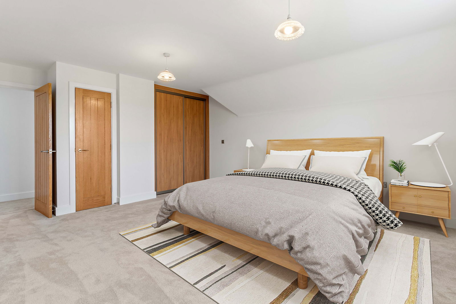 Upstairs, there are four generously sized double bedrooms, each enjoying the lovely countryside views that come with this peaceful rural setting. At the heart of the first floor is the main bedroom suite — a bright, spacious room with fitted wardrobes along one wall and a double window looking out over the paddock. The en suite bathroom is complete with a freestanding bath, double sink unit, and a separate walk-in shower, all finished in a sleek, contemporary style. The second bedroom is ideal for guests or older children, with its own private shower room and a deep fitted wardrobe. Bedrooms three and four are also good-sized doubles and share the family bathroom, which features a full-sized bath with an overhead shower.
