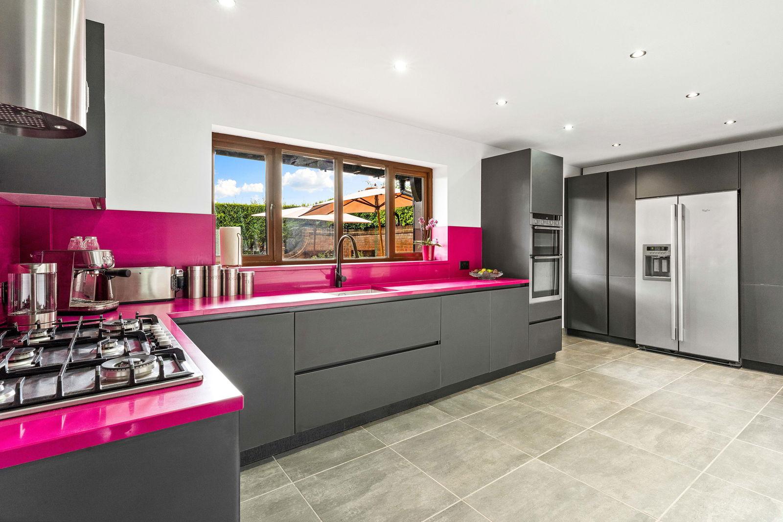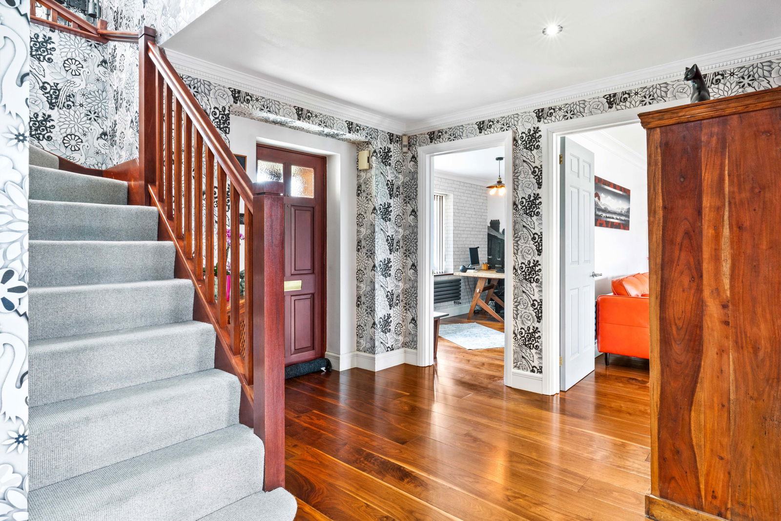 Entered via an attractive central hallway with polished French Walnut flooring, stairs up to the first floor and doors into each of the ground floor rooms. The downstairs cloakroom has been attractively refitted with a contemporary suite and tiled walls and floor. The lounge/dining room is found at the back of the house with French doors and windows opening onto the garden. Originally this wonderful, bright and spacious room was two separate reception rooms. The owners have opened it up to form what is undoubtedly a very impressive living space ideal for both cosy family evenings and for entertaining. The polished French Walnut flooring really sets the room off and a lovely focal point to the room is the fireplace with gas living flame fire. A second sitting room/ study offers the essential second reception room or office for those that work from home. Another room that overlooks the garden is the good size kitchen/breakfast room. Well fitted with an extensive range of contemporary glass fronted units set under a quartz worktop. Integrated appliances include a Neff double oven, six burner hob, cooker hood, dishwasher and space for an American style fridge freezer. Useful additions such as the two pull out full height larder units complete this fabulous kitchen. There is a door into the garden and also a door leads into the double garage.