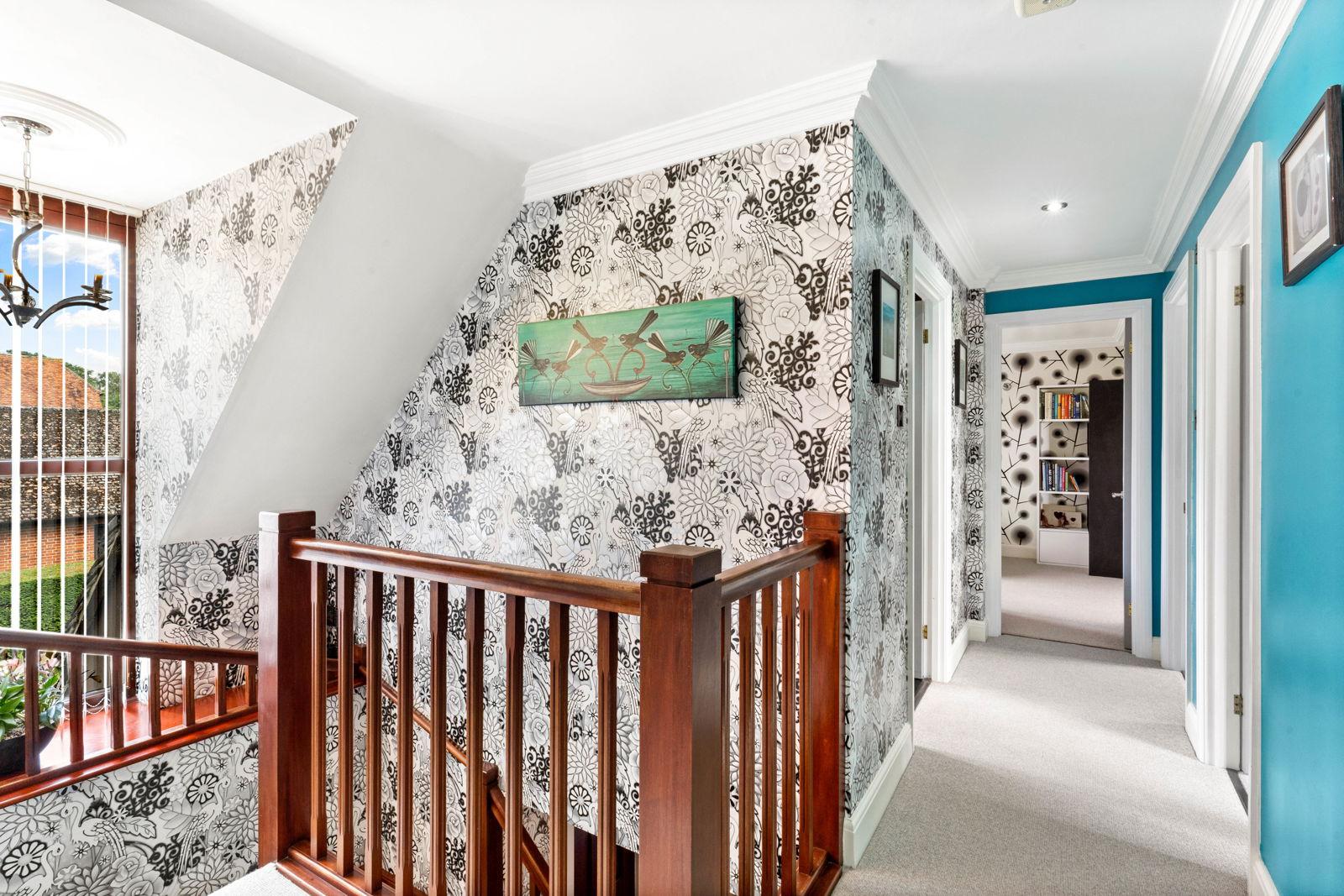 Number 21 is arguably one of the best positioned houses here. It is a large semi detached freehold house with luxuriously appointed accommodation. The present owners have refitted and remodelled the house with great thought having been put into the design whilst using high quality fitments throughout including designer radiators in many of the rooms, polished French Walnut flooring in the hall and two reception rooms, beautifully appointed bathrooms and cloakroom and a refitted contemporary style kitchen. In addition the house benefits from its own driveway to the front of the house for three or four cars, a double integral garage and its own lovely part walled, west facing garden that enjoys great privacy and backs onto fields.
