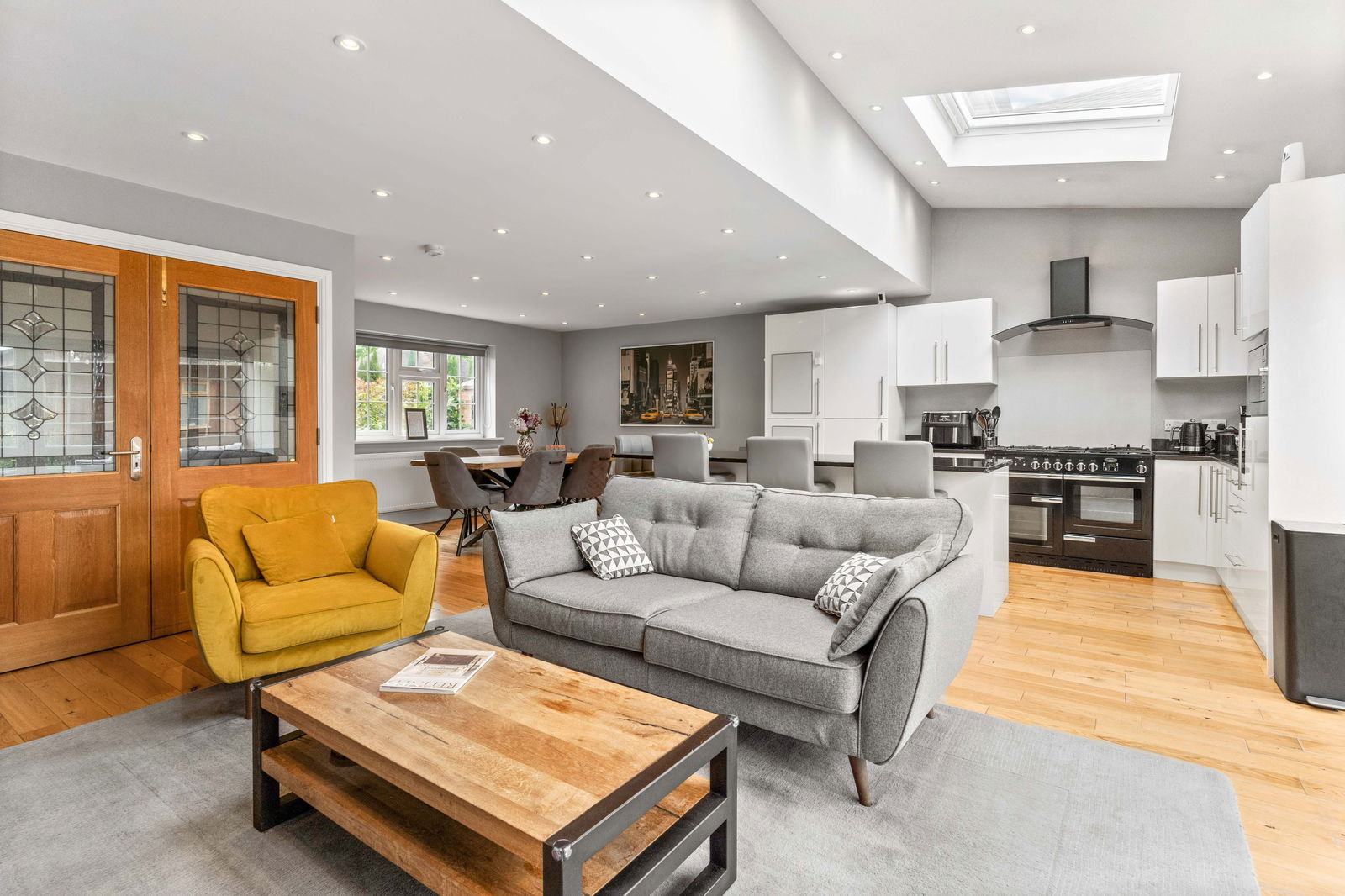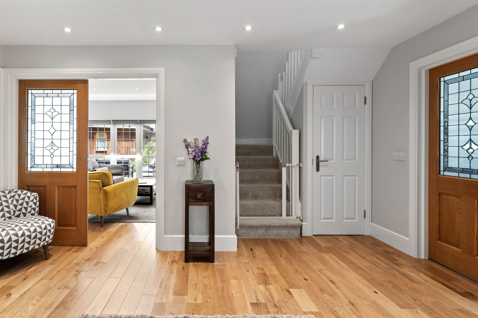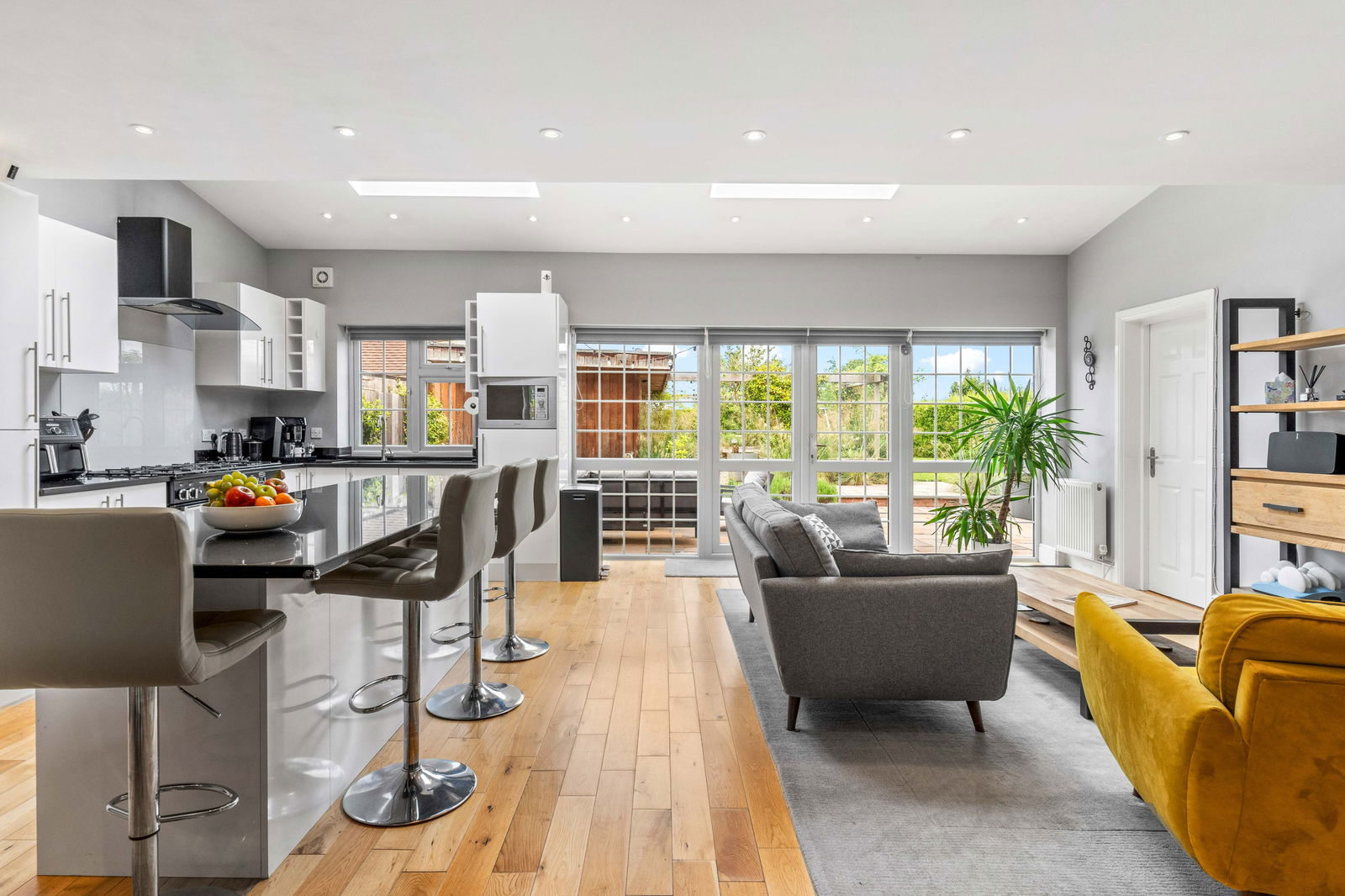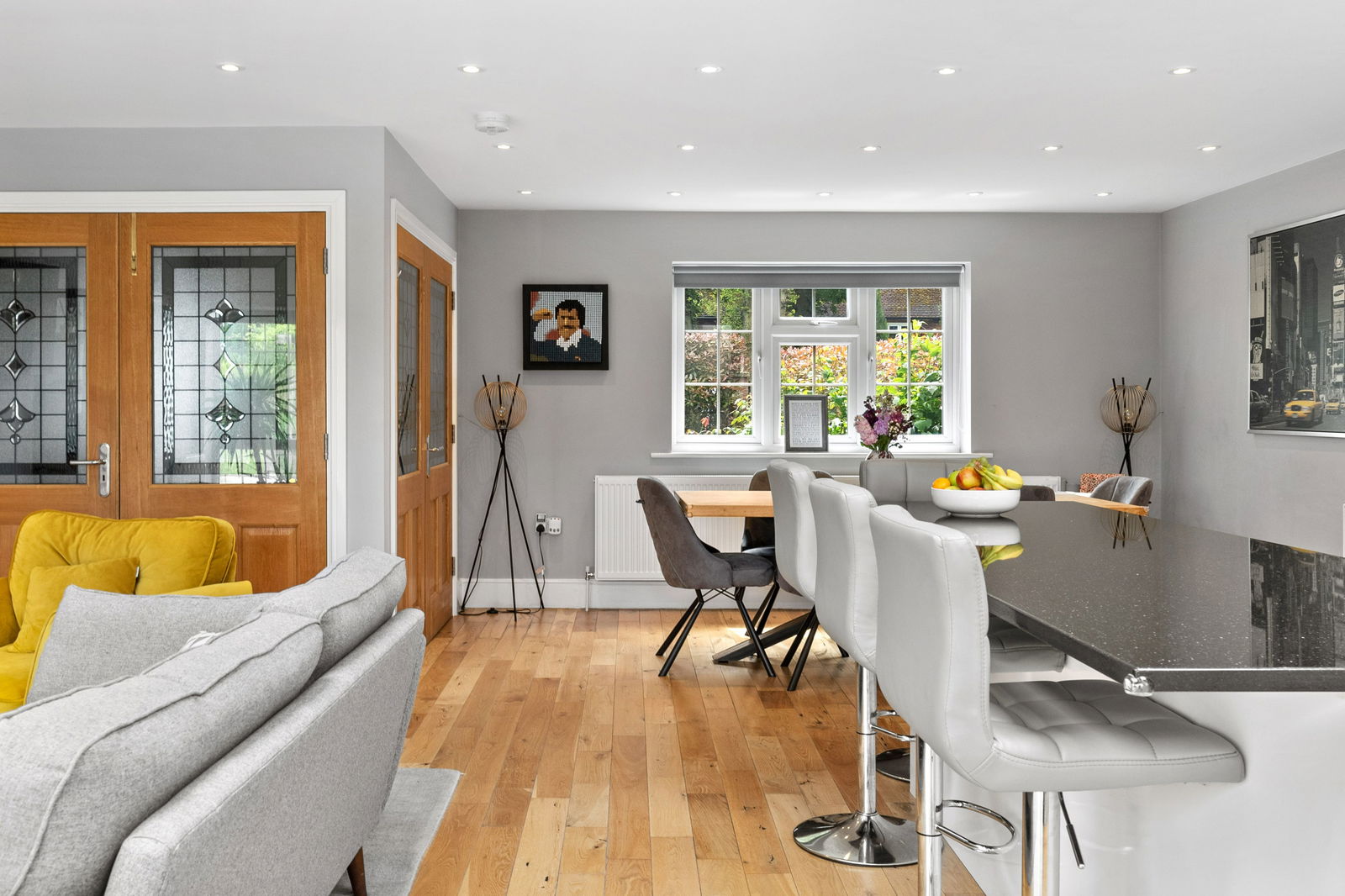 Into a spacious, light, and airy hallway with stunning wooden flooring throughout the ground floor and feature doors leading you through the ground floor accommodation. A modern, open plan kitchen dining area with family room and doors straight out to the garden. This is a great entertaining space, connecting all the family and making it the heart of the home. The kitchen is light and contemporary