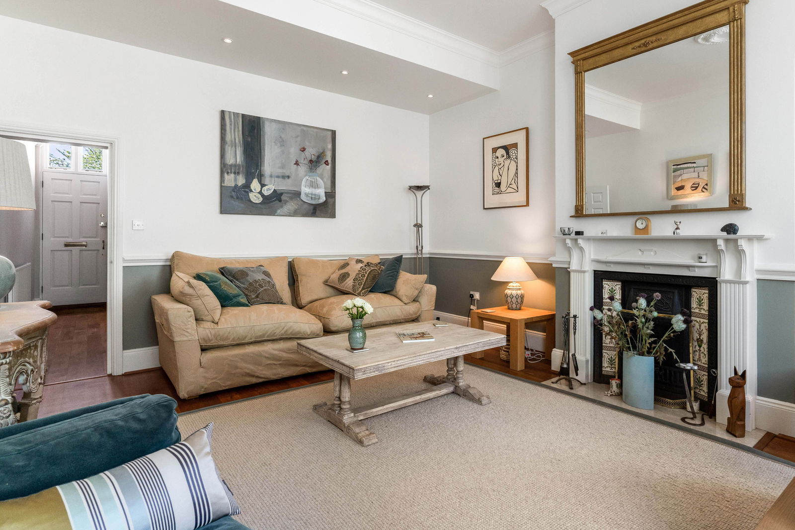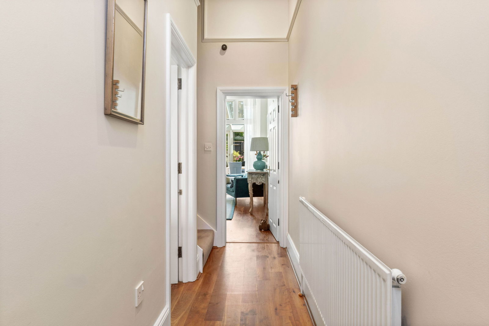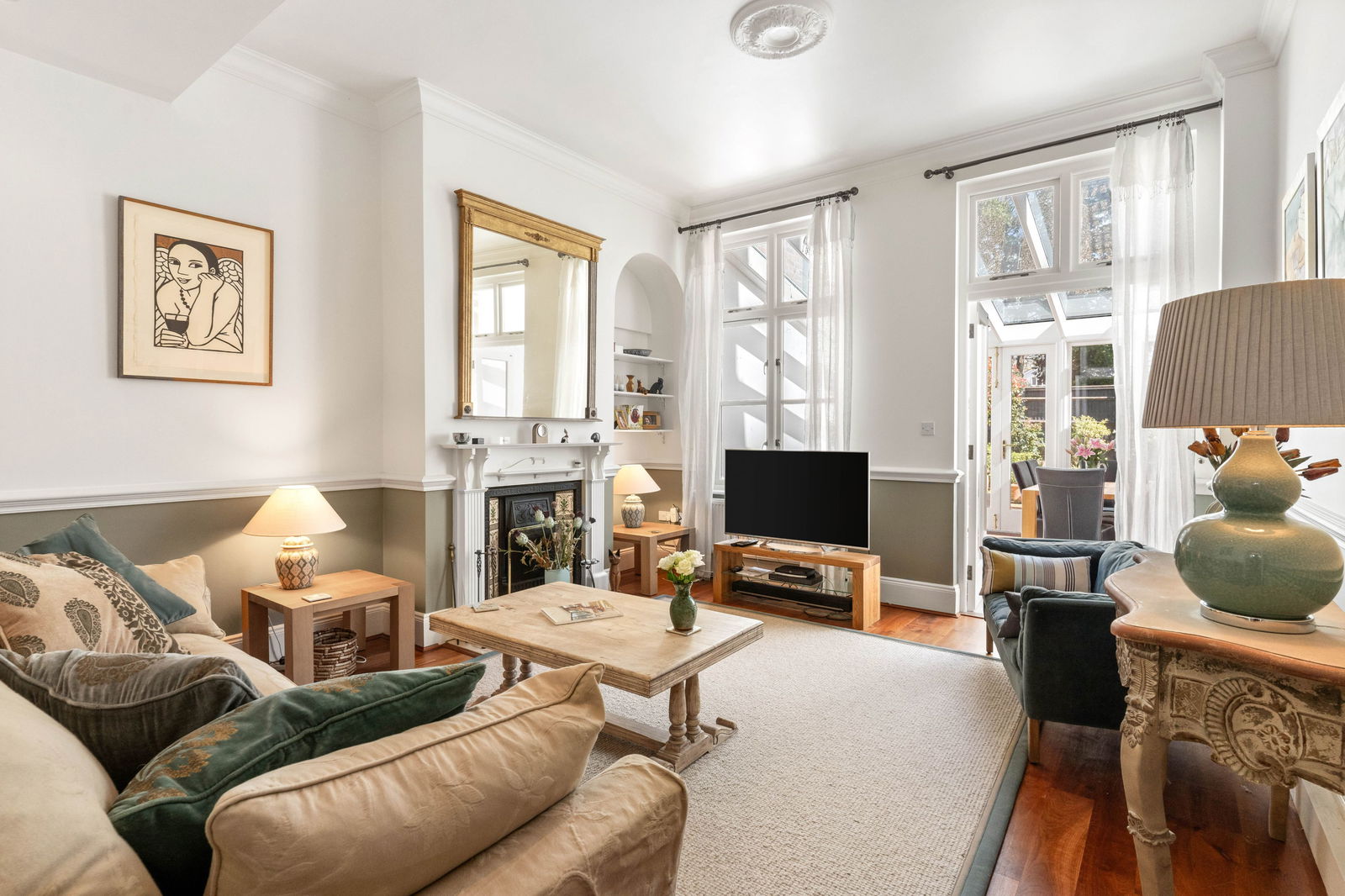 An inviting hallway, with high ceilings and cherry wood flooring which flows through the ground floor, leads you into this marvellous Victorian home. The kitchen is of high quality and well designed, looking out on the front lawn and beautiful full height windows allow the light to flood in. The grand living room has an elegant fireplace with cast iron and decorated tiled features, windows and doors leading you to the sunroom which creates another dimension to this home, a light and spacious place to entertain and enjoy the private garden. The sunroom has tiled flooring and French doors, a lovely place to have the dining table or perhaps just watch the wildlife and relax.