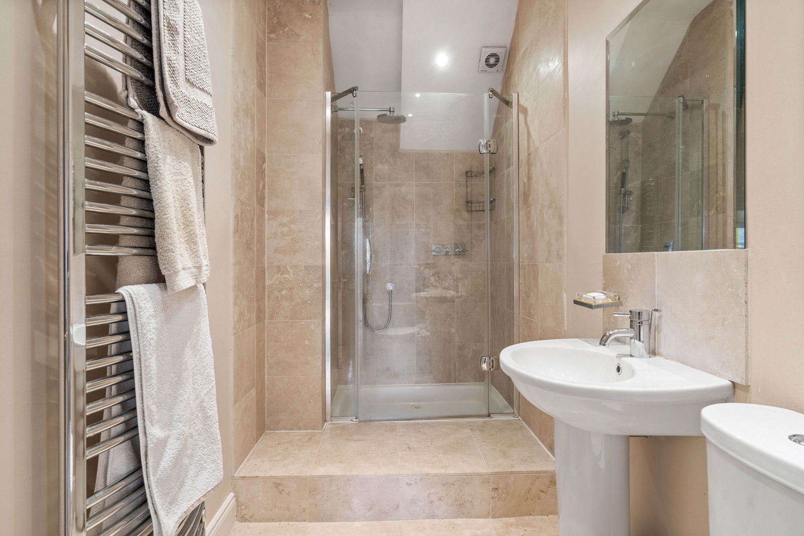 On the first floor you will find two bedrooms and a Victorian inspired bathroom, with a free standing roll top bath and complementary tiles in keeping with the design of this home. On the top floor you will find a luxury fitted shower room and two further bedrooms. The master bedroom has built in wardrobes and offers fabulous views over the Hertfordshire countryside. This home has a luxurious feel, a safe and secure setting and close by to everything you will need. If you travel frequently, you are set within a community so a safe place to lock up and leave with peace of mind.