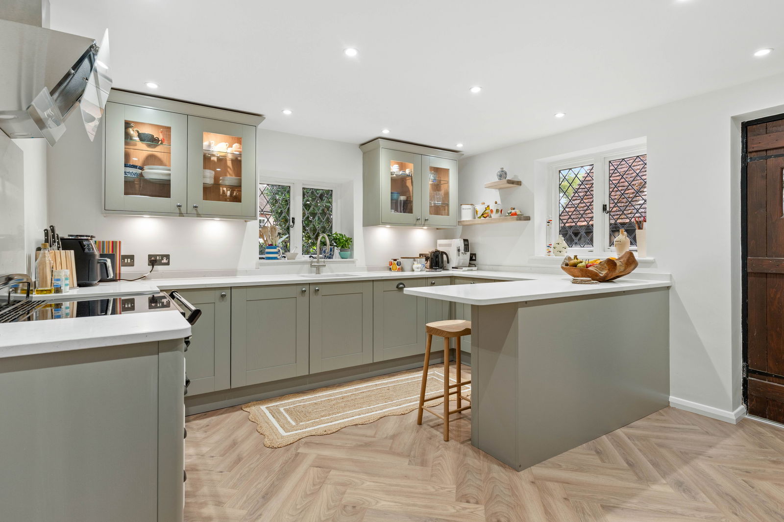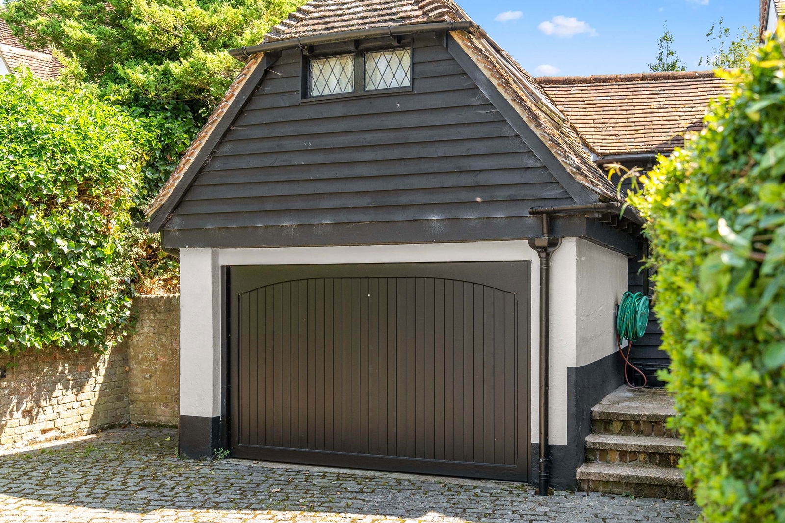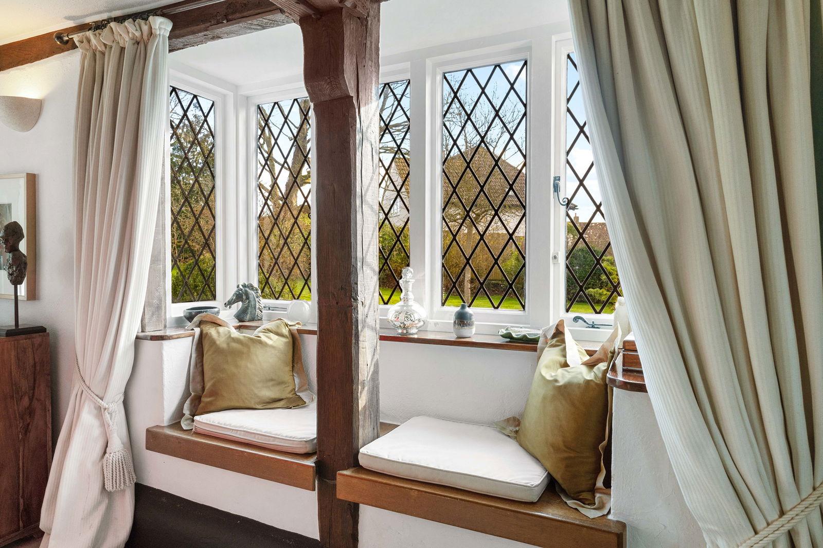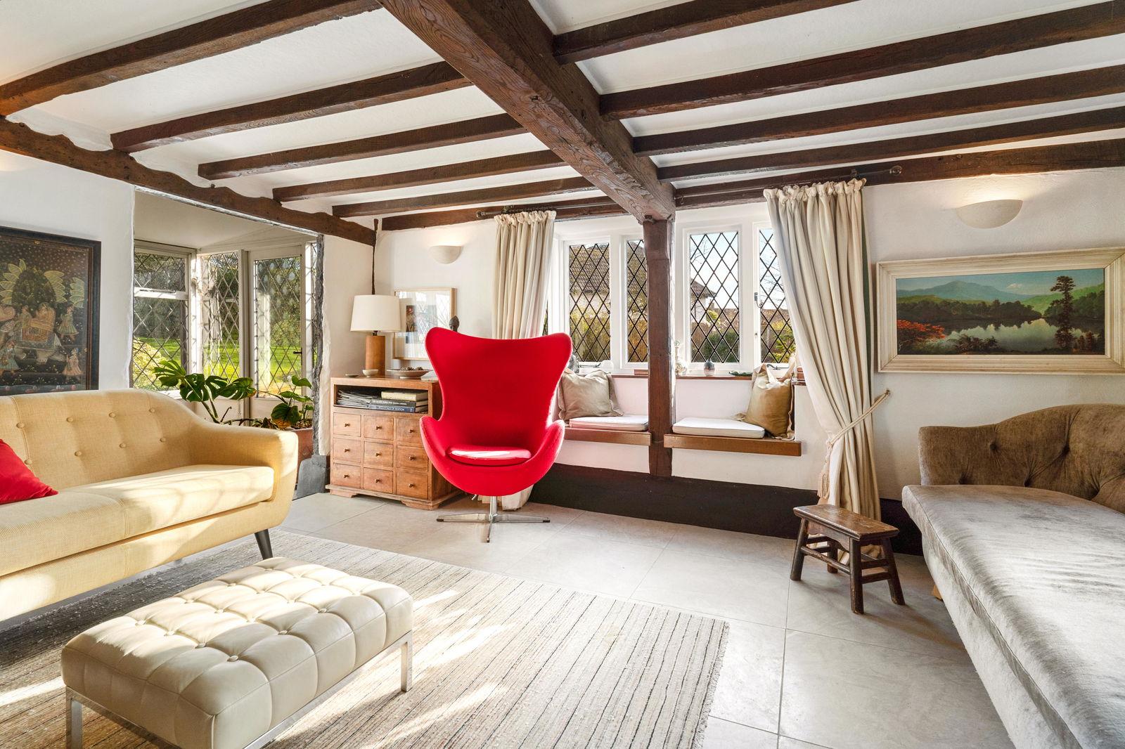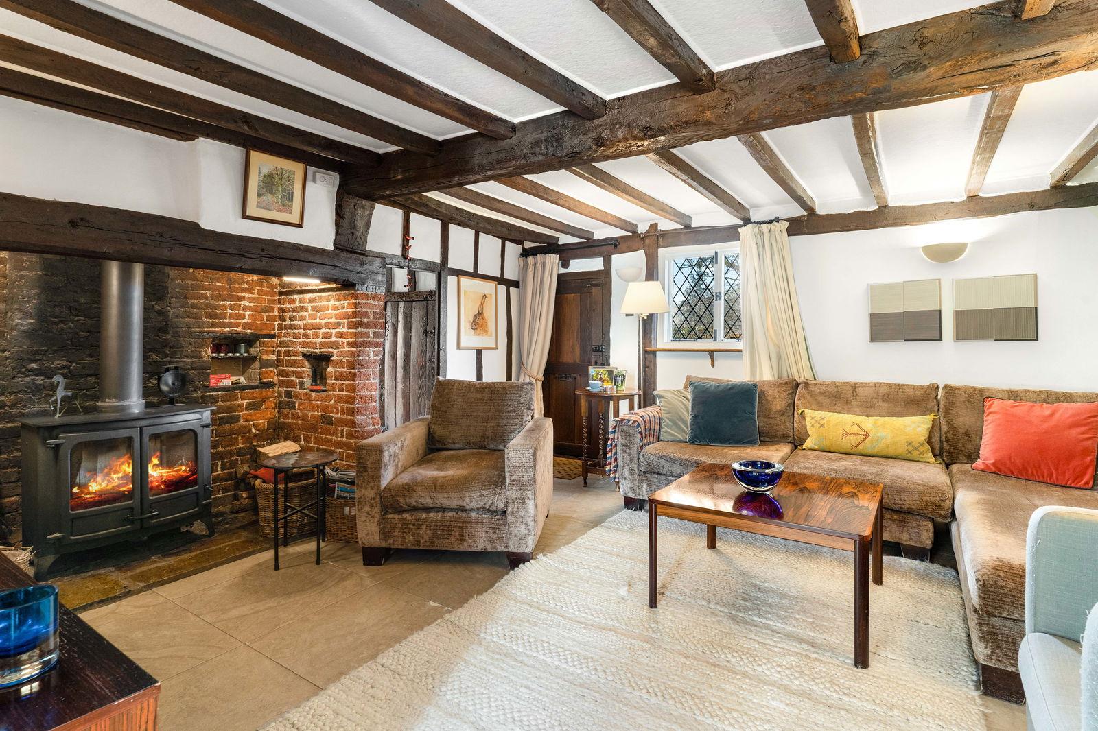 There are two front doors into the house. One, at one side of the house leading into a hallway and the other, in the centre of the house, leading directly into the living room via a beautiful Oak front door. On a day to day basis, the family use the side front door. This hallway has steps that lead up to a self contained double bedroom with an en suite bathroom. This is a lovely room, and is ideal as a guest or teenagers' room being built into the roof line above the garage. From the hallway one passes through the kitchen into the rest of the house. The kitchen/breakfast room has just been refitted with an excellent range of Shakers style contemporary units under white granite worktops. The kitchen enjoys a double aspect and cleverly combines a contemporary feel with the original character of the house. Adjoining the kitchen is the living room. Again, full of character and a really cosy room with inglenook fireplace with log burner, exposed timbers and windows to the front aspect. Across the back of the house is a lovely dining/garden room with windows and doors to two aspects. A fabulous room to entertain in and on a summers day to open up and enjoy. At the far end of the house is a further sitting room with a fireplace and windows to the front and square bay window seat to the side overlooking the garden. Stairs rise up to the first floor where one finds two double bedrooms both of which have vaulted ceilings, windows to at least two aspects and are full of character.