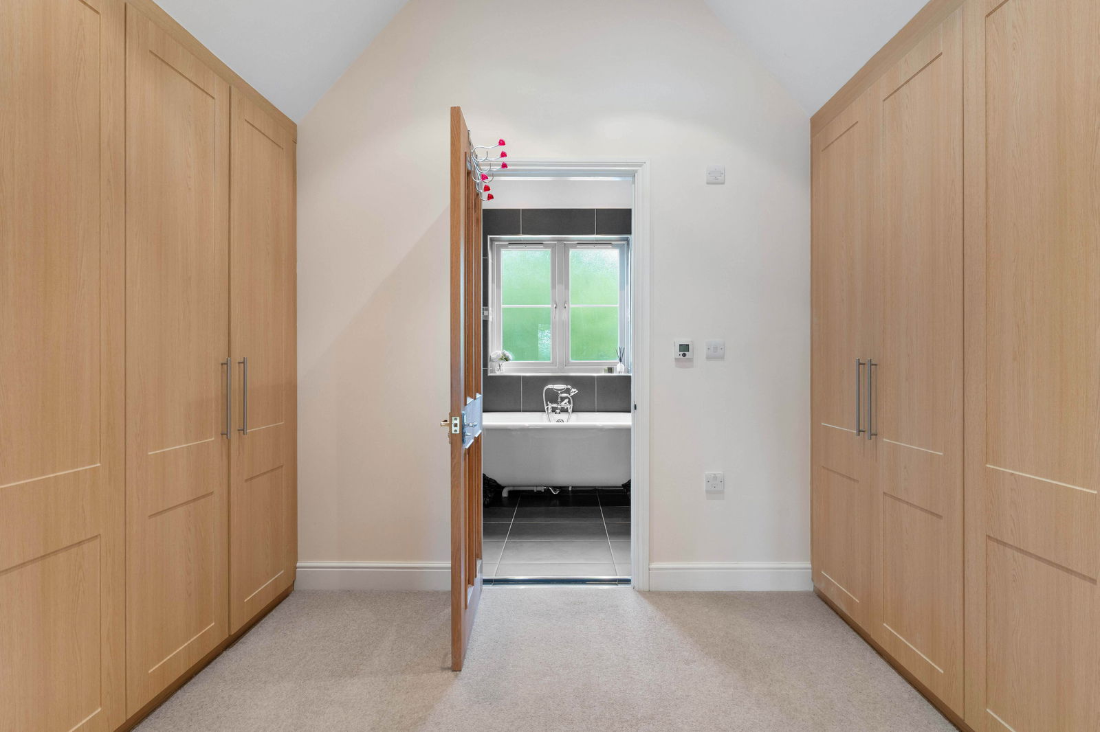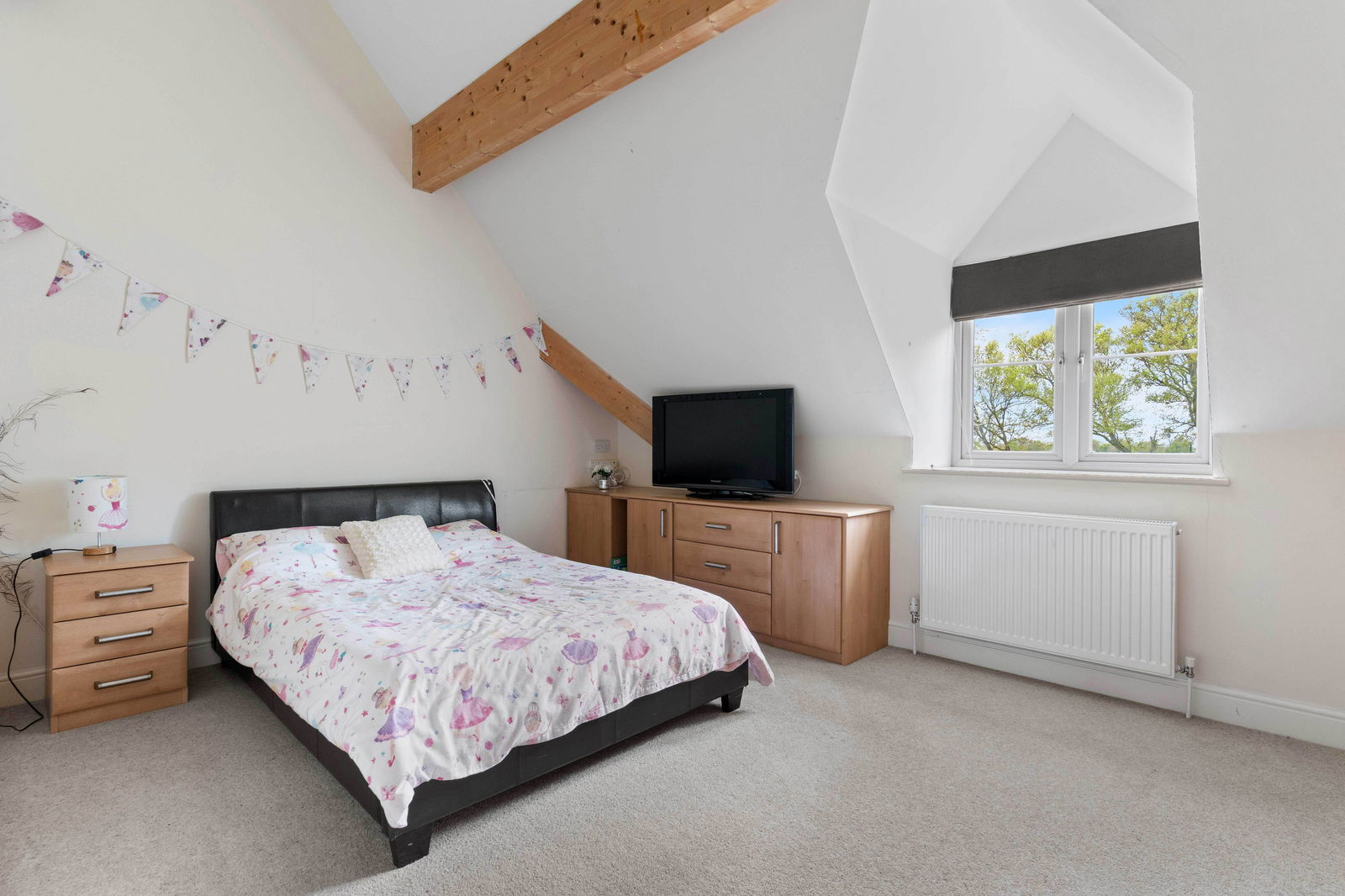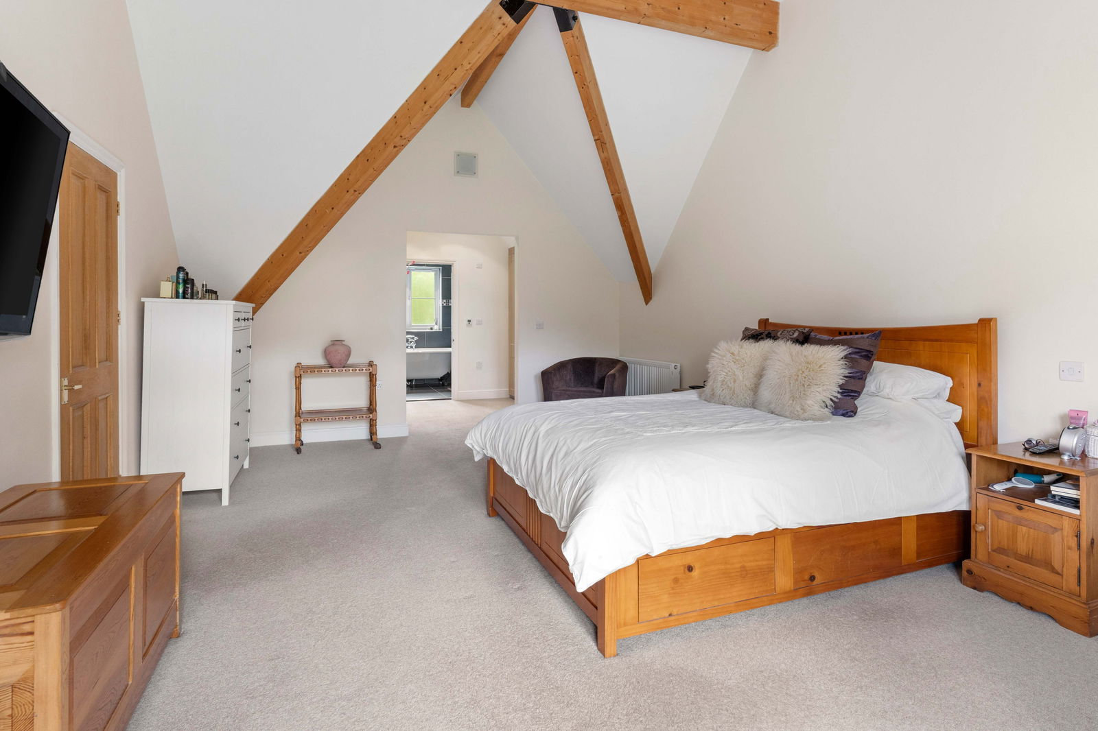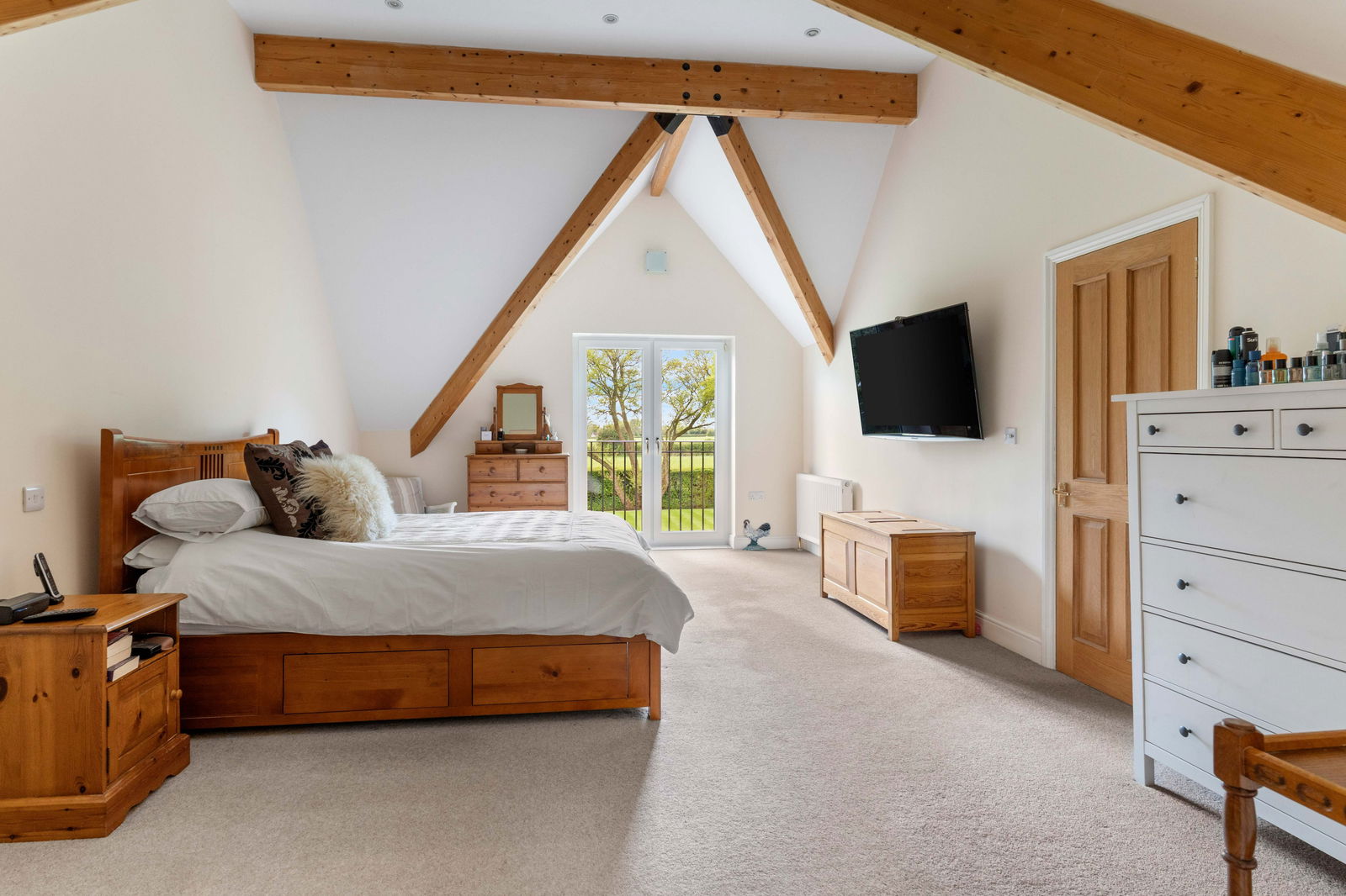 The first floor offers a spacious principal bedroom with vaulted ceilings and exposed beams and French doors with Juliet balcony to maximise the wonderful views of the garden and countryside every morning and evening. There is a large dressing area with plenty of built in wardrobes and a bathroom suit with roll top bath and walk in shower.