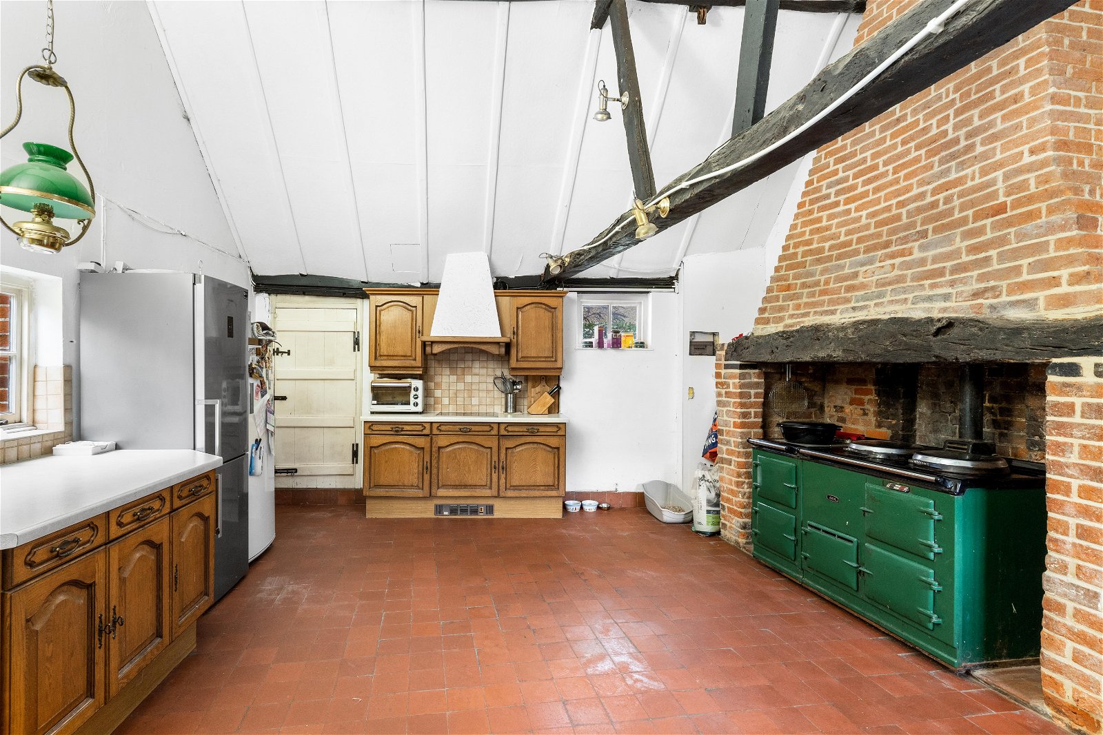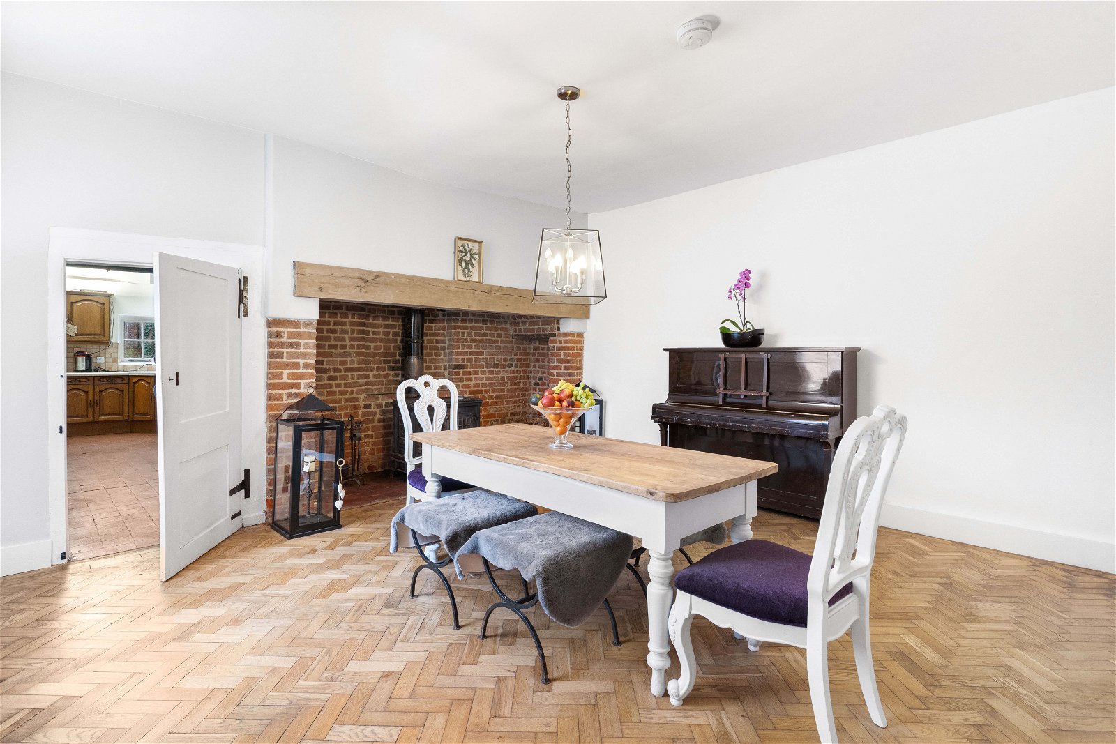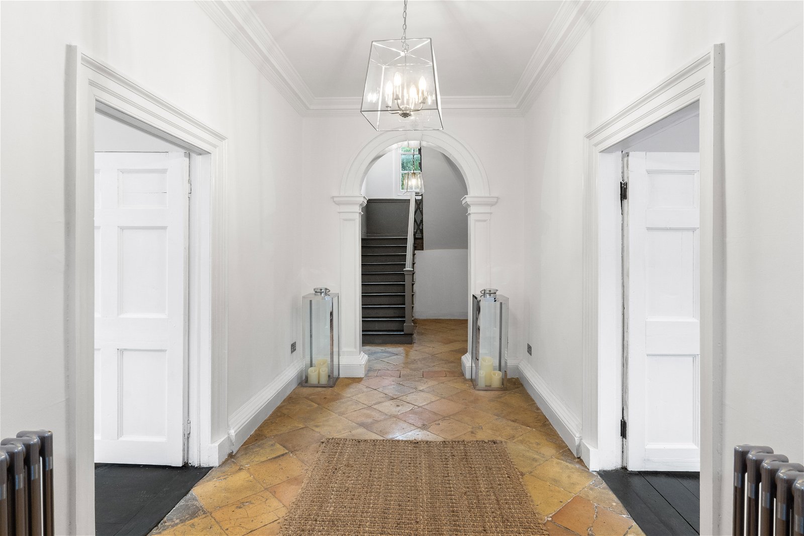 STEP INSIDE As you enter the hallway it simply takes your breath away. Centrally placed with the reception rooms off to each side the hallway stretches to the rear with a most impressive staircase rising up to the first floor. The drawing room is found at the front of the house with large sash windows with original shutters and a fine open fireplace. High ceilings with cornices add to the elegance of this beautiful room. Across the hallway is a dining room, again with sash window to the front with original shutters, high ceiling and a fireplace. The main living room is a quite beautiful room with a large, glazed bay window opening to the garden at the rear. Another room with fireplace and high ceilings. Off the rear hallway is also a cloakroom with contemporary suite. There is a further reception room, currently used as a gym, and a door and steps that lead down to the extensive cellar where one finds the new gas fired high pressure central heating and hot water system and water softener. At the rear one finds a large breakfast room with a very impressive and recently restored inglenook with wood burning stove. Woodblock flooring and a large sash window add to the character of the room. A door leads through to the large farmhouse style kitchen with high vaulted ceiling and exposed timbers. There is a large red brick fireplace with Aga. The kitchen was the next project on the present owners list and requires refitting and bring up to date. Adjoining the kitchen is another WC and an outside storeroom/boot room which could be brought into the kitchen or be a utility room or similar.