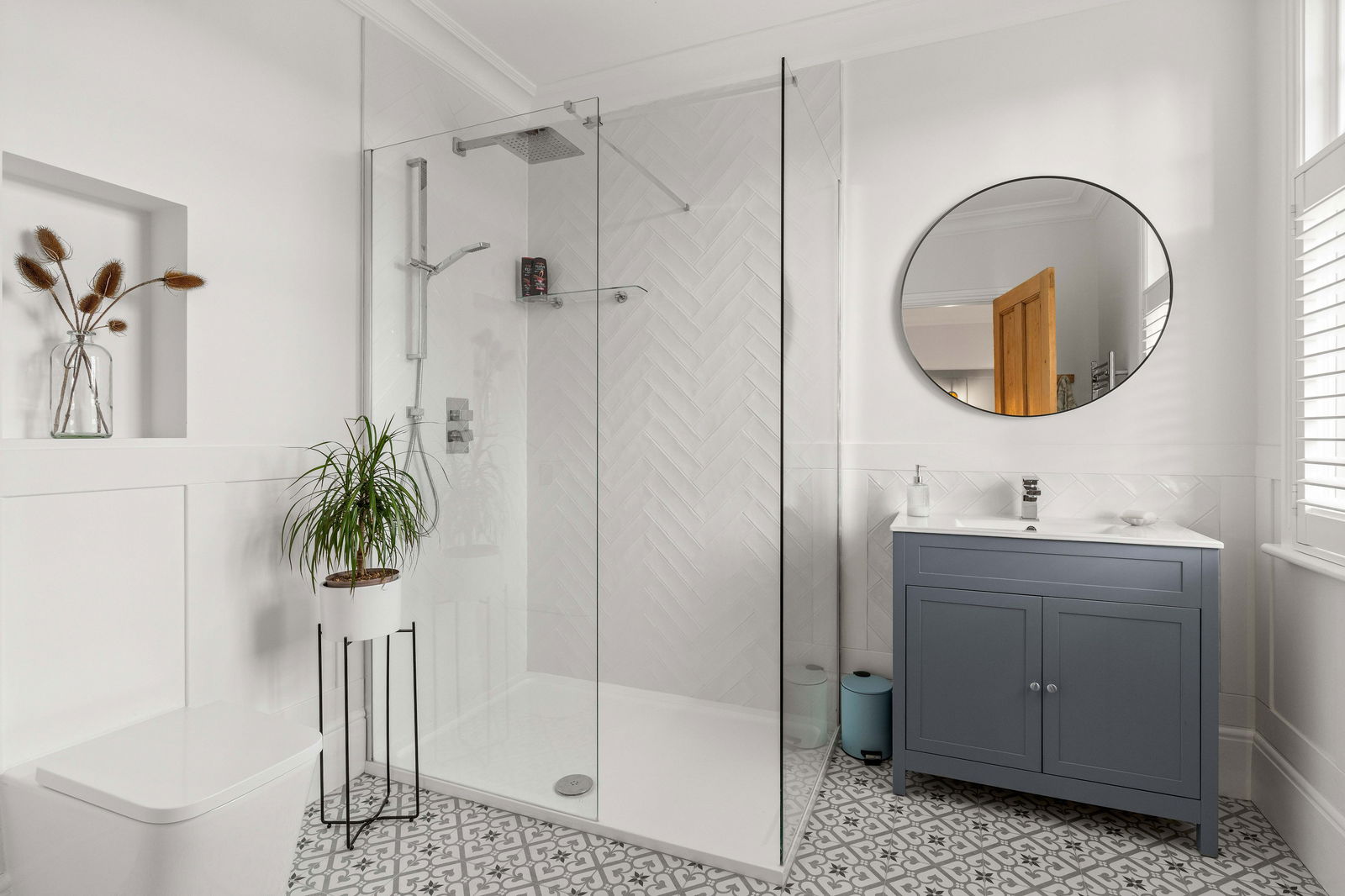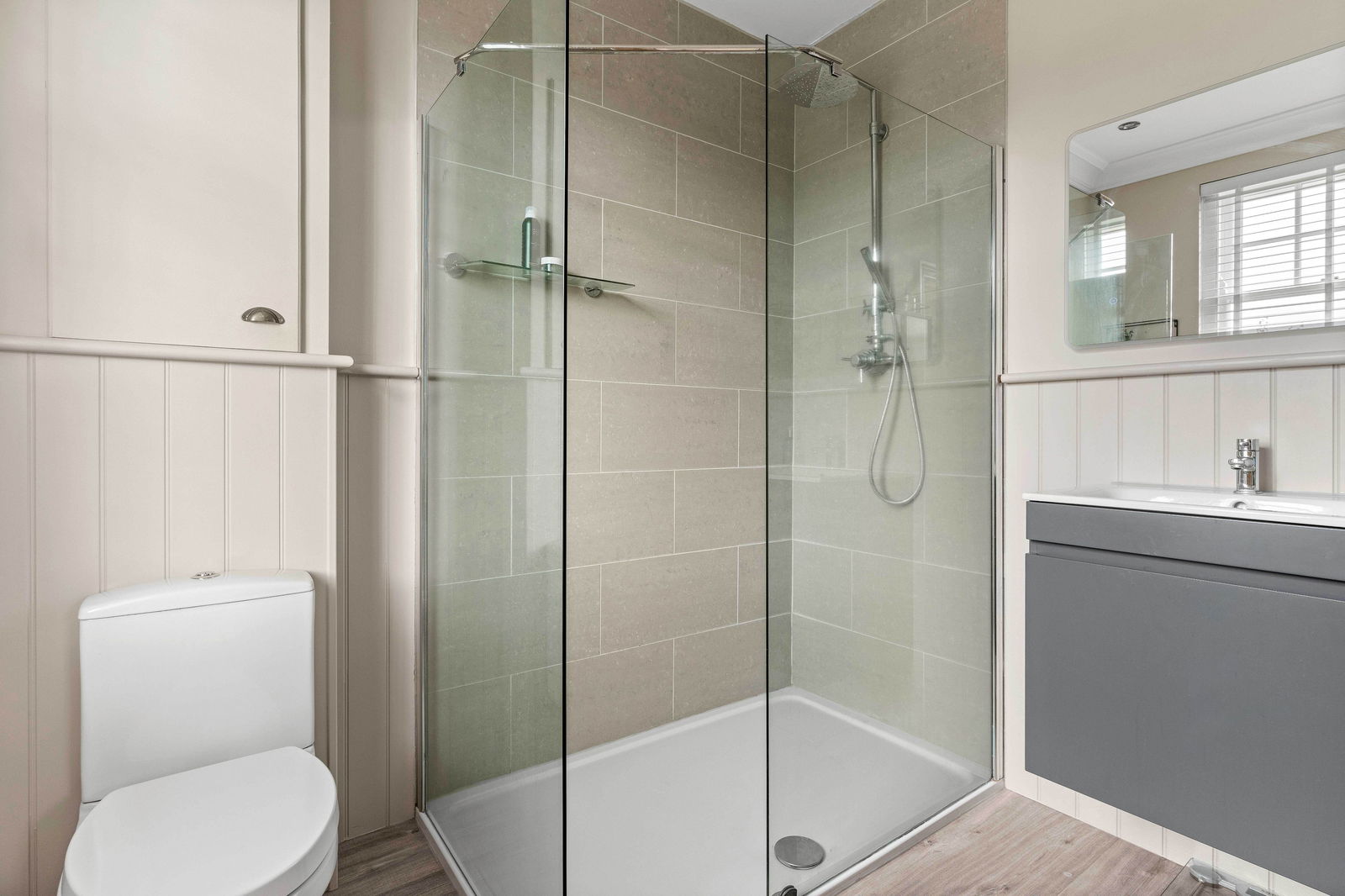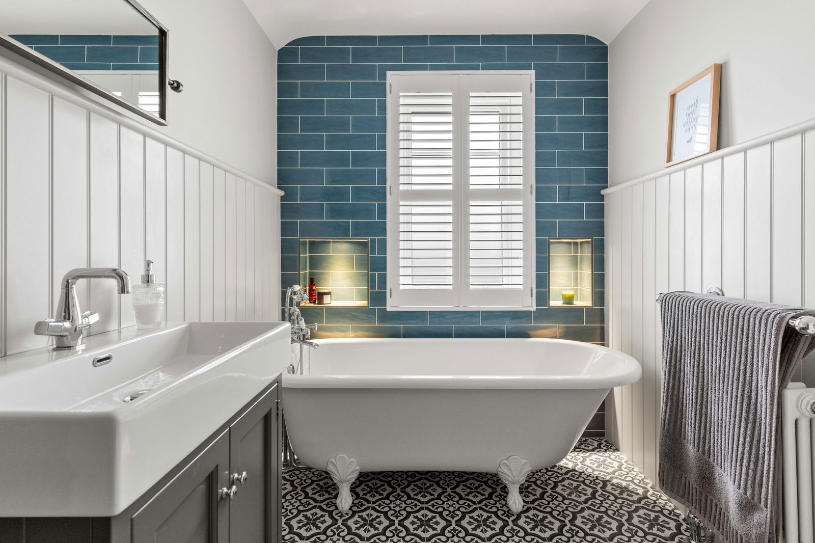 The family bathroom offers a beautiful feature door, with leaded coloured glass panels. A modern bathroom with roll top bath, shower cubical and well-designed inset tiled shelves with lighting and part panelled walls.