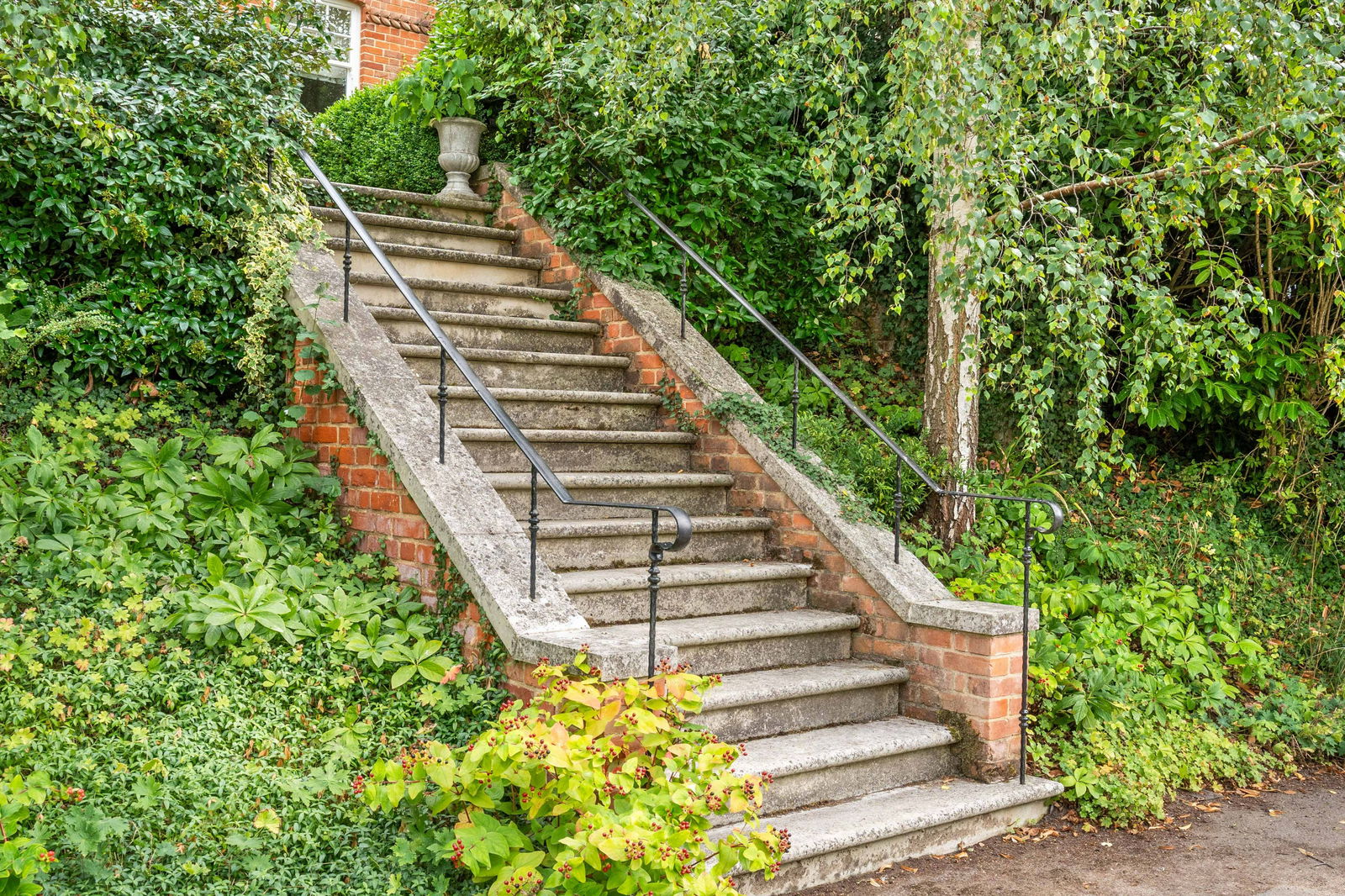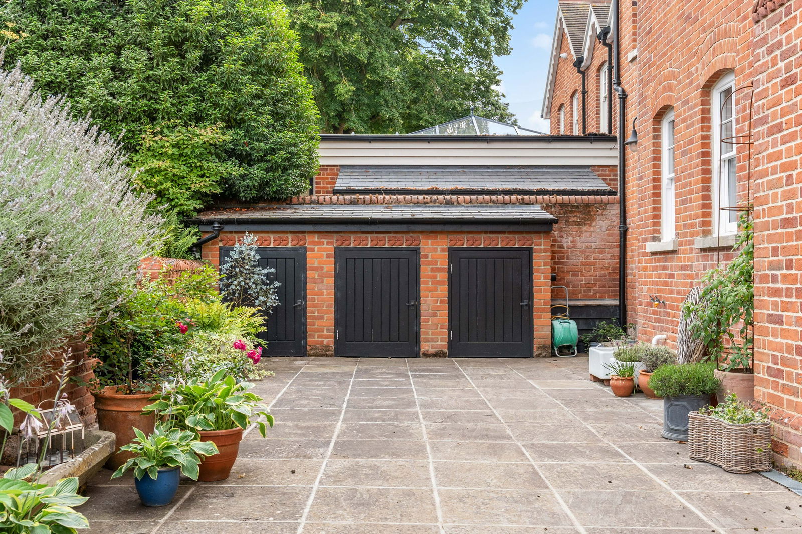 The front garden is a mature topiary style garden, in keeping with the charm and age of this delightful home. There is a grand staircase with cast iron rails leading up from Violets Lane through the well-manicured grounds and patio to the house. A wide, curved driveway up to plenty parking for four /five cars and access to the detached, double garage. There is a cast iron gate to the rear garden, and the house offers complementary outside lighting.