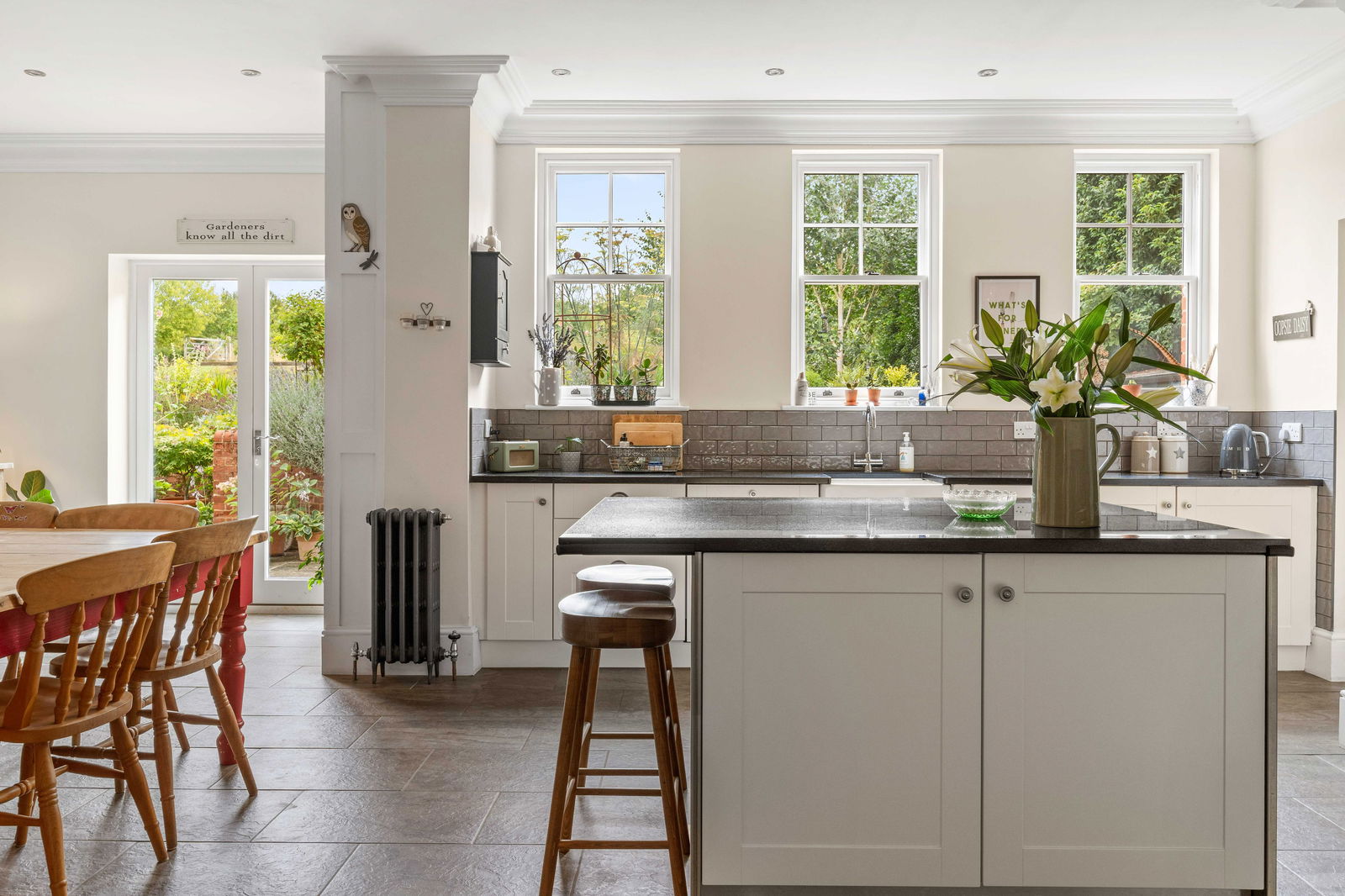 The light and spacious kitchen dining area really is the heart of this family home. A well-designed kitchen with central island and an array of sash windows looking out on the picturesque garden and patio. There is plenty of storage and space for appliances and a large dining area, great for entertaining with French doors leading out to the garden. The utility room is just off the kitchen, also housing the boiler and utilities. There is tiled flooring throughout and spotlights to create the light needed for evening entertaining.
