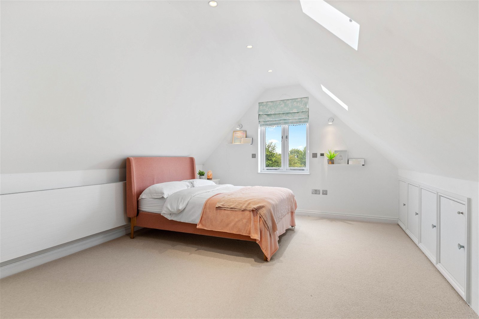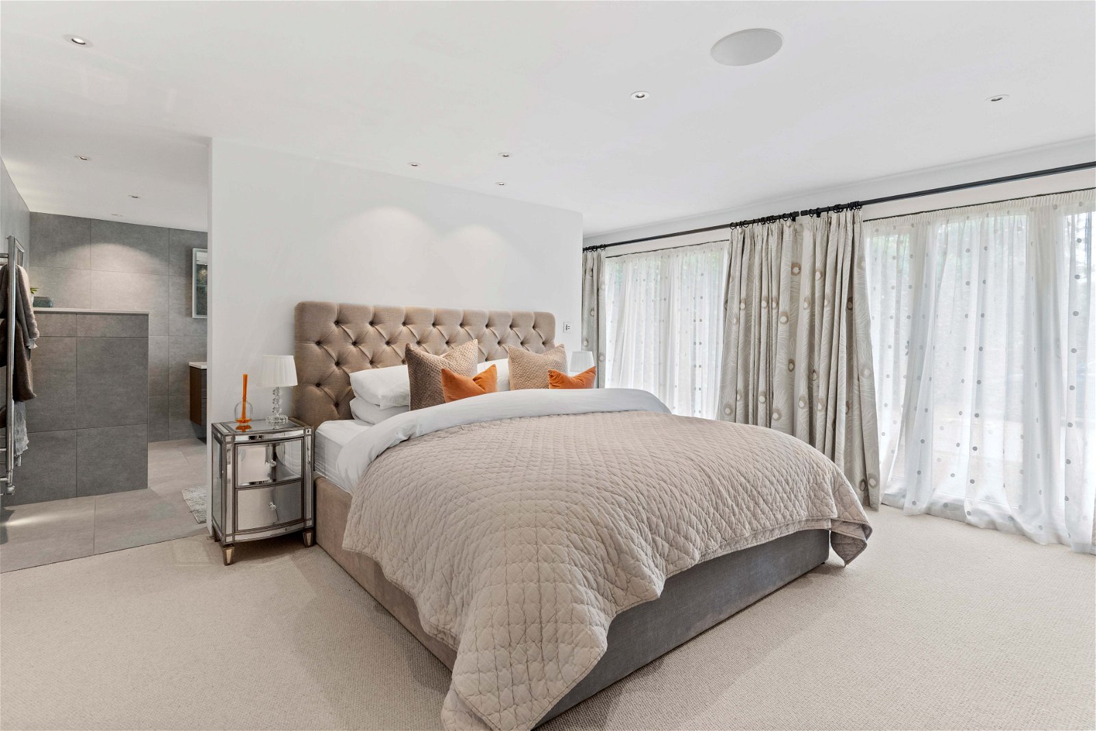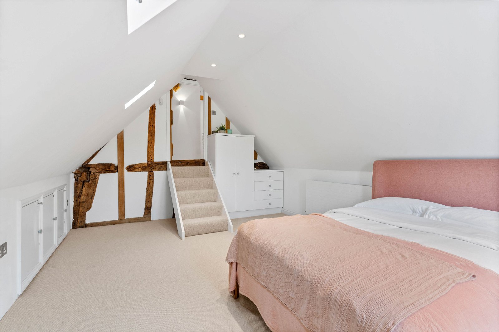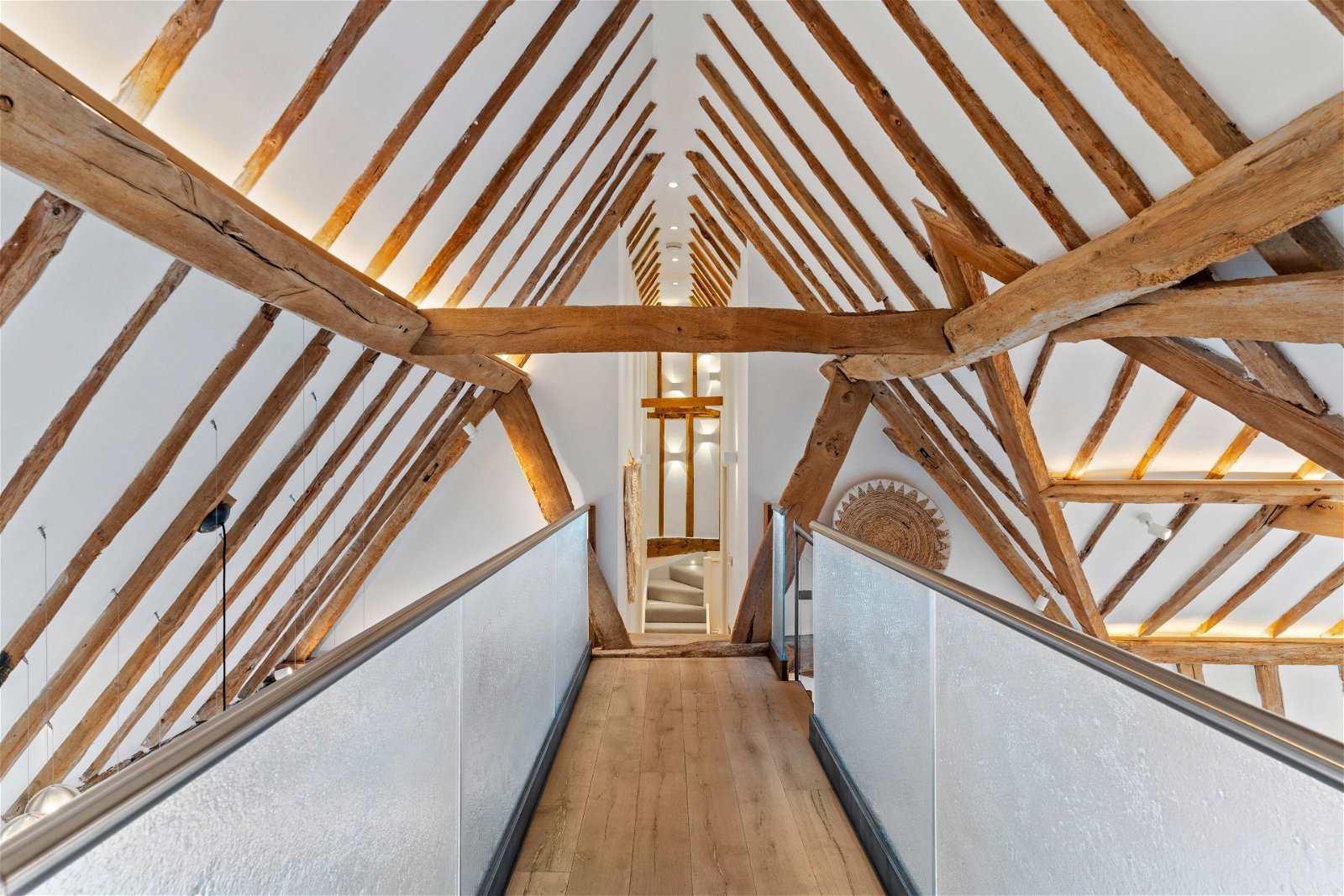 The custom built steel staircase rises up to the galleried glazed landing with bespoke Keizer glass panels with clever concealed lighting that add to the spectacular surroundings. On this floor one finds four further bedrooms and two family bathrooms. Throughout there are exposed timbers and, as found elsewhere in the house, lighting is cleverly used to great effect.