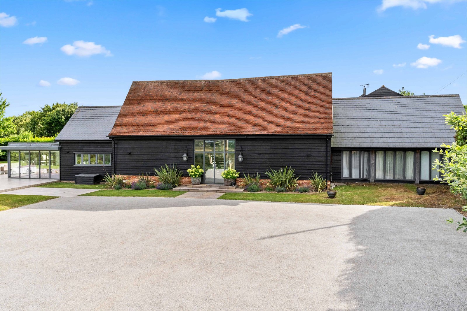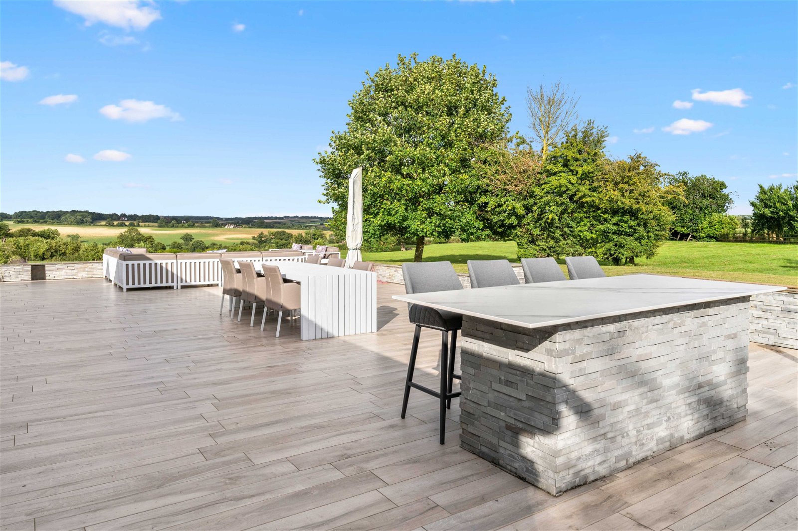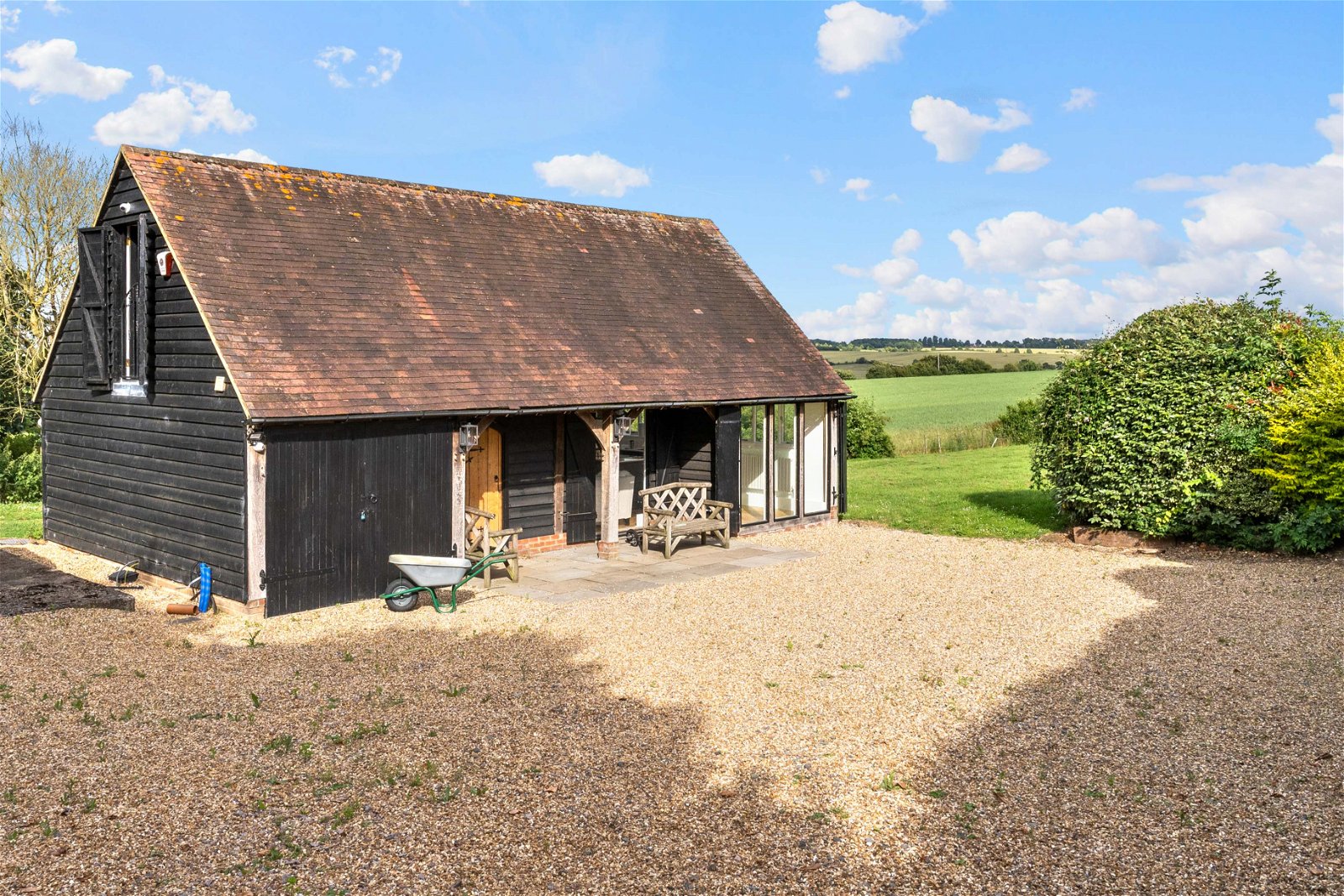 Whempstead Barn is approached off a small country lane through electric gates that lead into a rolled resin driveway that provides extensive parking for many vehicles. The grounds extend to approximately 2.30 acres and are mainly laid to lawn with shrubs and trees. Adjoining the house is a large south facing terrace from which one can really take in the amazing views over some of the areas most beautiful undulating countryside. The terrace is a wonderful place on which to entertain and enjoys an outside kitchen area with pizza oven.