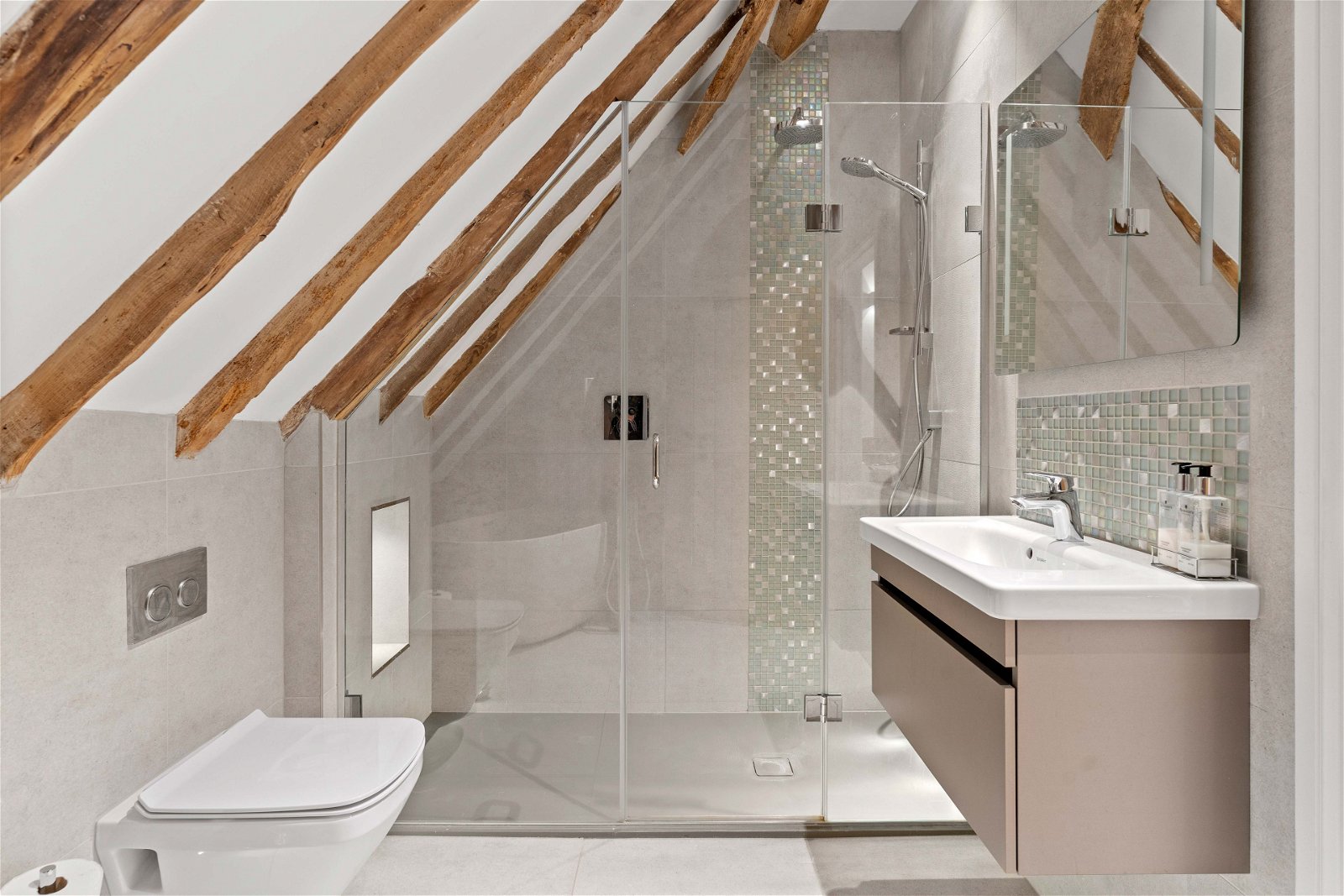 As soon as you walk inside the scale and character of the barn is displayed in front of you. The timber framework shows off the period features whilst the highly contemporary bespoke steel staircase, the glazed galleried landing, the huge glazed windows and doors, compliment and blend beautifully with the original features. The space and light on offer is spectacular. This is a truly impressive hallway with a 21' high vaulted ceiling. The flexibility of the accommodation is demonstrated here with the hallway being open plan to a lovely sitting area that has also previously been used as a dining area. In fact, there is ample space for both if one desired. Undoubtedly the Wow factor is the bespoke kitchen/family room that is truly impressive. A huge island and extensive range of units with under lit worktops, pop up extractor and high end integrated appliances are a dream. The kitchen extends into the dining/family area with bi fold glazed doors to one whole corner of the room taking in the fabulous views on offer and opening onto the huge south facing garden terrace. Open plan to this room is the main sitting room with exposed red brick wall, exposed timbers and one wall with glazed full height windows and French doors opening onto the large secluded courtyard at the rear. Also found at the very rear of the house is the good size office/study. In addition there is, off the kitchen, a utility room and a cloakroom. On the other side of the house one finds a sumptuous master bedroom suite. Well appointed with an excellent range of wardrobes and a truly luxurious en suite bathroom fitted with a contemporary suite with freestanding bath, huge walk through shower, wc and twin basins. There is also a further double bedroom and en suite shower room on the ground floor.