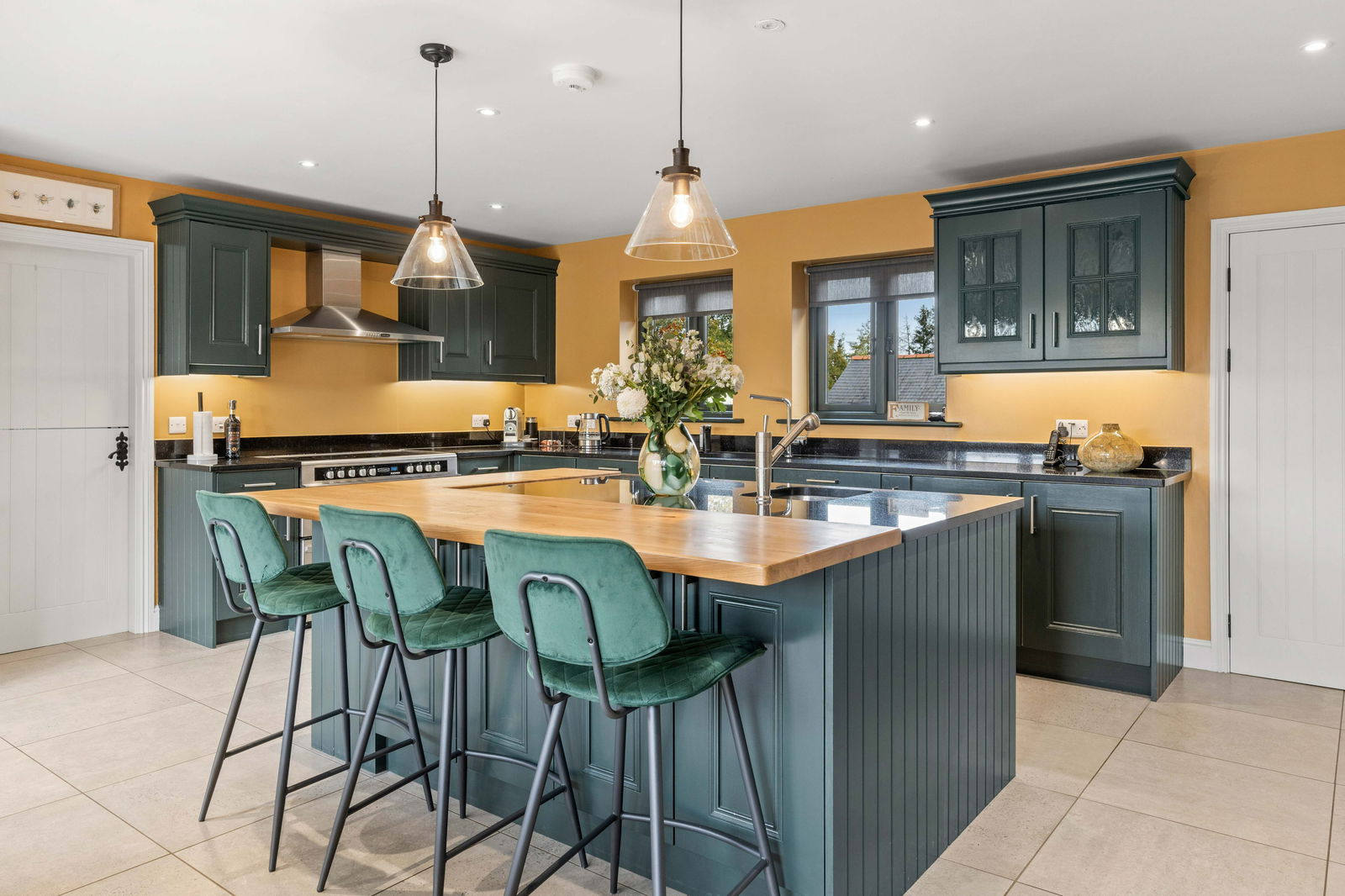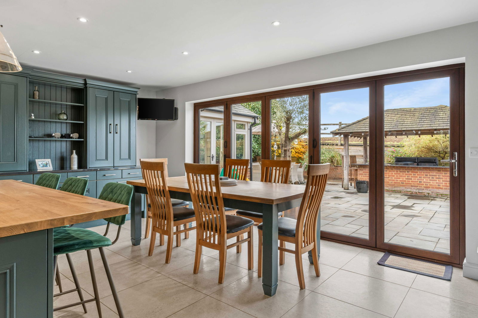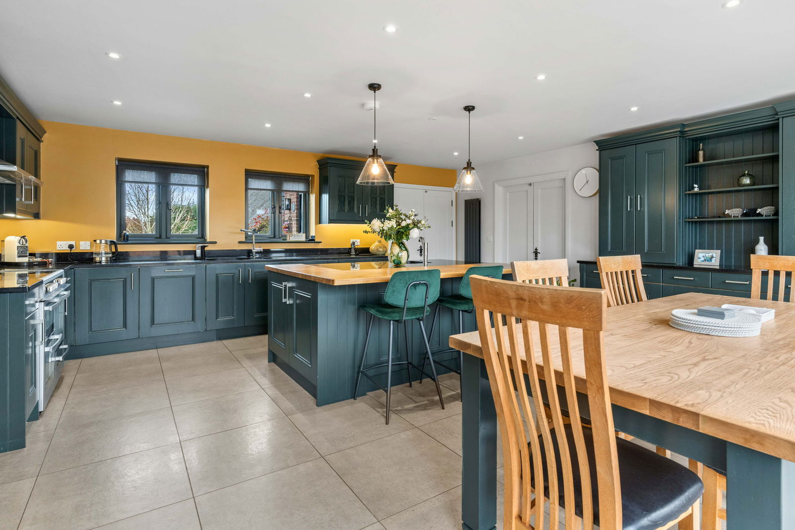 The kitchen dining room is the heart of the home, spacious and recently redecorated with a feature island and plenty of space to sit as a family at the breakfast bar or formal dining with bi folding doors leading out to the patio area, pool and BBQ area. The kitchen flows nicely to the utility room, cloakroom and lobby where the oil boiler is housed with door leading to the garden. Leading on from the utility room is a gym, you do not even need to leave the house in the morning and can open the double French doors and enjoy the views of the countryside to the rear.