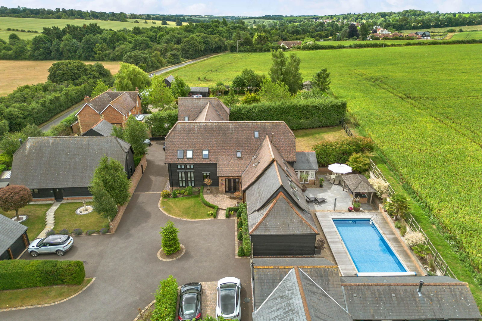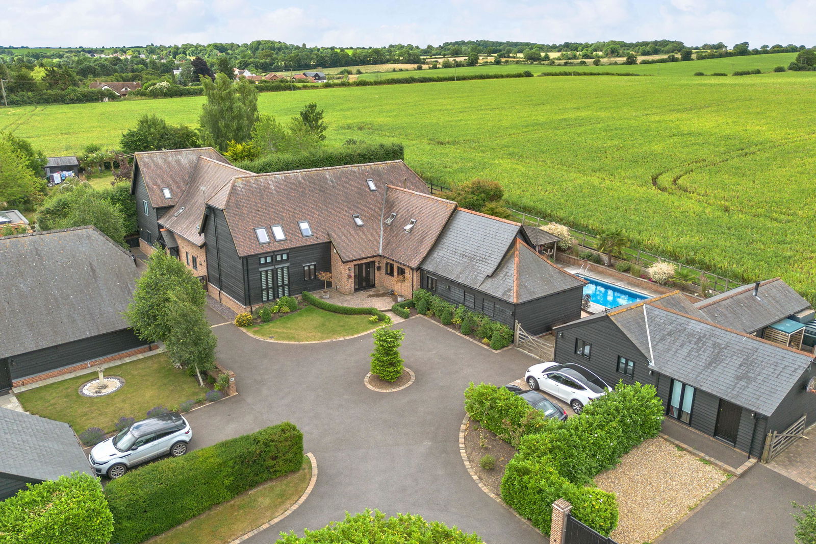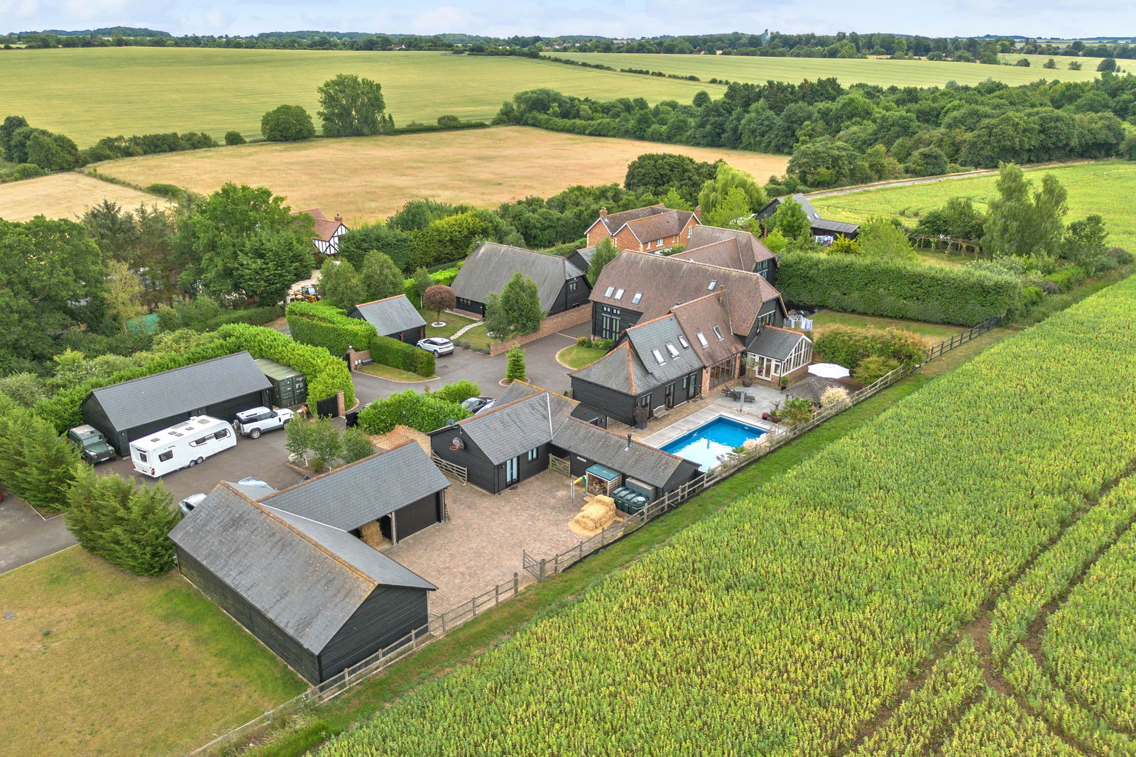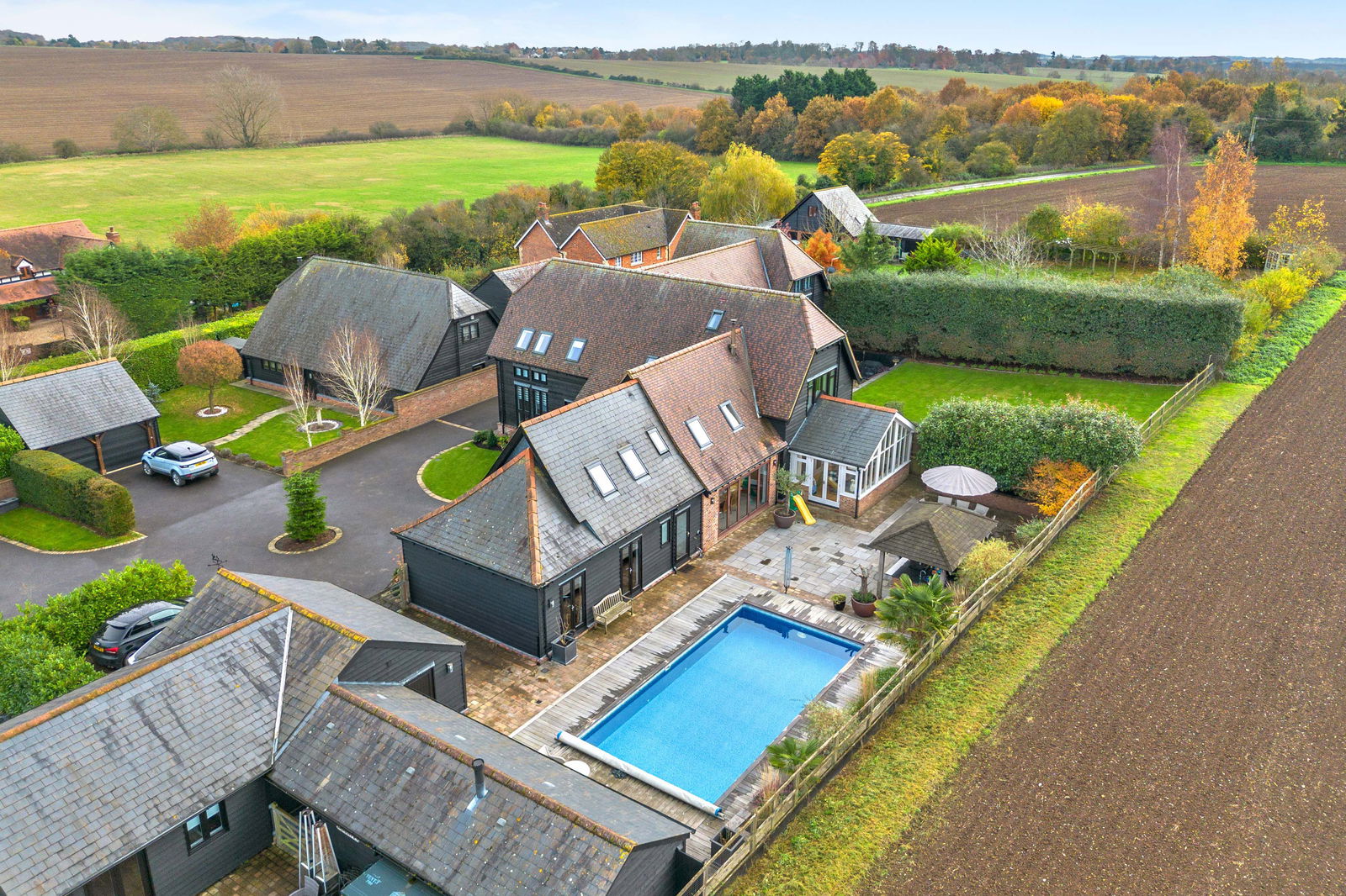 A stunning Six-bedroom barn style property built in 2009 and set within a gated development of three properties. Situated in Hare Street, Buntingford and backing onto farmland. This family home has been built in mind for multi-generational living with a self-contained annex and many outbuildings, golf studio and garages that can easily be converted subject to planning permission. There is plenty of parking for a large family, a gym and swimming pool. There is approximately 6568 sq. Ft of floor area including the garages and set within approximately 1.4 acres. There is oil heating, a shared sewerage plant system, EPC band D, council tax band G and no onward chain.