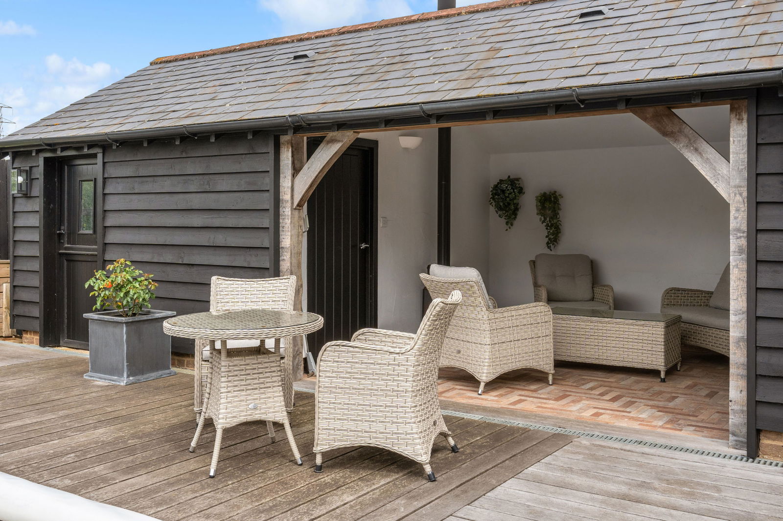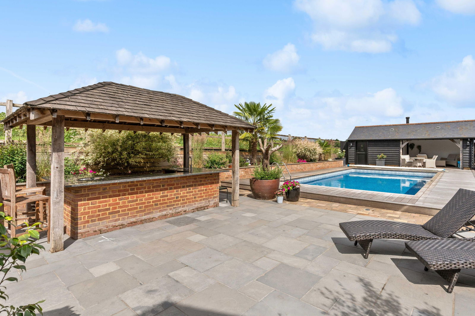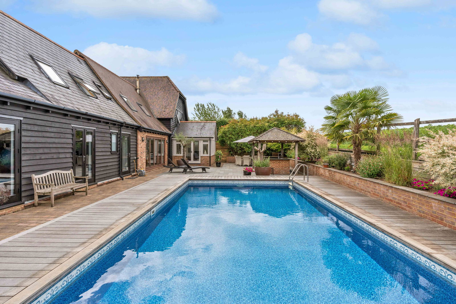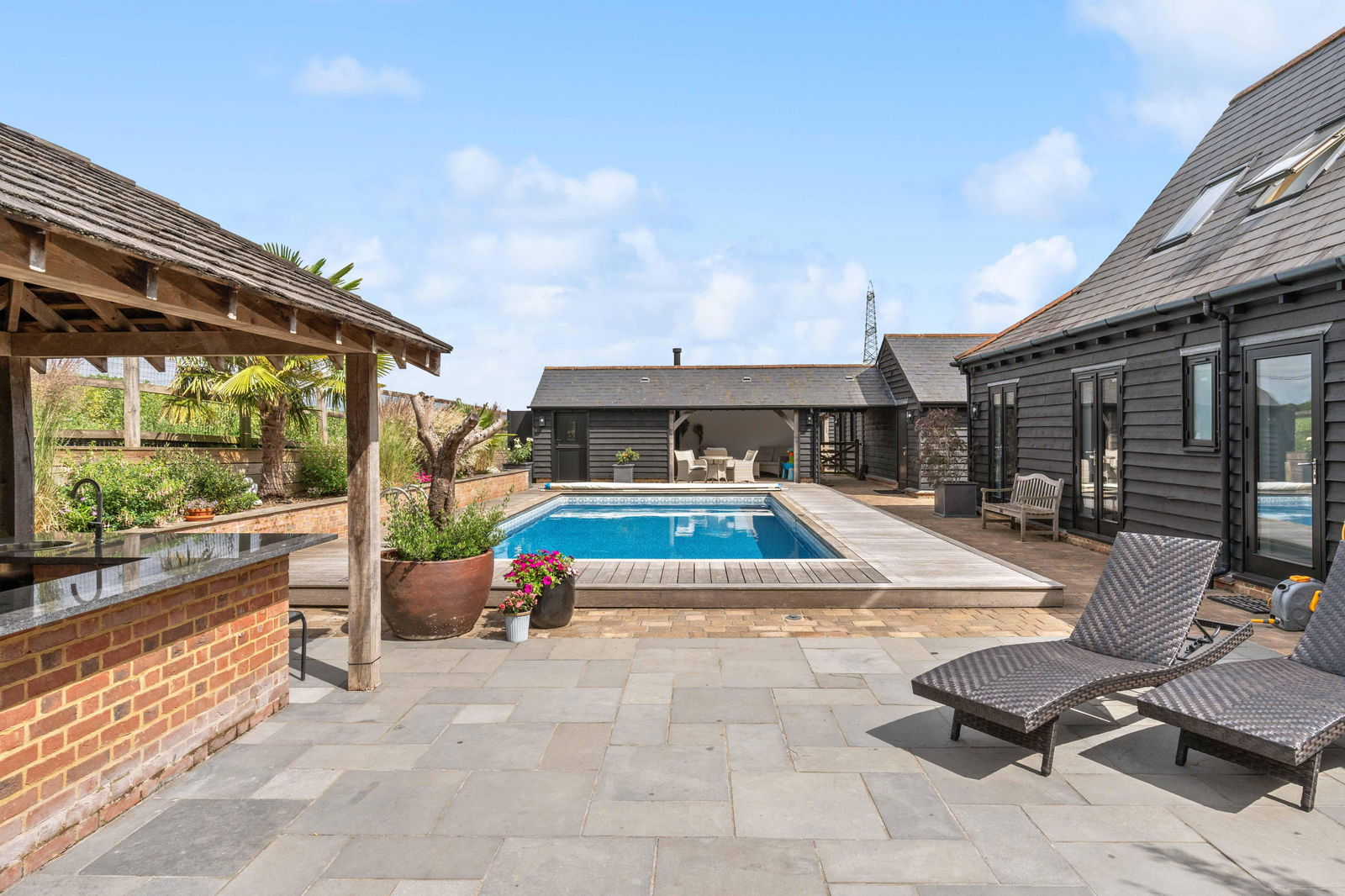 A stunning Six-bedroom barn style property built in 2009 and set within a gated development of three properties. Situated in Hare Street, Buntingford and backing onto farmland. This family home has been built in mind for multi-generational living with a self-contained annex and many outbuildings, golf studio and garages that can easily be converted subject to planning permission. There is plenty of parking for a large family, a gym and swimming pool. There is approximately 6568 sq. Ft of floor area including the garages and set within approximately 1.4 acres. There is oil heating, a shared sewerage plant system, EPC band D, council tax band G and no onward chain.