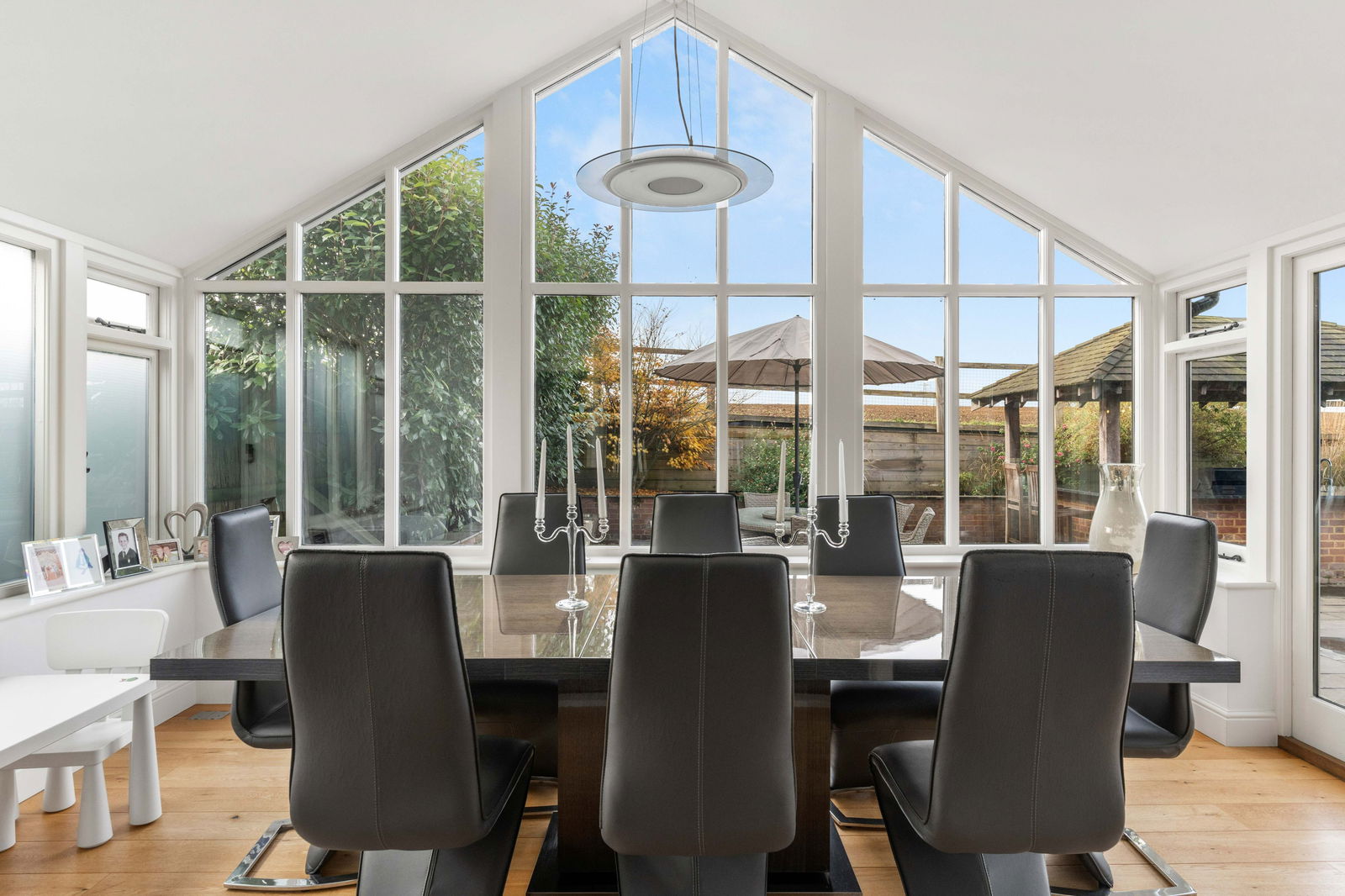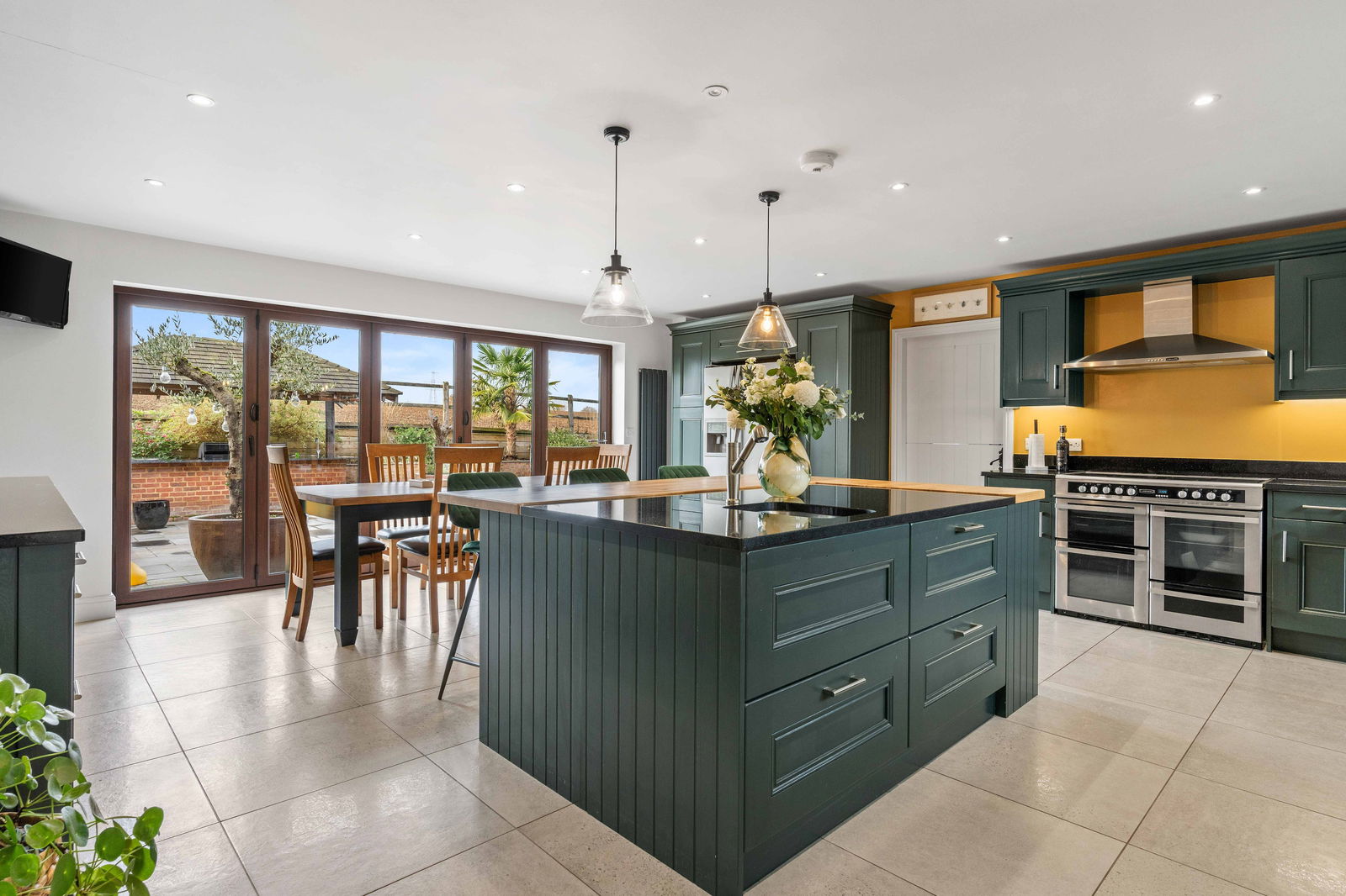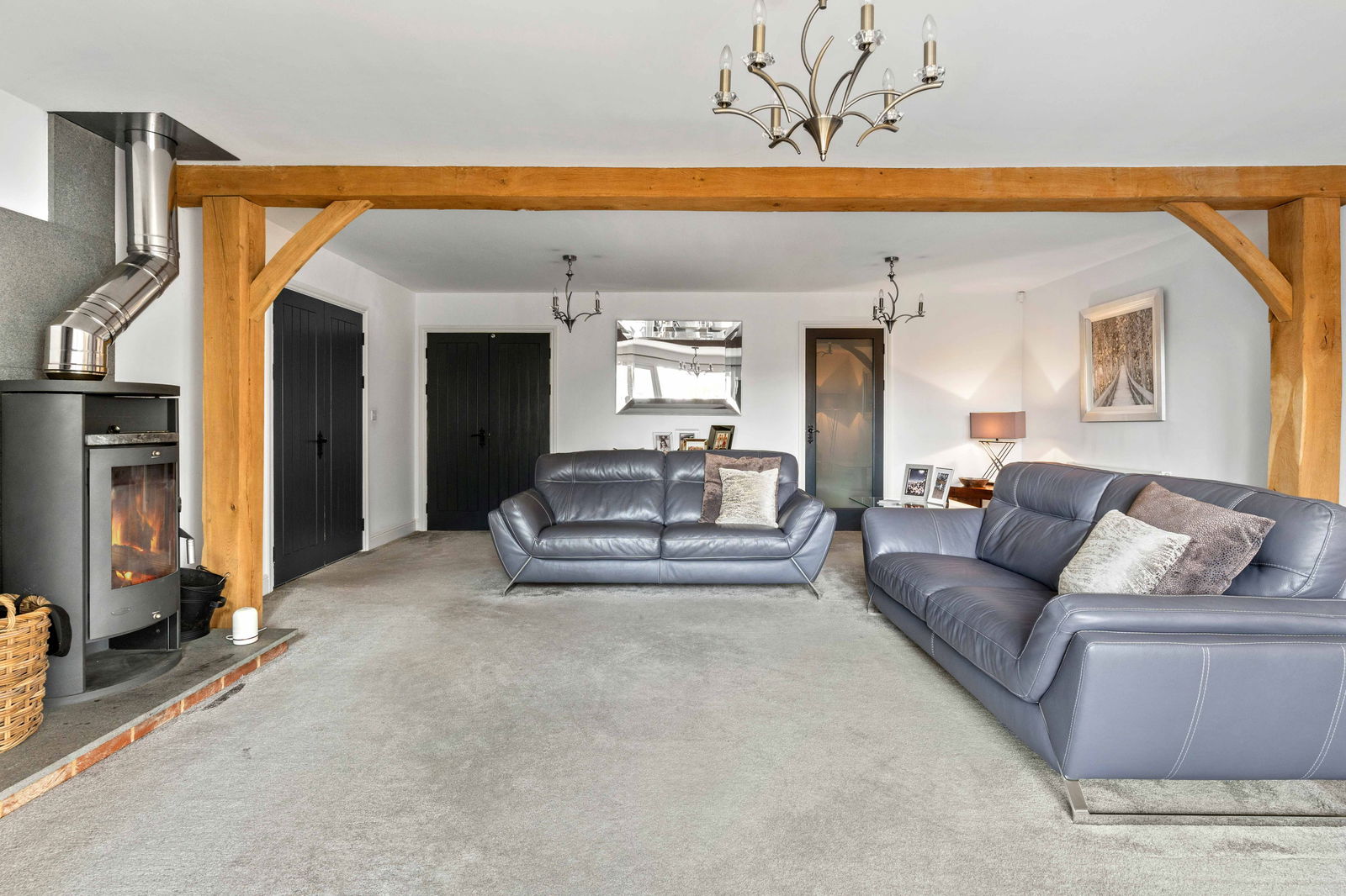 Entering the property into a light and spacious hallway with a cosy sitting room to the left, ideal for a quiet space to relax, watch the television or even use as a playroom for the children. To the right there are double doors leading you into the main family living room, a spacious room with wood burning stove and exposed beams, a study just off the living room and double doors leading you in a conservatory which is a light and great space for entertaining. This could be a relaxing room to sit and overlook the children playing in the pool or use as a formal dining area for when guests visit.