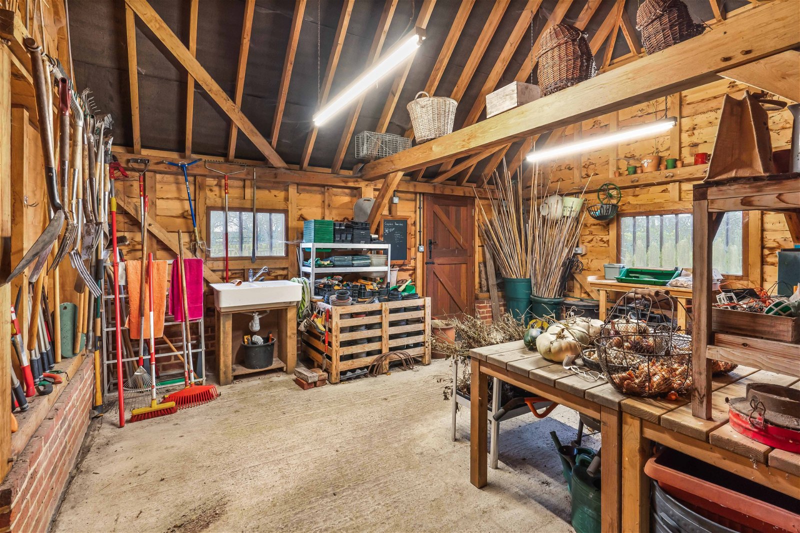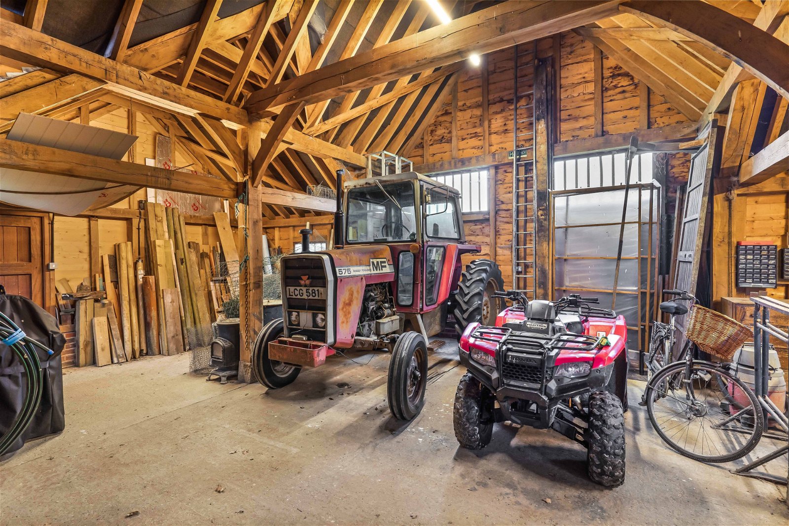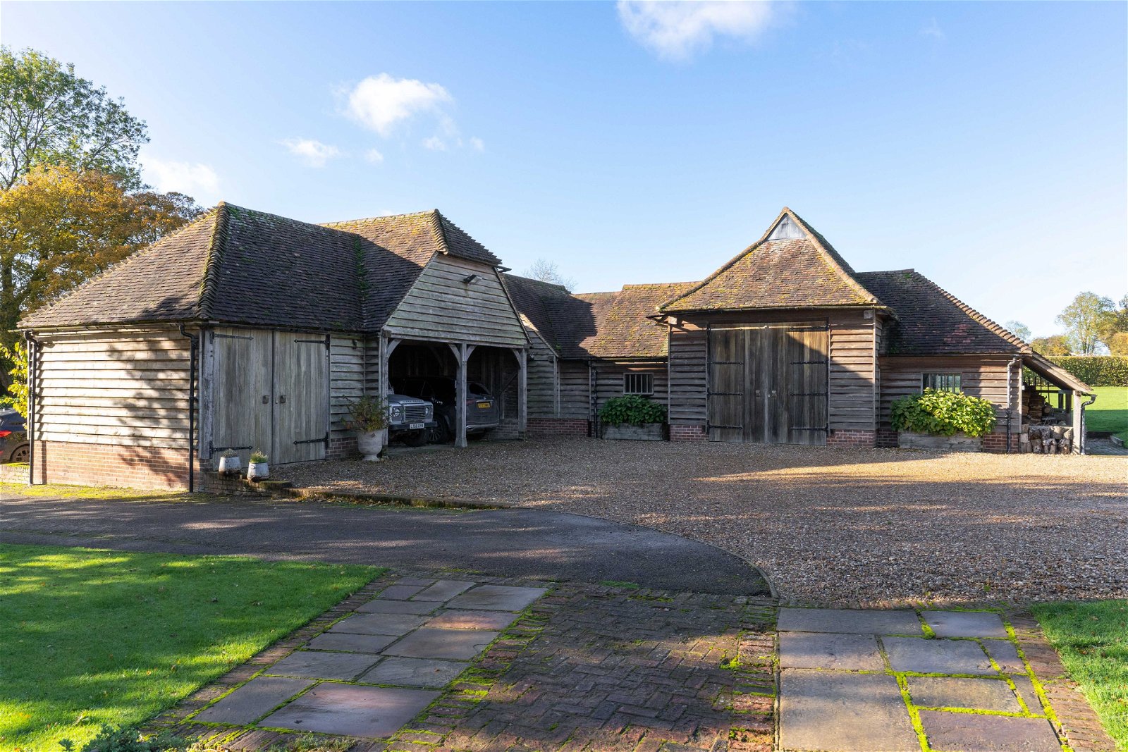 As you arrive, the driveway is neat, well-kept and flows perfectly to where one parks in front of the high barn and absorb this hidden gem. The farmhouse is positioned centrally within around 3.5 acres of formal gardens which are beautifully cared for, mature, private and a reflection of the owners passion for their home. There is a heated outdoor pool with summer/pool house with excellent views of the neighbouring fields and paddocks. For the equestrian enthusiast there are four stables and a tack room and a further 11 acres of paddocks with a menage. In addition there is a natural pond/lake. Independent of the house there is the main barn, the high barn and the agricultural barn, all of which have been nurtured and cared for by the owners. The main barn is substantial in size and lends itself perfectly to multi-generational living. The high barn is of timber frame construction and offers a double car port, masses of storage and an excellent workshop.