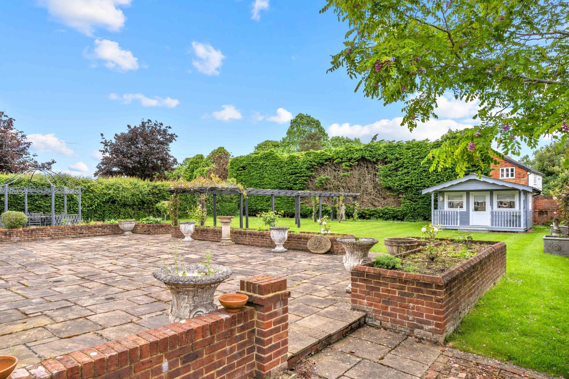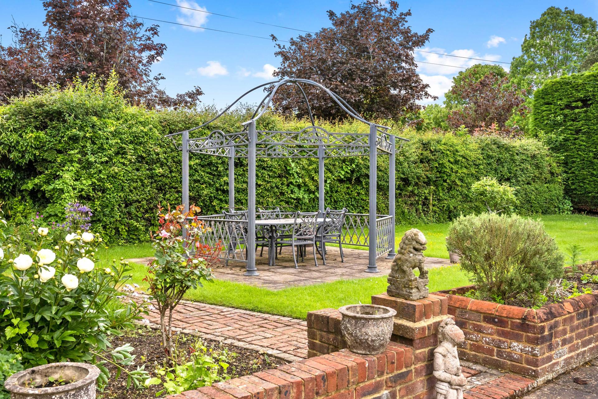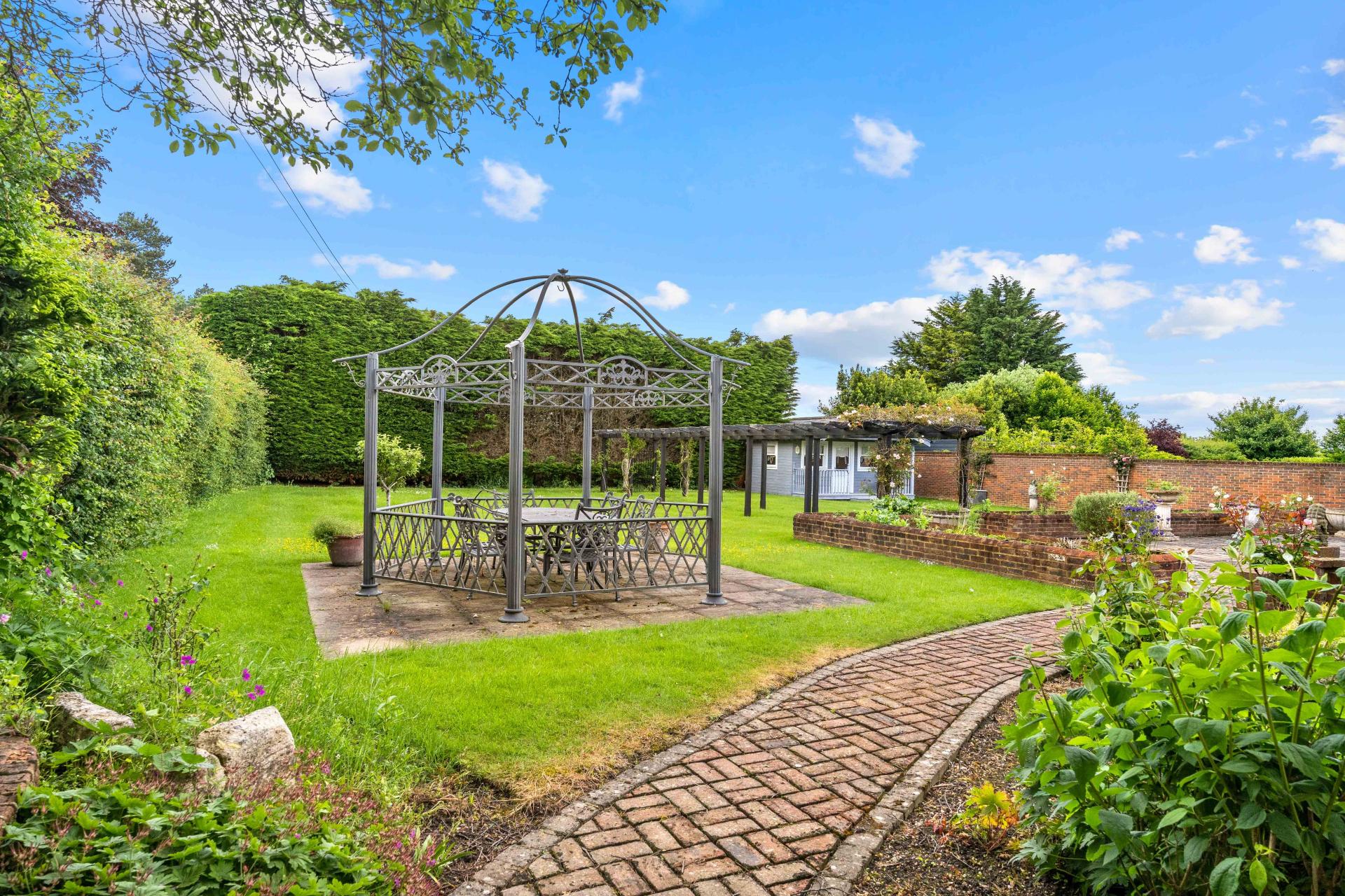 A gate through a red brick wall at the side of the house leads into the good size rear garden. There is an extensive patio to the rear of the house that is enclosed by low walls and raised beds. Beyond this, pathways lead through the garden and lawn to a further patio, a pergola and a large summerhouse. The garden is enclosed to one side by a high red brick wall with natural hedges providing excellent screening to the other boundaries.
