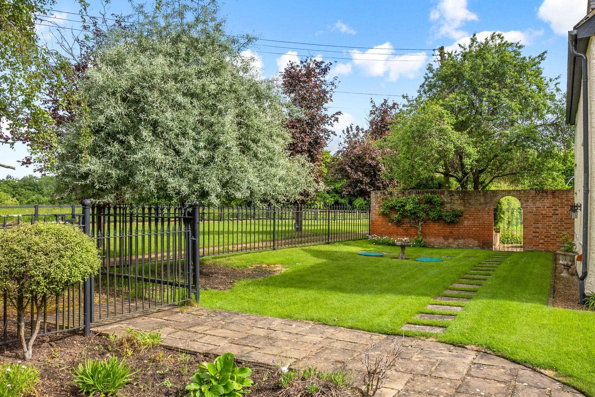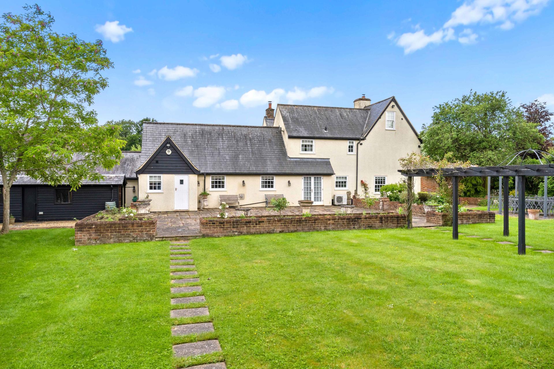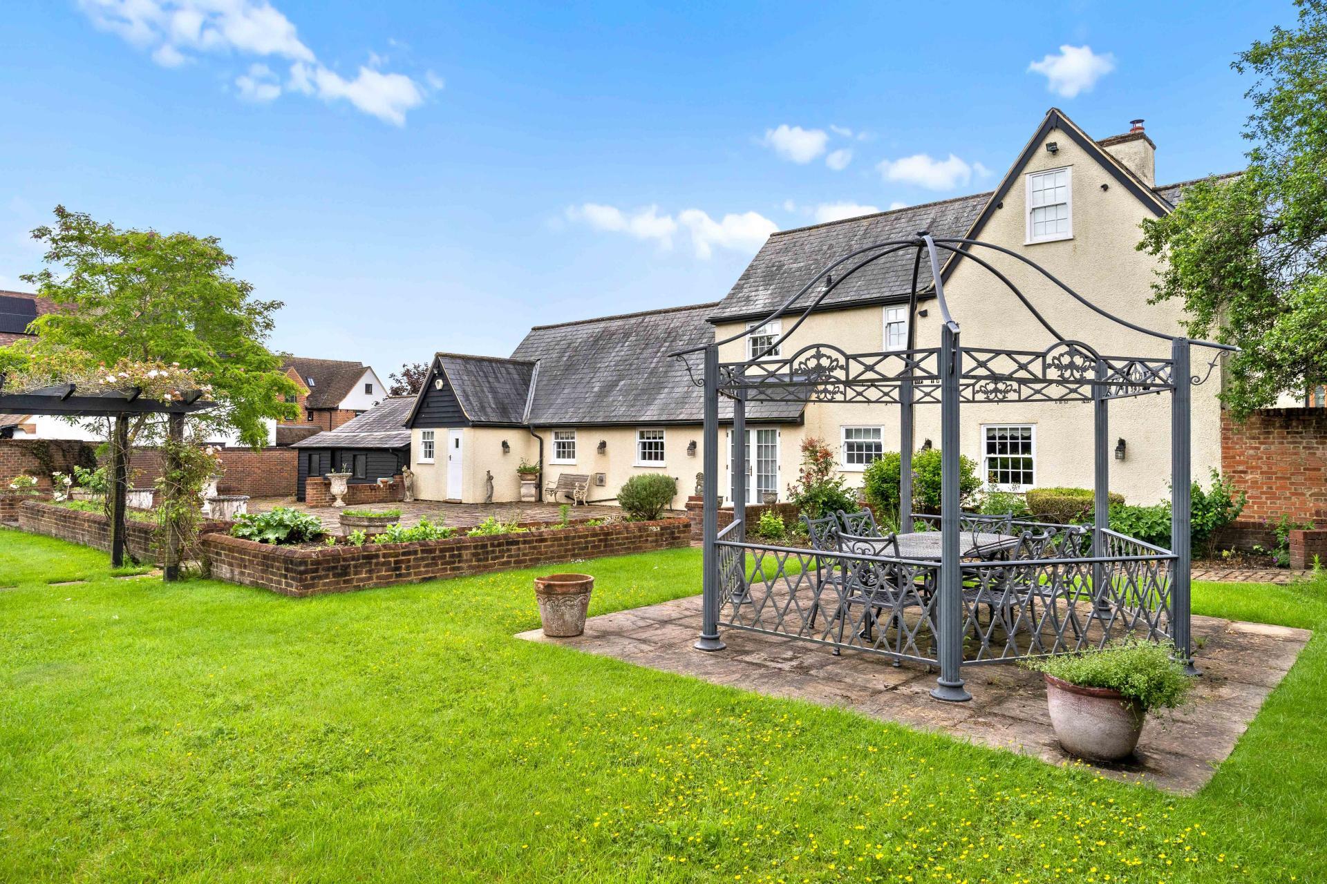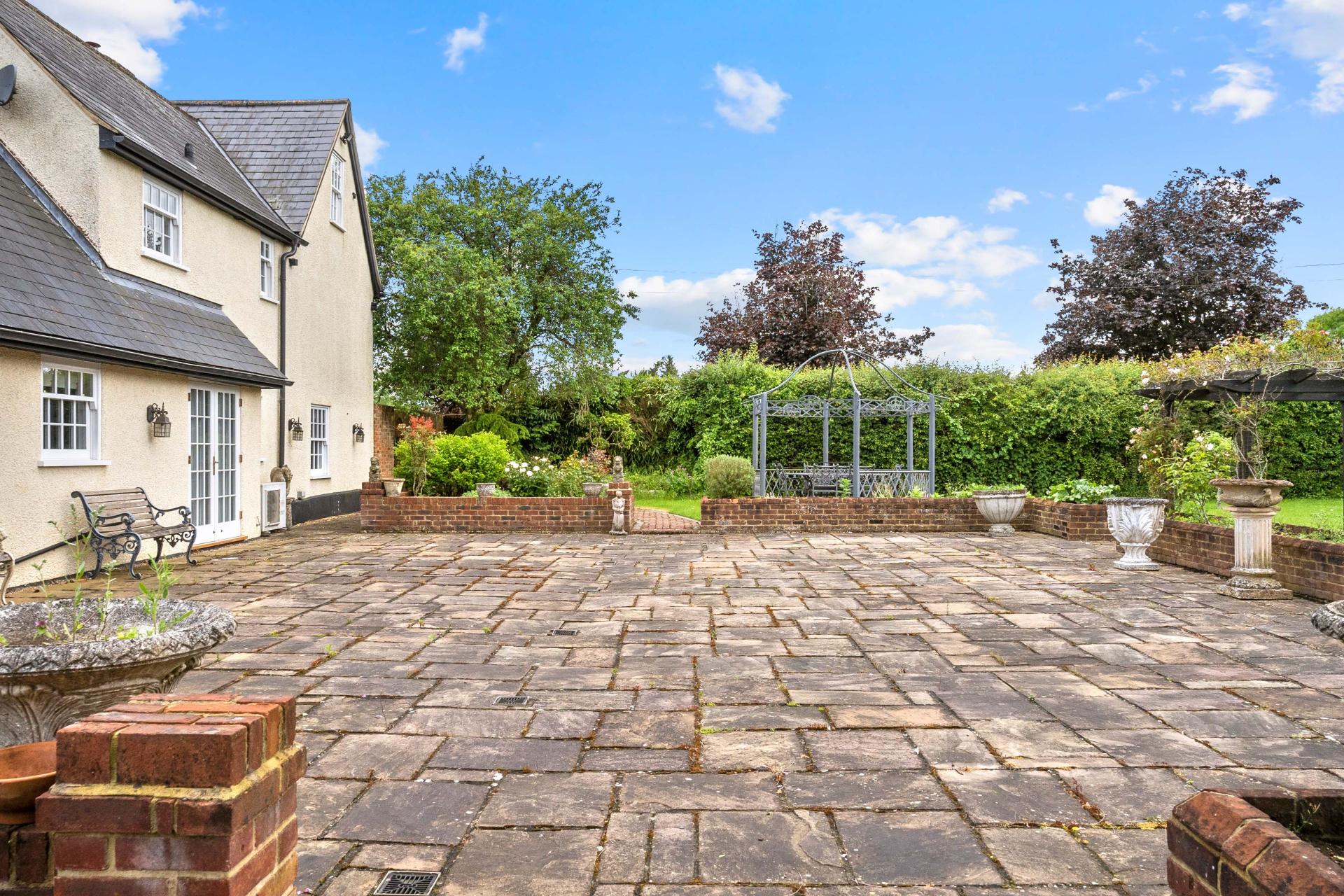 A gate through a red brick wall at the side of the house leads into the good size rear garden. There is an extensive patio to the rear of the house that is enclosed by low walls and raised beds. Beyond this, pathways lead through the garden and lawn to a further patio, a pergola and a large summerhouse. The garden is enclosed to one side by a high red brick wall with natural hedges providing excellent screening to the other boundaries.