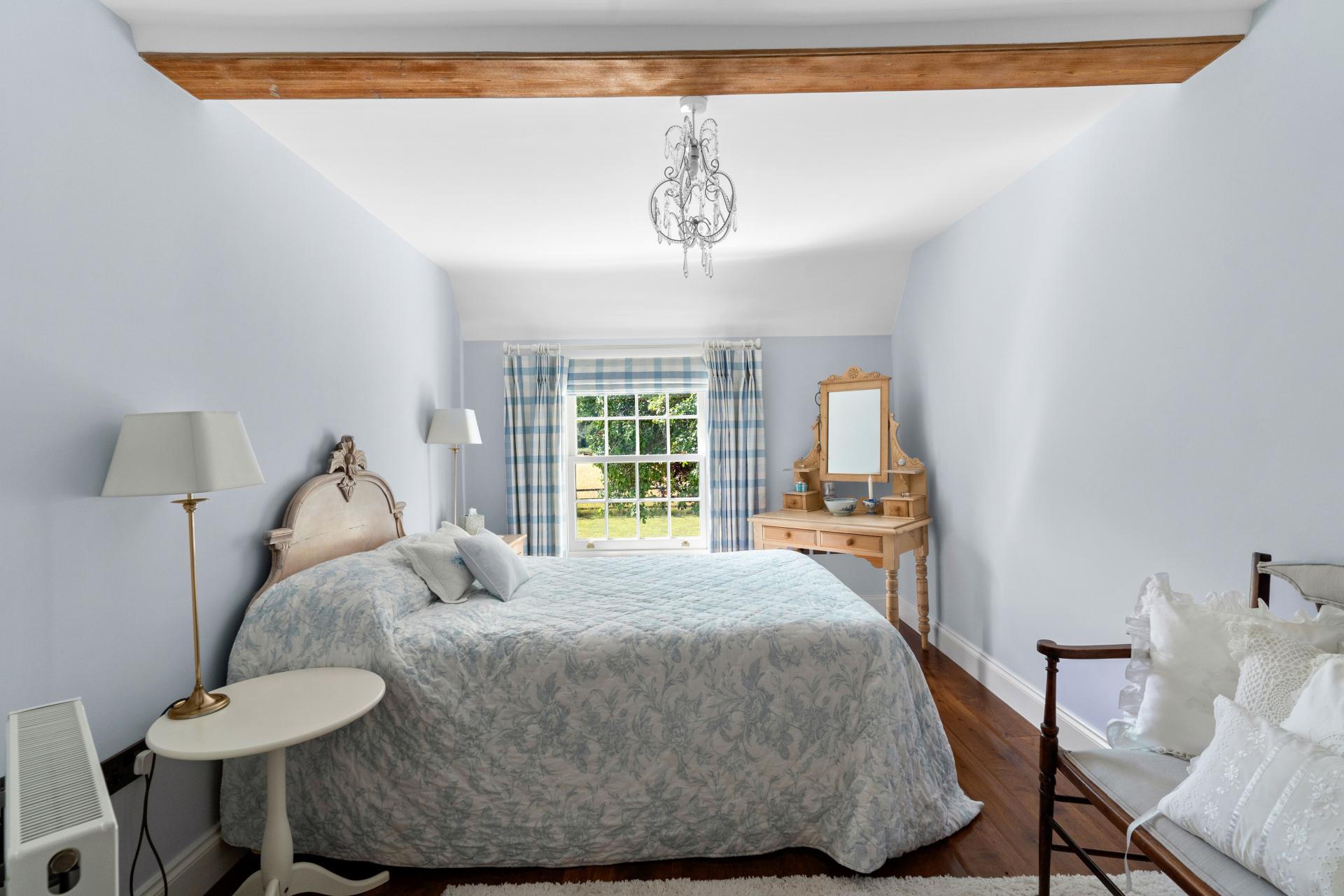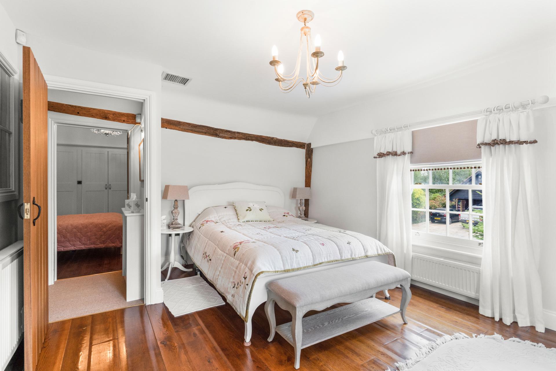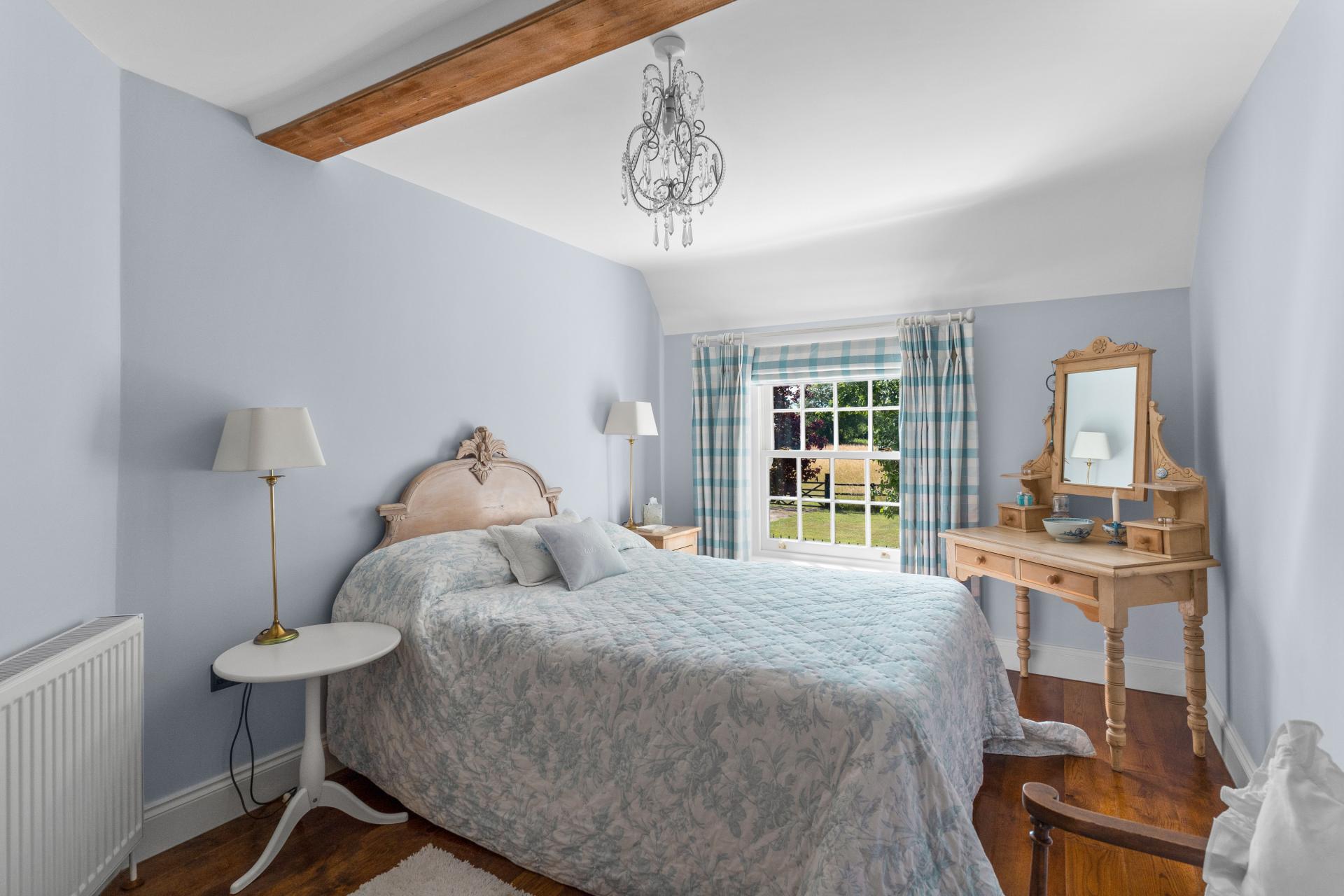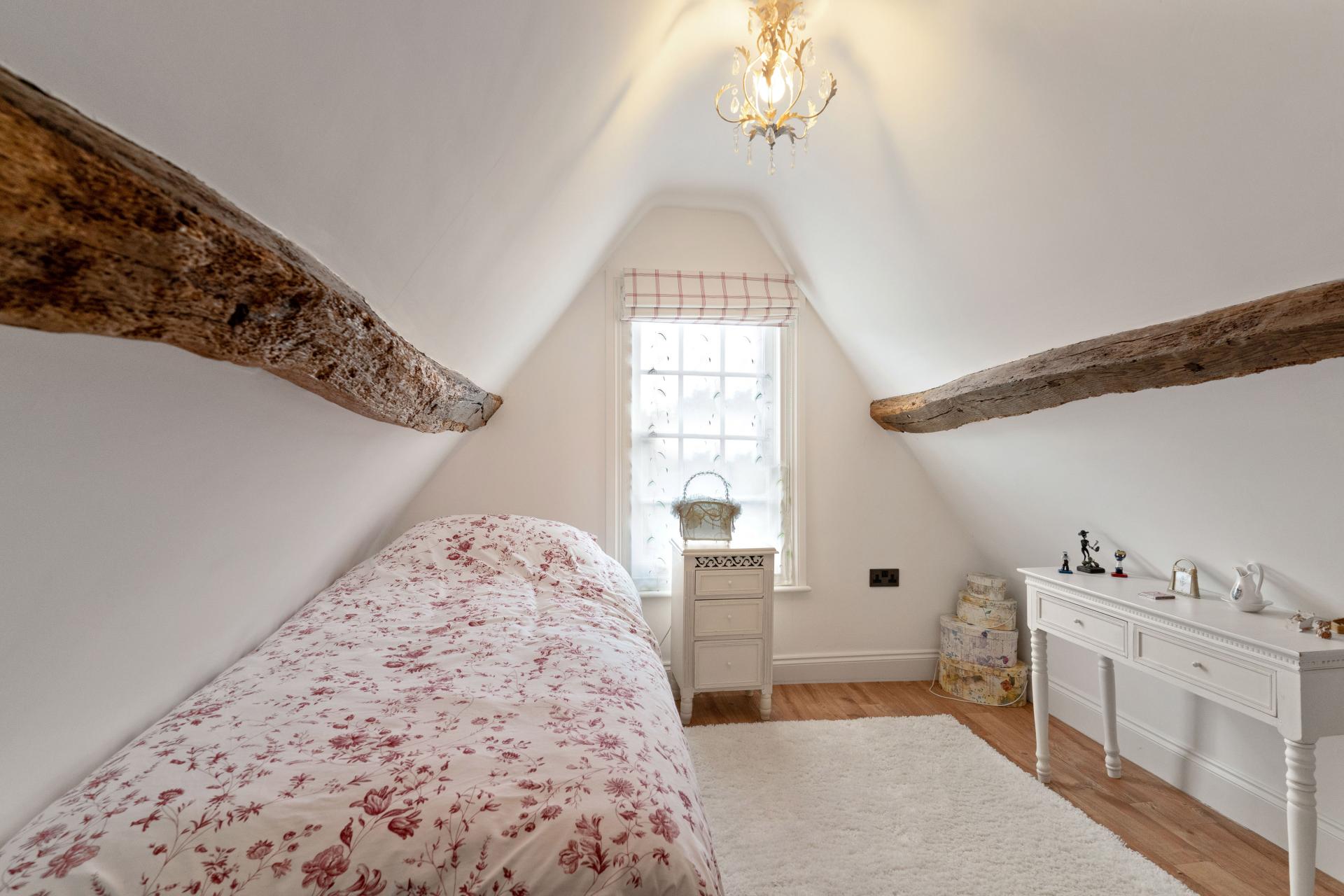 Upstairs, on the first floor there are three double bedrooms and a family bathroom. the principal bedroom enjoys an en suite and fitted wardrobes. The guest/ 2nd bedroom also benefits from fitted wardrobes and is double aspect with views over the paddocks and countryside.. On the top/attic floor are two further bedrooms and a separate wash room/WC, that are built into the eaves. Ideal teenagers rooms.