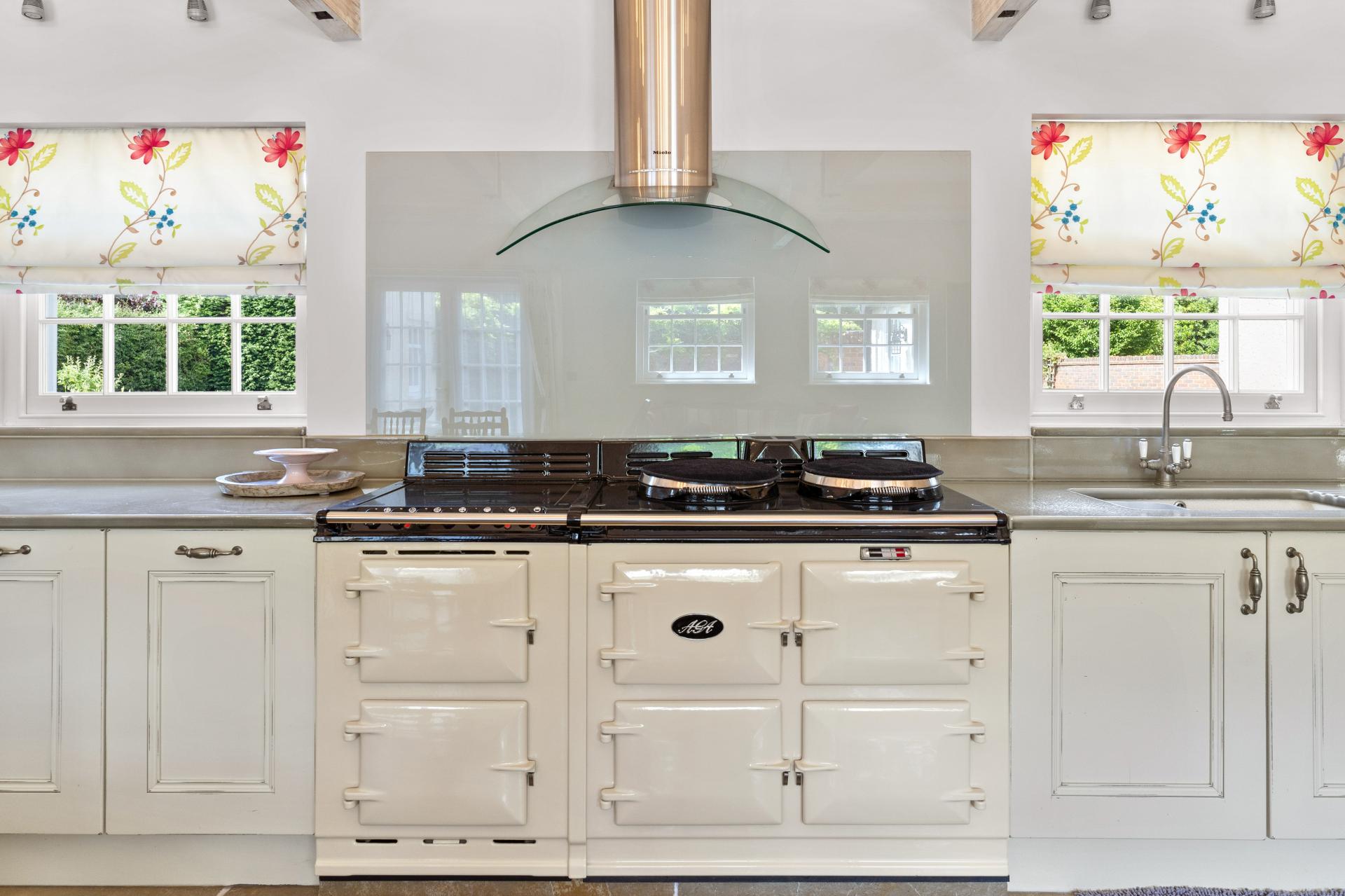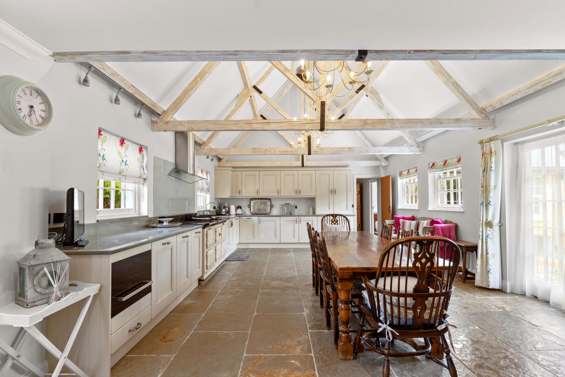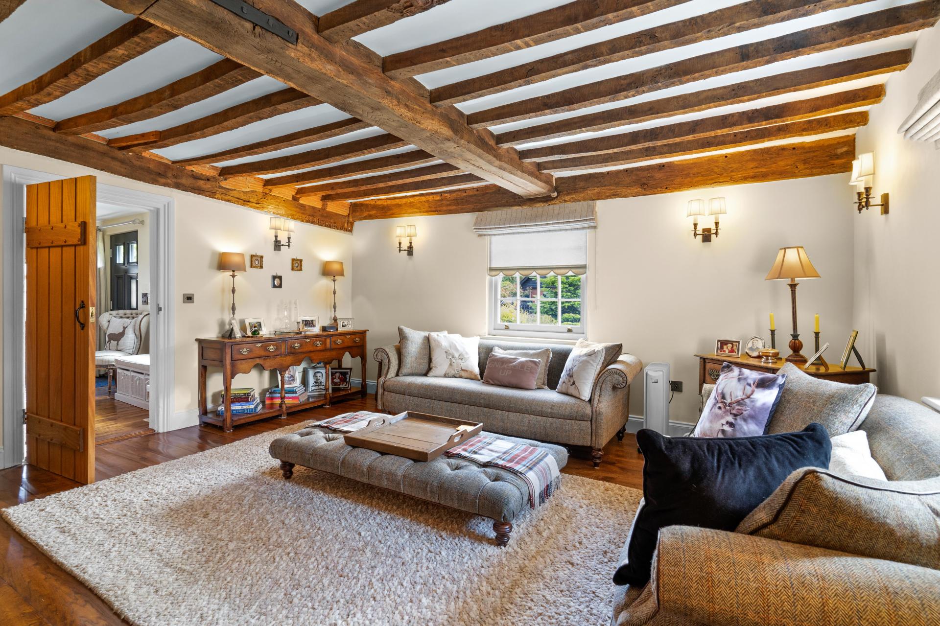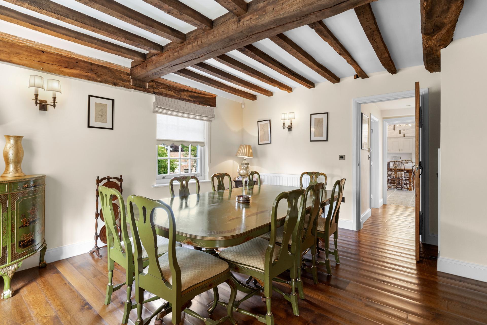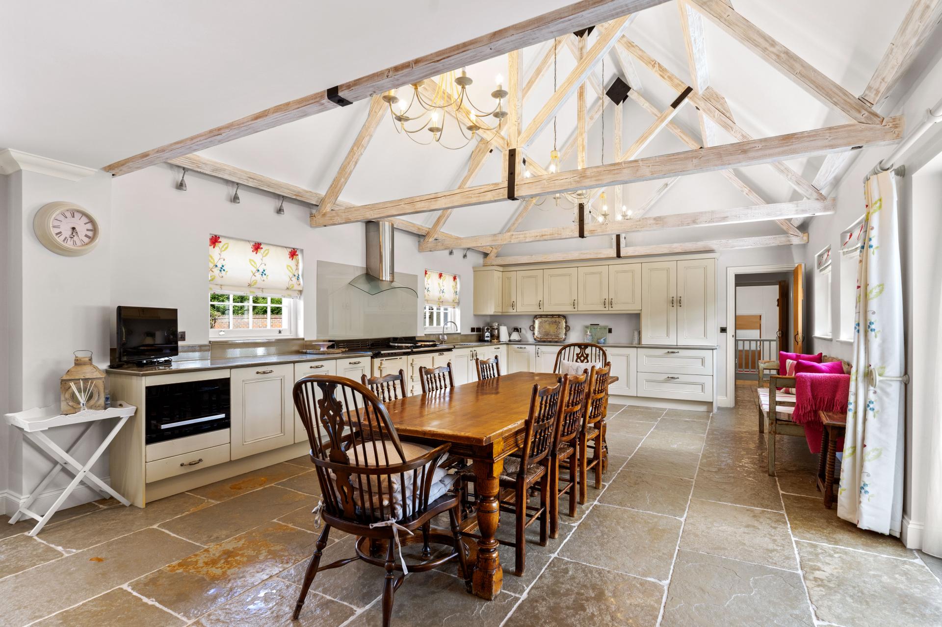 As soon as you step over the threshold you are welcomed by a large hallway with red brick fireplace with adjacent bread oven, polished Oak flooring and a feeling of space. Stairs rise up to the first floor and there are doors off to the principal reception rooms and kitchen. The lounge and the dining room are in the older part of the house with lovely beamed ceilings and each with a red brick fireplace and chimney breast. The ceiling heights are very good and both rooms are lovely and light with windows to two aspects. Across the hallway is the hub of this lovely home, the most impressive kitchen/breakfast room. This is a kitchen on a grand scale. Beautifully fitted with an most extensive range of units with granite worktops, integrated appliances and an AGA range. The high vaulted ceiling, windows and doors to both the front and rear aspects and flagstone flooring really sets the room off. The perfect setting for entertaining all your family and friends. From the kitchen a door opens into an inner hallway. From here onward could form a self contained annexe if desired. Presently there is a useful utility room and an attractively fitted shower room. There is garden room that opens onto a pretty private courtyard. There is a good size second kitchen/breakfast room and doors open into a large living/family room.