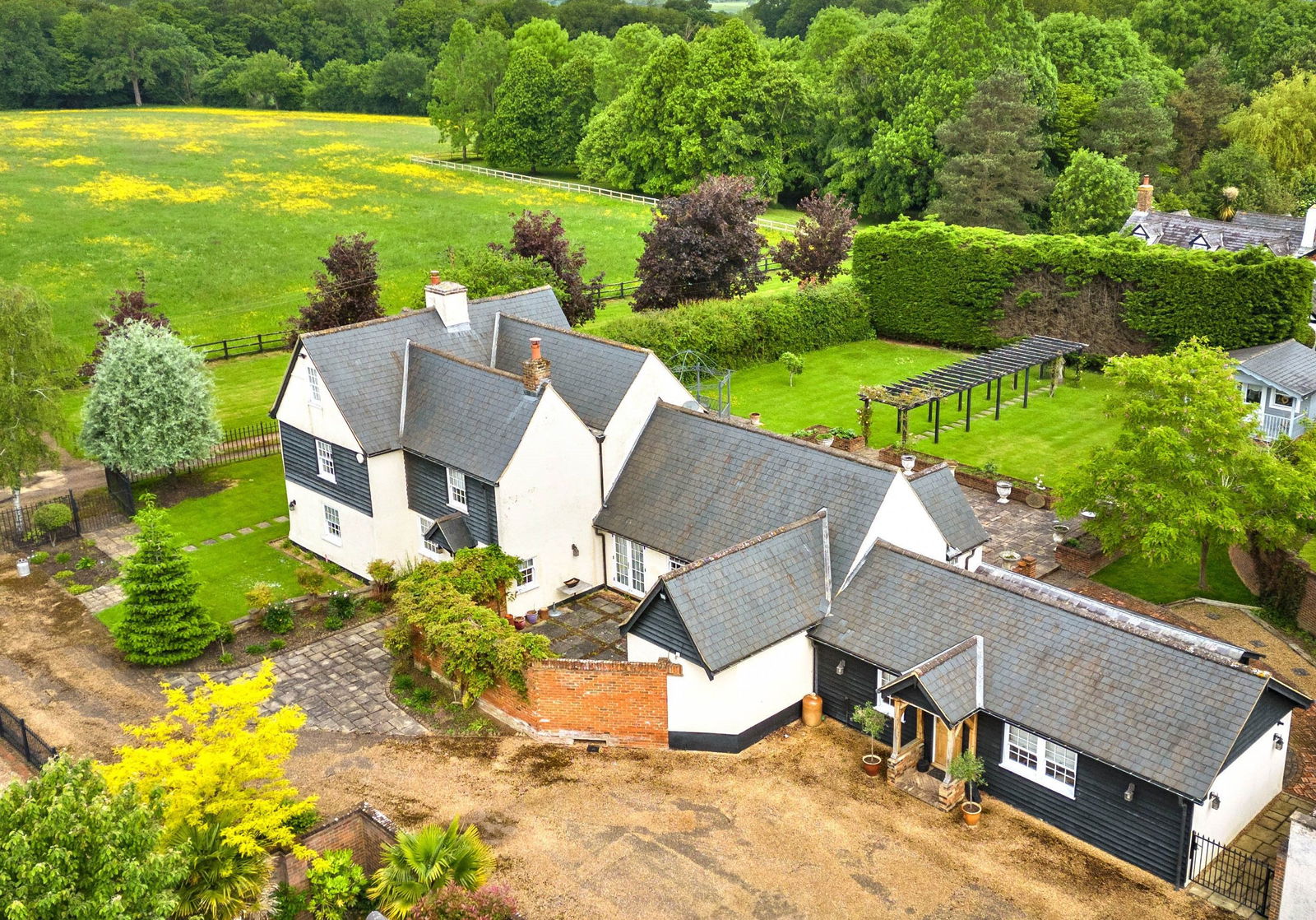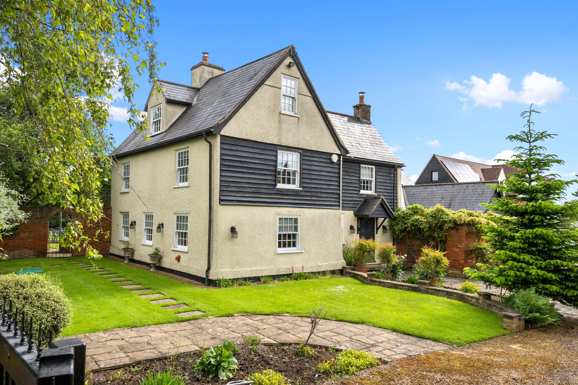 Potters Hall is approached through iron gates that lead into an extensive driveway and to the four garages. The front garden is attractively landscaped and laid to lawn with attractive borders, shrubs and climbers.