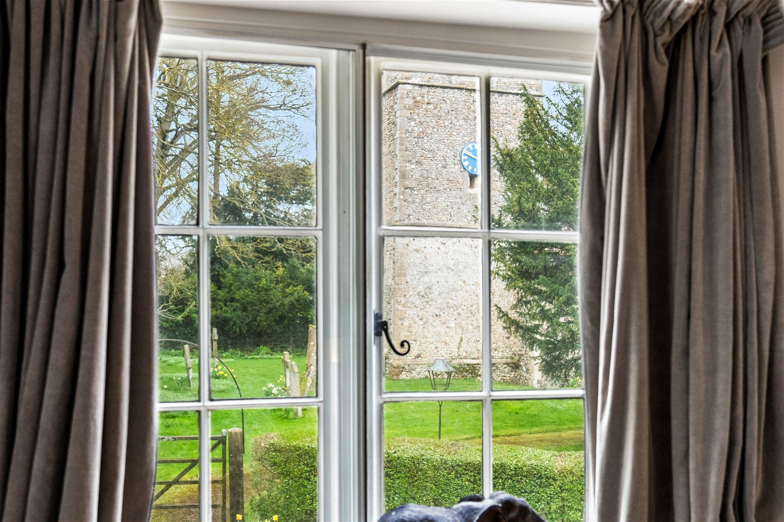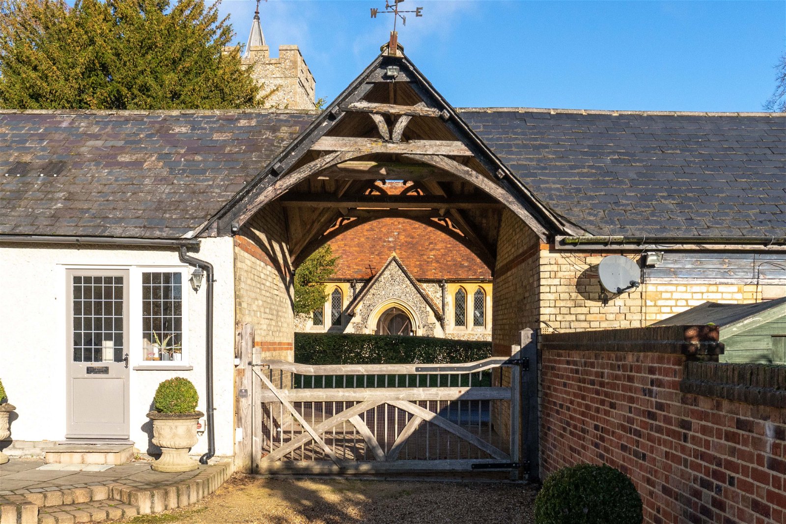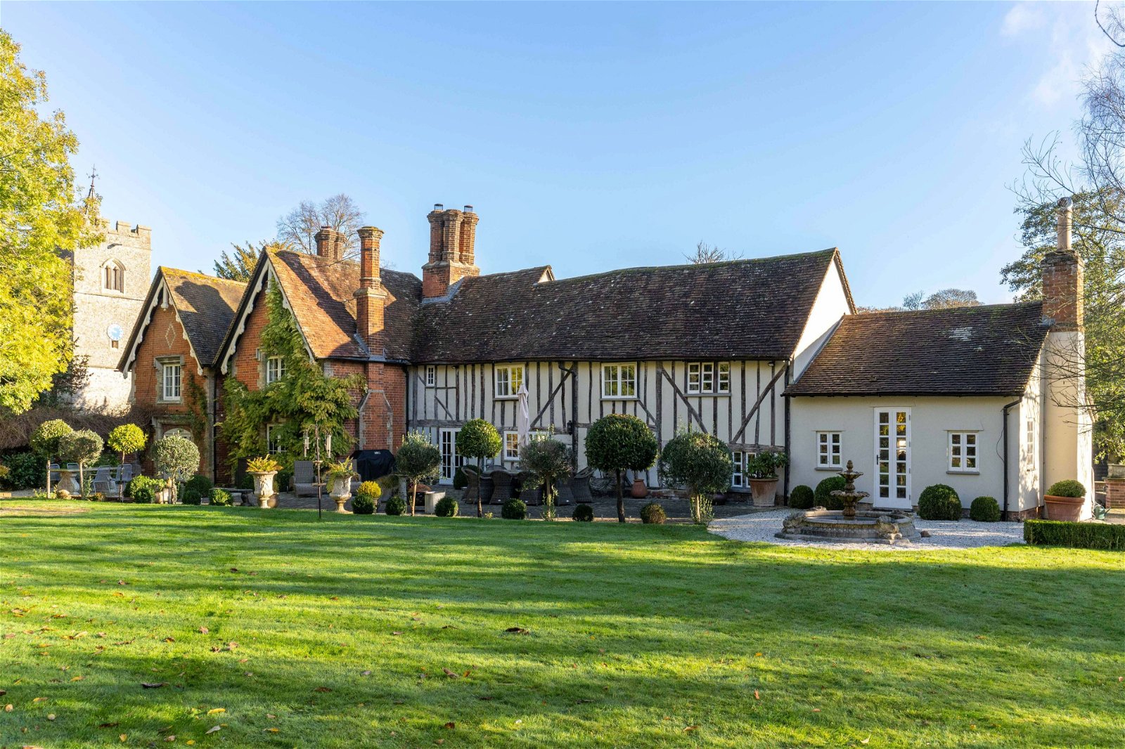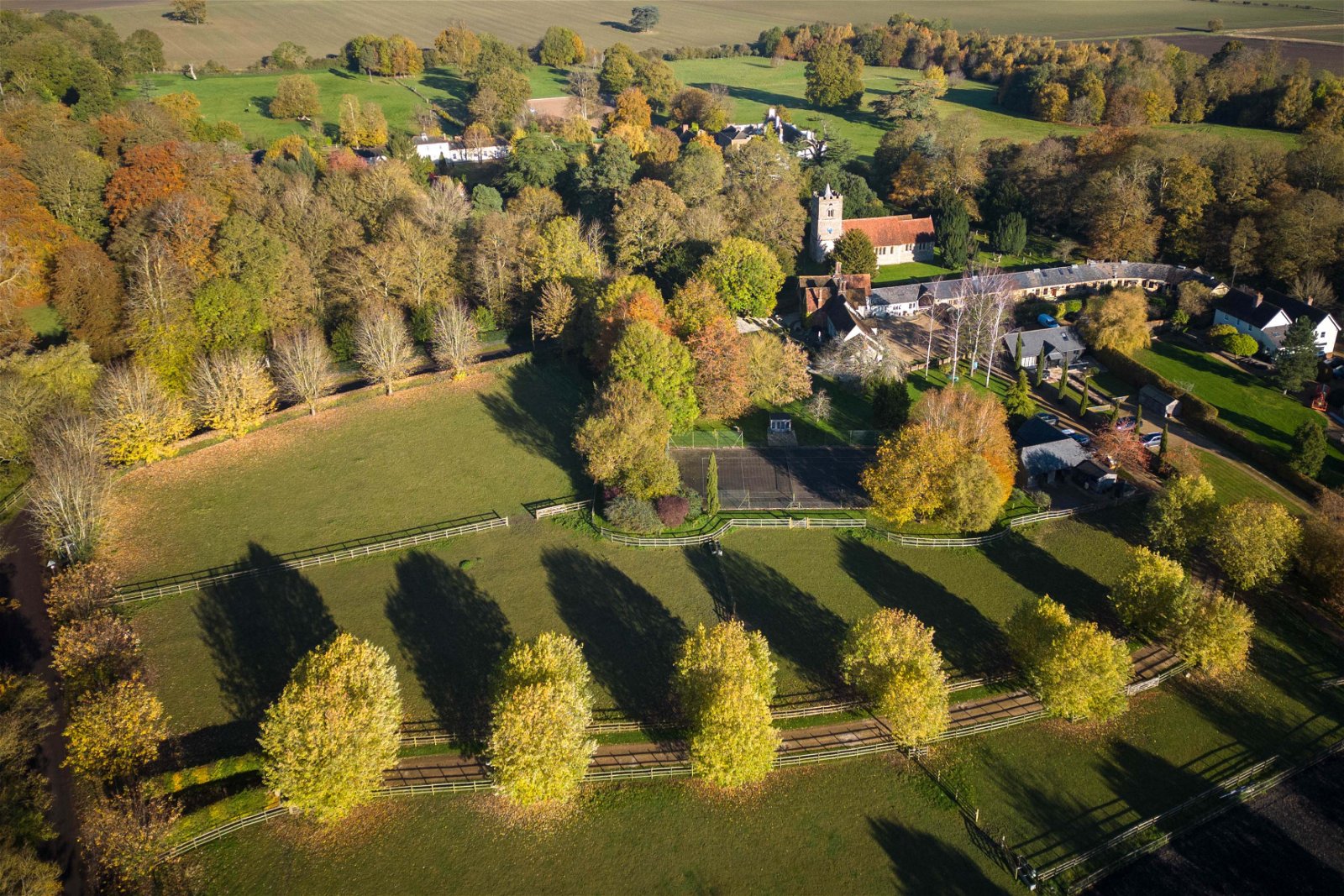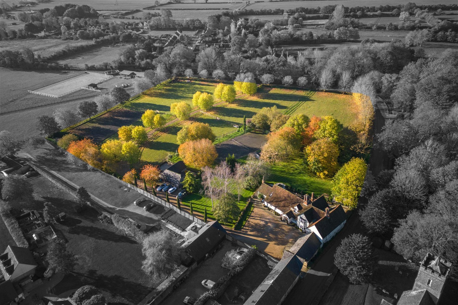 This stunning home is entered through electric security gates taking you down the gravelled driveway with paddocks either side. The property is set within approximately 4.5 acres of land, with a manage, paddocks, tennis court and beautiful formal gardens. The driveway offers parking for many cars and has a second entrance through the archway in front of St Giles church. This is a great entrance to use for the annexe if you prefer a separate entrance. There is a wonderful garden to the rear of this home, a lovely entertaining space with patio area and many places to sit and relax with a glass of wine. The gardens are simply stunning, and with equestrian facilities within the grounds, there are three stables and two large storage barns which could be converted to more stables if needed.