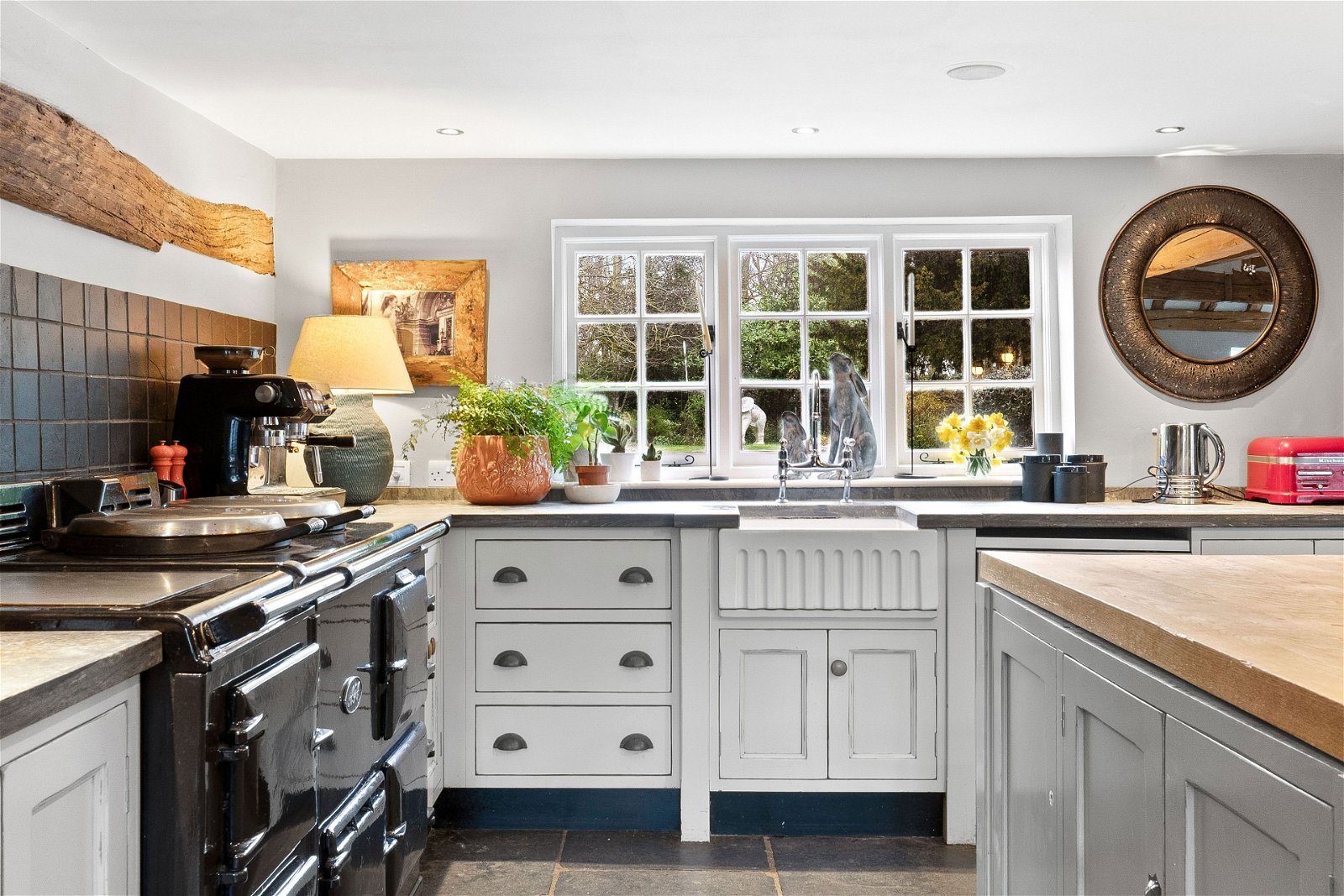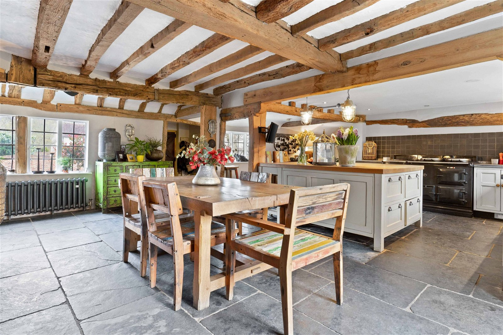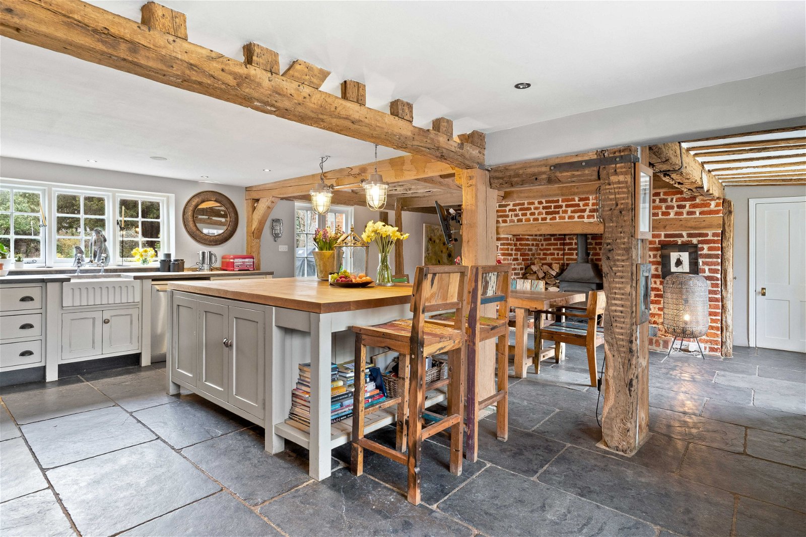 A stunning solid double wooden feature door leads you into the heart of the home, an inviting farmhouse styled kitchen with exposed beams, Aga and slate flooring. The rear views are amazing of the formal rear gardens. There is a delightful dining area with a feature open brick fireplace, French doors, and a separate utility room.