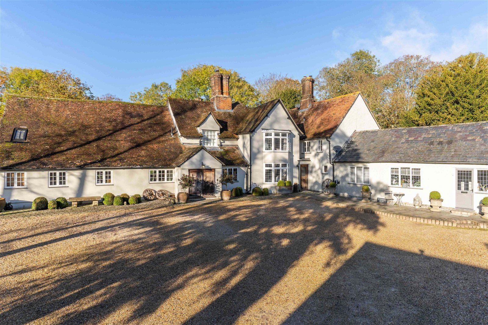Wyddial Bury Farm is an impressive Grade ll listed, Five / Six-bedroom detached hall house dating back to the 16th Century. Set within approximately 4.5 acres, there are stables, a menage and paddocks, a tennis court, and a beautiful formal garden to the rear of this home. The property offers many original features and is full of character and charm with exposed beams and feature fireplaces. This characterful family home is situated in the sought after village of Wyddial, which is just a short drive to Buntingford. The property offers 5714 sq. ft. of accommodation with five bedrooms to the main house, five receptions and three bathrooms. The heart of the home is the farmhouse kitchen diner with Aga and open fireplace. The property also includes a one-bedroom annexe with private access and stables within the grounds. This is a fabulous multi-generational family home, situated in a beautiful countryside location and equestrian facilities. The property has gas central heating, open fires, and wood burner, exempt from EPC as a listed home. Council tax band H.
