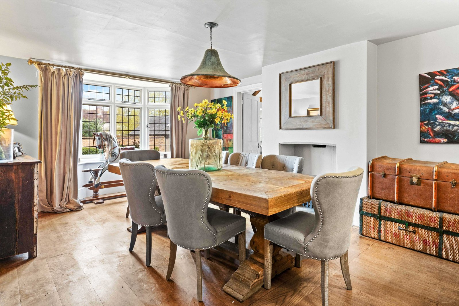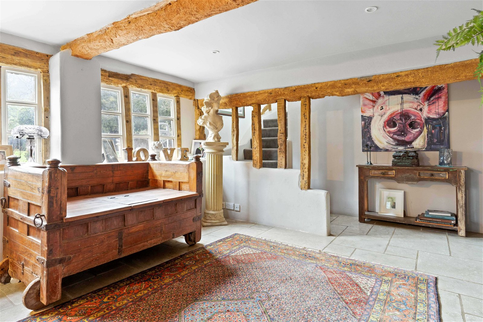 Just off the kitchen diner to the right a formal dining room with leaded bay window and wooden flooring. There is a lobby with doors leading to the outside from a dual aspect, and access if needed to the annexe and a staircase leading to the first floor. A cosy sitting room with wooden flooring, open fireplace, and French doors to the rear garden. To the left of the kitchen, you will find a pantry and lobby with cloakroom. A formal grand living room set over two levels with stone fireplace and open fire and staircase with exposed beams leading to the first floor.
