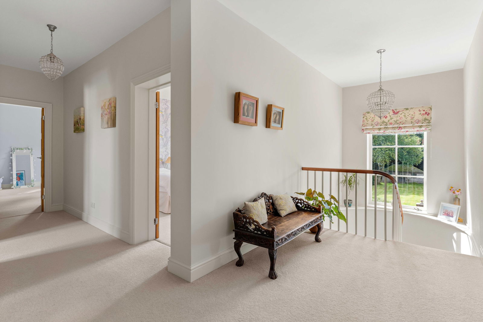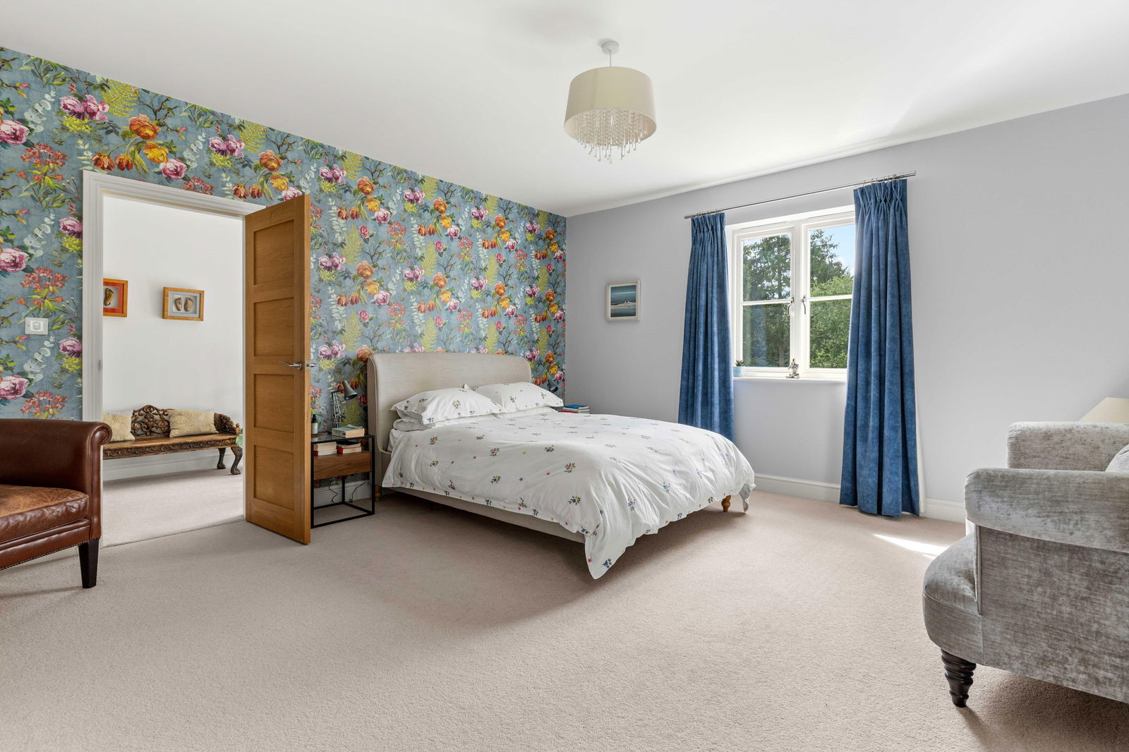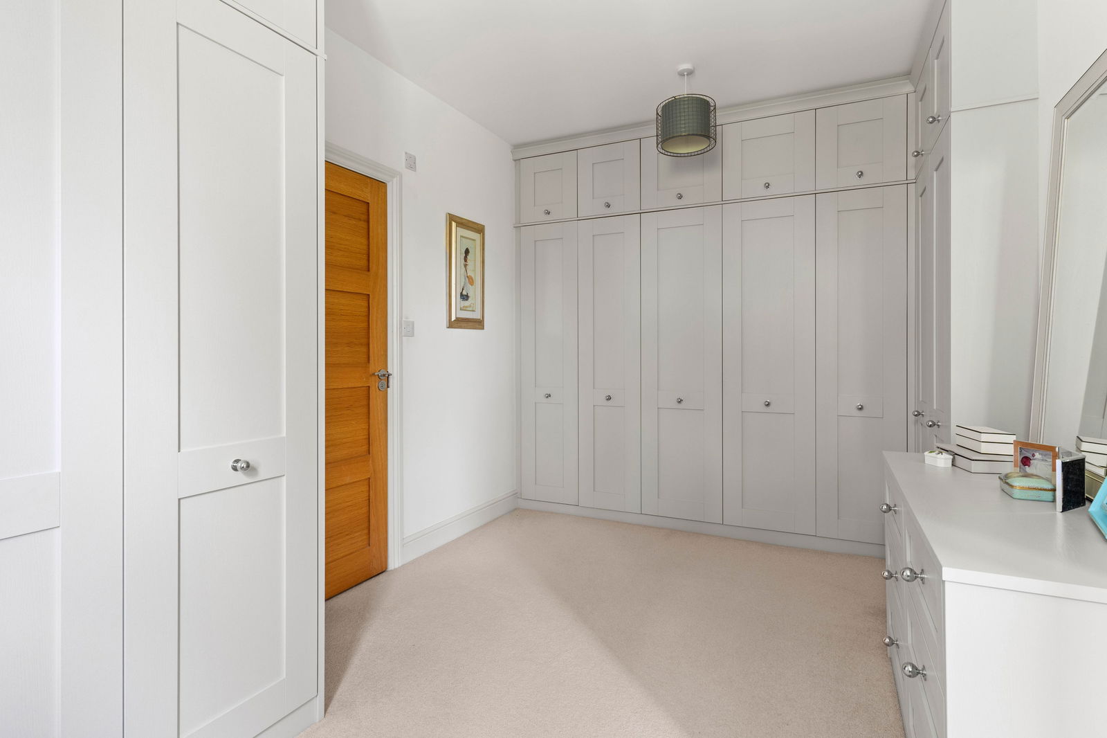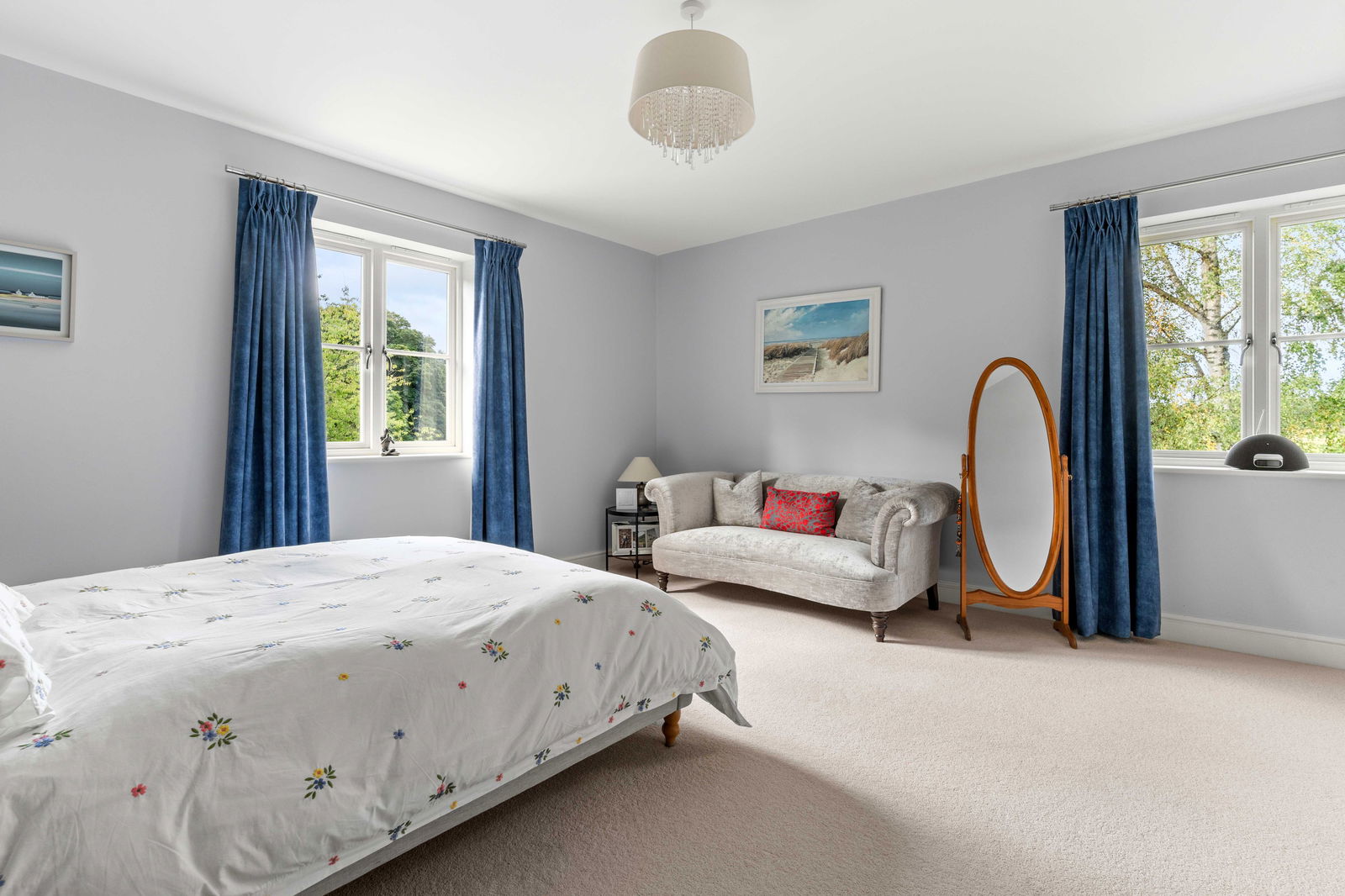 Climbing the elegant winding staircase, you’re immediately bathed in natural light from the striking picture window above the landing, creating a bright and airy transition to the first floor. This level offers three generous double bedrooms, each thoughtfully positioned to make the most of the space and light. The principal bedroom is a true retreat, complete with a spacious walk-through dressing room featuring fitted wardrobes, and a stylish en suite shower room with high-end finishes. Across the landing, the middle bedroom enjoys easy access to the beautifully appointed family bathroom, which boasts both a large bathtub and a separate walk-in shower—ideal for busy family mornings or relaxing evenings. At the far end of the landing is the guest suite, mirroring the layout of the principal bedroom. It includes a private dressing room—offering ample space for freestanding storage—and a contemporary en suite shower room, making it perfect for visiting family or long-stay guests. Continuing to the second floor, you’ll find a large double bedroom with its own en suite shower room, along with a smaller yet comfortable double bedroom on the opposite side of the landing. Both top-floor bedrooms are heated by modern electric heaters, offering flexible and efficient warmth tailored to your needs.