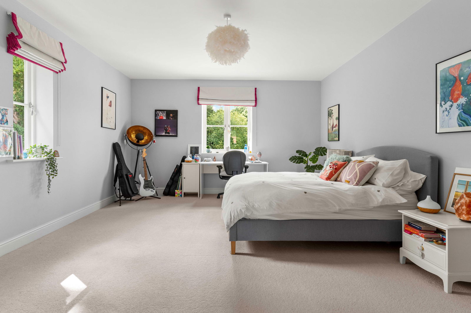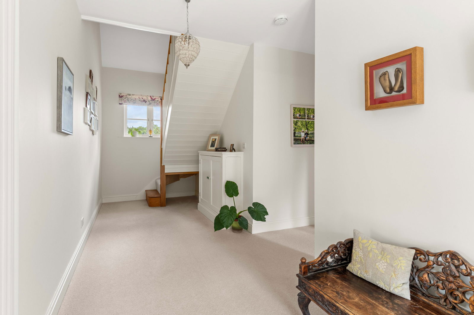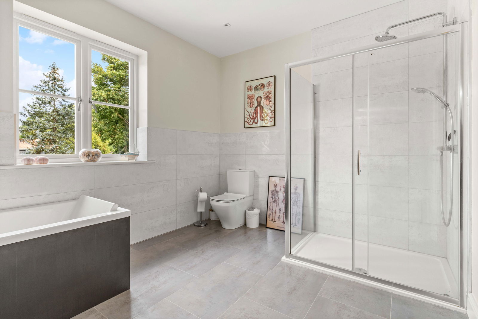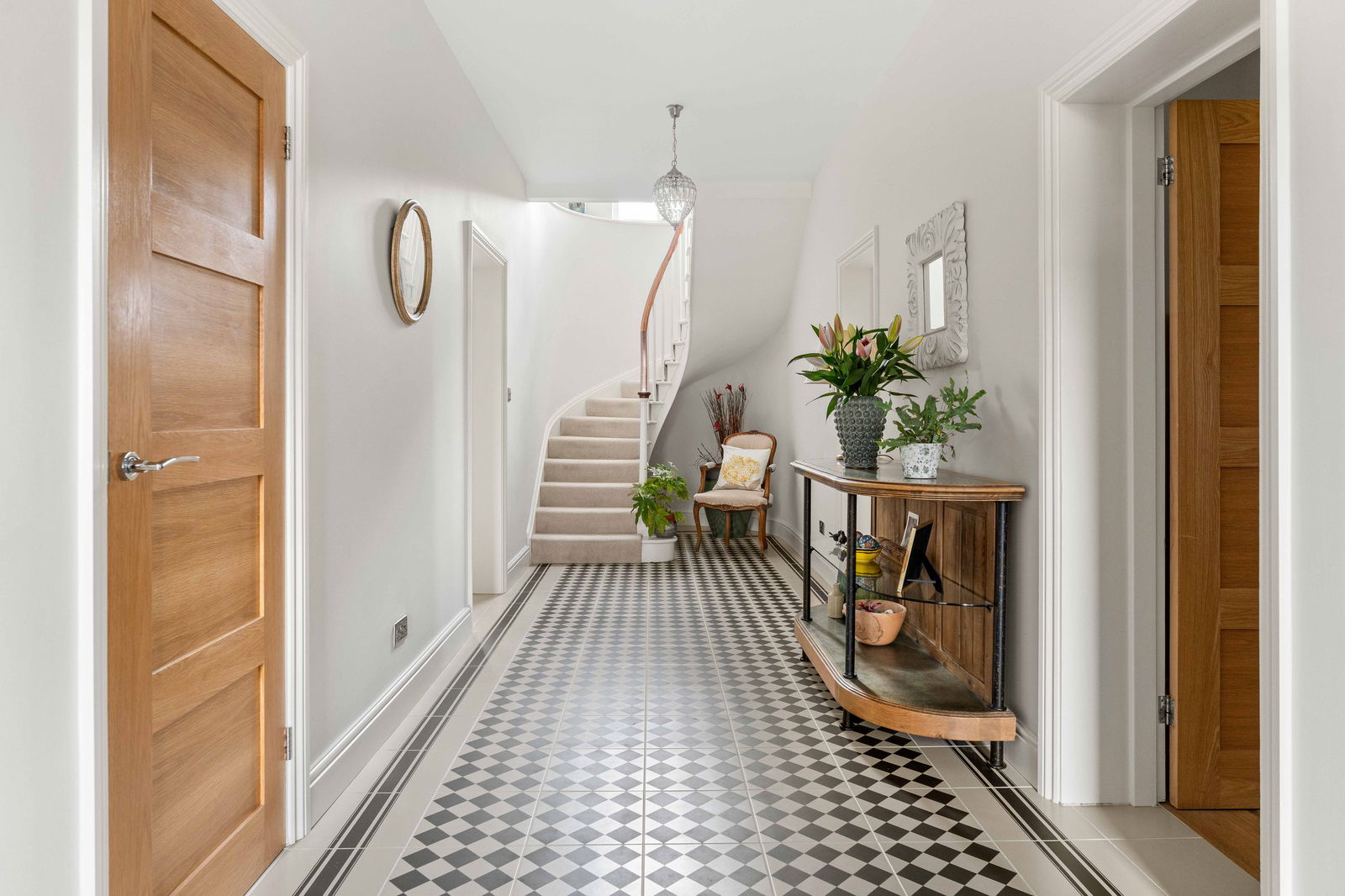 Climbing the elegant winding staircase, you’re immediately bathed in natural light from the striking picture window above the landing, creating a bright and airy transition to the first floor. This level offers three generous double bedrooms, each thoughtfully positioned to make the most of the space and light. The principal bedroom is a true retreat, complete with a spacious walk-through dressing room featuring fitted wardrobes, and a stylish en suite shower room with high-end finishes. Across the landing, the middle bedroom enjoys easy access to the beautifully appointed family bathroom, which boasts both a large bathtub and a separate walk-in shower—ideal for busy family mornings or relaxing evenings. At the far end of the landing is the guest suite, mirroring the layout of the principal bedroom. It includes a private dressing room—offering ample space for freestanding storage—and a contemporary en suite shower room, making it perfect for visiting family or long-stay guests. Continuing to the second floor, you’ll find a large double bedroom with its own en suite shower room, along with a smaller yet comfortable double bedroom on the opposite side of the landing. Both top-floor bedrooms are heated by modern electric heaters, offering flexible and efficient warmth tailored to your needs.