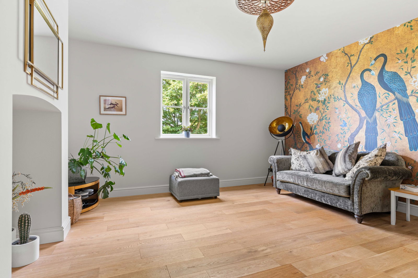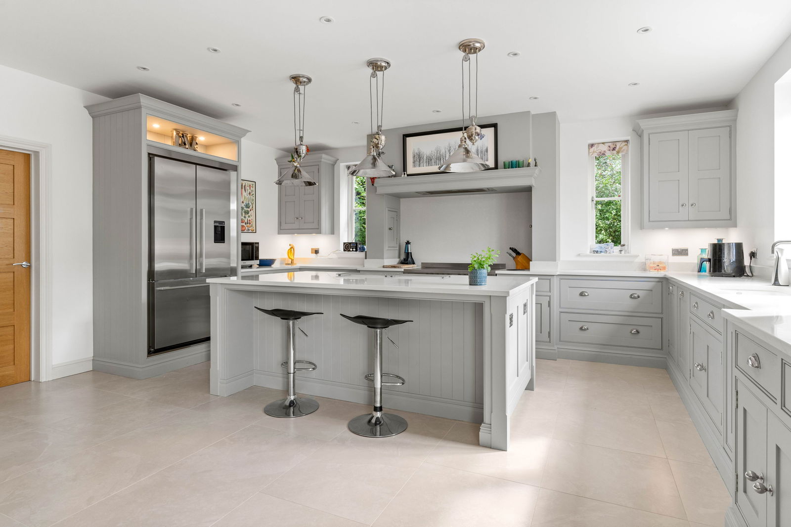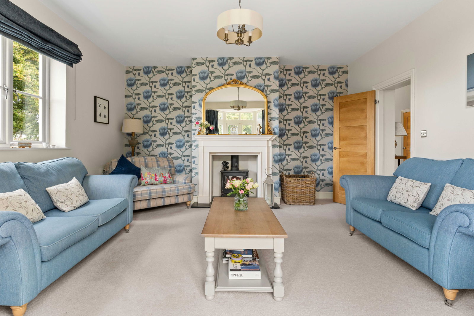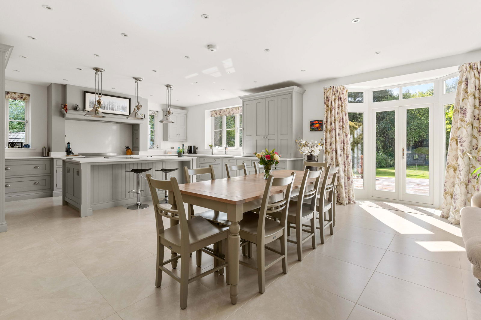 As you step into Bradley Springs, you're welcomed into a generous entrance hallway adorned with modern chequerboard Victorian-style tiling, setting the tone for the elegance that follows. Light floods in from a window above the stunning winding staircase, creating a bright and inviting space. This area also features a convenient cloakroom and a built-in coat storage cupboard. To your left is a spacious kitchen and dining room, where bay patio doors frame picturesque views of the garden and provide seamless access to the patio area—ideal for alfresco dining and entertaining. The dining area easily accommodates a large table, perfect for both family meals and lively dinner parties. The heart of the home is undoubtedly the Tom Howley-designed kitchen, a true showstopper. It features a large central island with seating, integrated appliances, and a striking double electric range oven set within a charming chimney breast. The elegant neutral grey cabinetry, white quartz worktops, and double pantry cupboard offer both style and substance. The kitchen sink overlooks the garden, making even everyday moments feel special. To the rear of the kitchen, you’ll find a vast boot room—a practical and stylish space designed for family life. With a rear entrance, ample storage cupboards, a seating bench, and utility area with sink, washing machine, and tumble dryer, it’s ideal for outdoor lovers needing space for muddy boots and coats. Crossing the hallway, you enter the main lounge, a beautifully light-filled room that again enjoys garden views via a set of patio doors. A multi-fuel wood-burning stove adds a cosy focal point, while sumptuous carpeting underfoot completes the warm, welcoming atmosphere. Adjacent to the lounge is a second reception room, perfect as a TV den, home office, playroom, or simply as additional space for families to unwind and spread out.