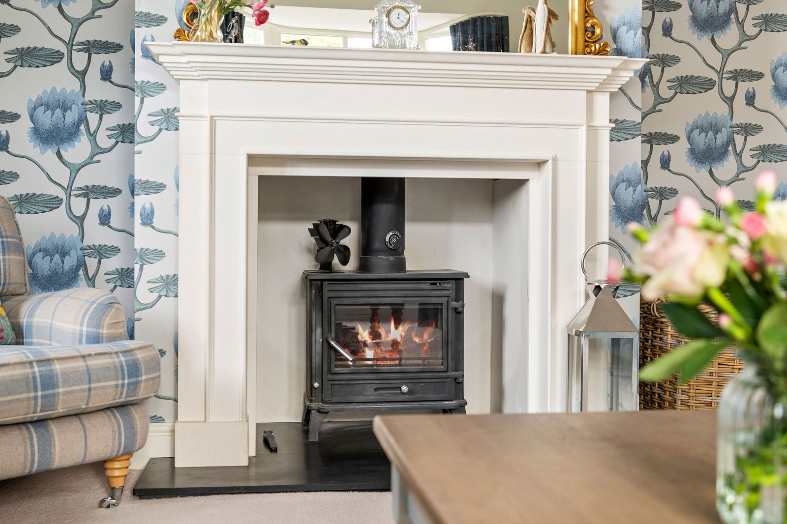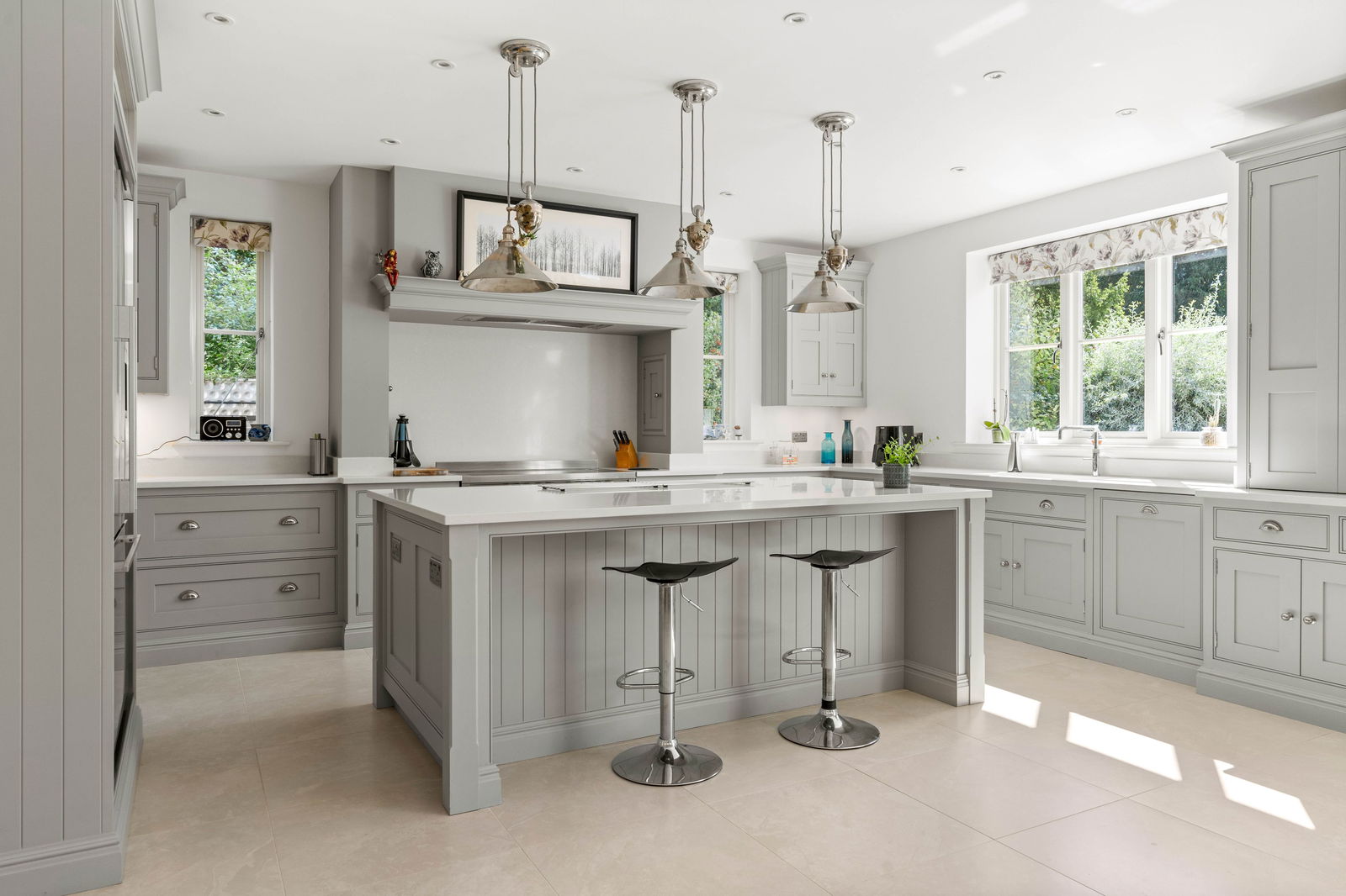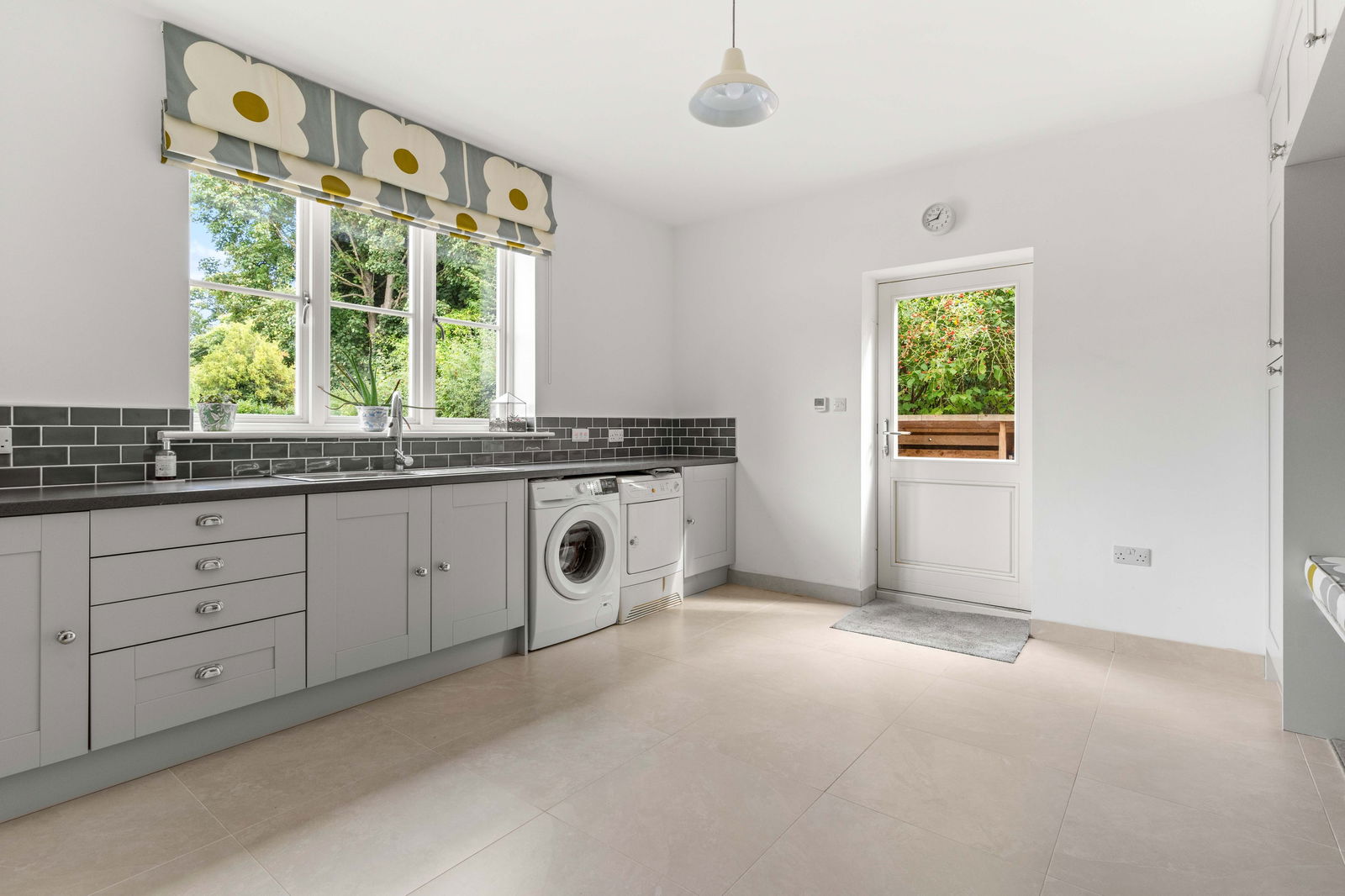 As you step into Bradley Springs, you're welcomed into a generous entrance hallway adorned with modern chequerboard Victorian-style tiling, setting the tone for the elegance that follows. Light floods in from a window above the stunning winding staircase, creating a bright and inviting space. This area also features a convenient cloakroom and a built-in coat storage cupboard. To your left is a spacious kitchen and dining room, where bay patio doors frame picturesque views of the garden and provide seamless access to the patio area—ideal for alfresco dining and entertaining. The dining area easily accommodates a large table, perfect for both family meals and lively dinner parties. The heart of the home is undoubtedly the Tom Howley-designed kitchen, a true showstopper. It features a large central island with seating, integrated appliances, and a striking double electric range oven set within a charming chimney breast. The elegant neutral grey cabinetry, white quartz worktops, and double pantry cupboard offer both style and substance. The kitchen sink overlooks the garden, making even everyday moments feel special. To the rear of the kitchen, you’ll find a vast boot room—a practical and stylish space designed for family life. With a rear entrance, ample storage cupboards, a seating bench, and utility area with sink, washing machine, and tumble dryer, it’s ideal for outdoor lovers needing space for muddy boots and coats. Crossing the hallway, you enter the main lounge, a beautifully light-filled room that again enjoys garden views via a set of patio doors. A multi-fuel wood-burning stove adds a cosy focal point, while sumptuous carpeting underfoot completes the warm, welcoming atmosphere. Adjacent to the lounge is a second reception room, perfect as a TV den, home office, playroom, or simply as additional space for families to unwind and spread out.