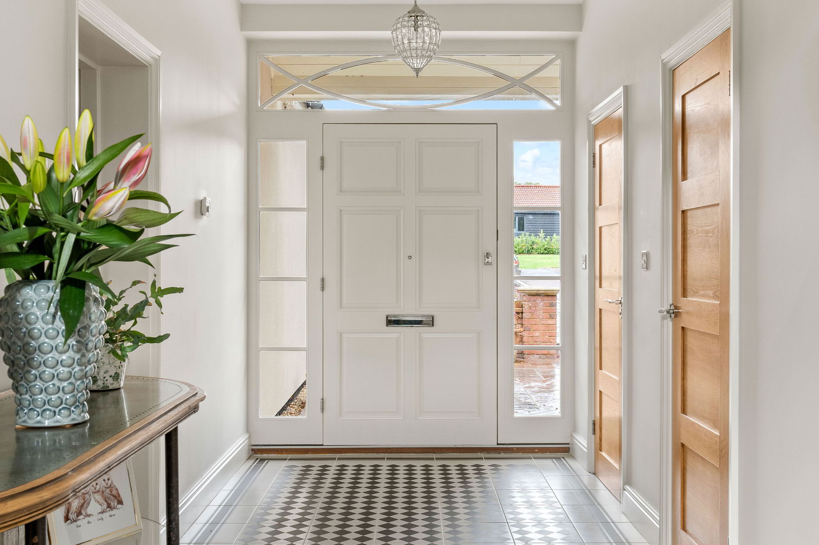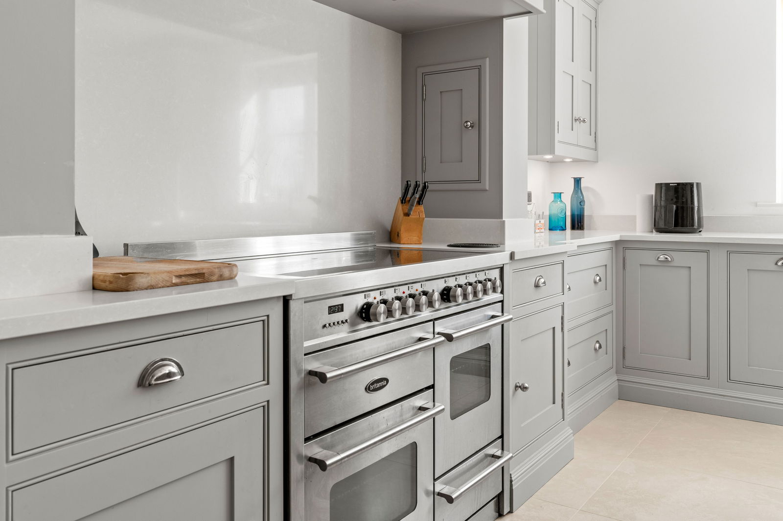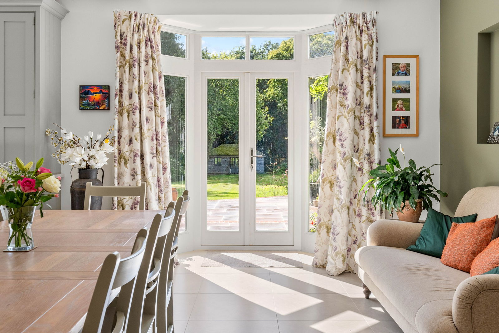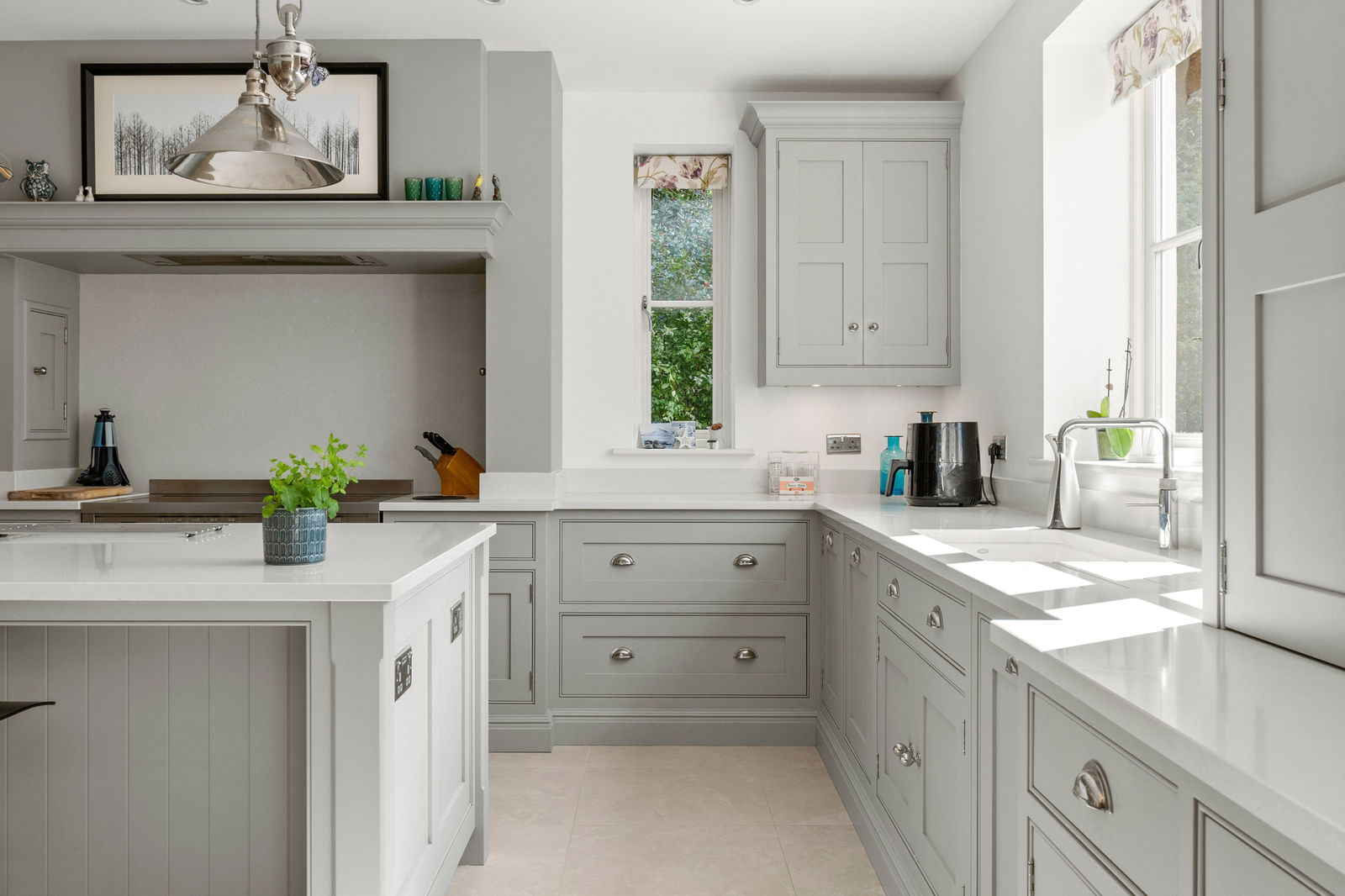 As you step into Bradley Springs, you're welcomed into a generous entrance hallway adorned with modern chequerboard Victorian-style tiling, setting the tone for the elegance that follows. Light floods in from a window above the stunning winding staircase, creating a bright and inviting space. This area also features a convenient cloakroom and a built-in coat storage cupboard. To your left is a spacious kitchen and dining room, where bay patio doors frame picturesque views of the garden and provide seamless access to the patio area—ideal for alfresco dining and entertaining. The dining area easily accommodates a large table, perfect for both family meals and lively dinner parties. The heart of the home is undoubtedly the Tom Howley-designed kitchen, a true showstopper. It features a large central island with seating, integrated appliances, and a striking double electric range oven set within a charming chimney breast. The elegant neutral grey cabinetry, white quartz worktops, and double pantry cupboard offer both style and substance. The kitchen sink overlooks the garden, making even everyday moments feel special. To the rear of the kitchen, you’ll find a vast boot room—a practical and stylish space designed for family life. With a rear entrance, ample storage cupboards, a seating bench, and utility area with sink, washing machine, and tumble dryer, it’s ideal for outdoor lovers needing space for muddy boots and coats. Crossing the hallway, you enter the main lounge, a beautifully light-filled room that again enjoys garden views via a set of patio doors. A multi-fuel wood-burning stove adds a cosy focal point, while sumptuous carpeting underfoot completes the warm, welcoming atmosphere. Adjacent to the lounge is a second reception room, perfect as a TV den, home office, playroom, or simply as additional space for families to unwind and spread out.