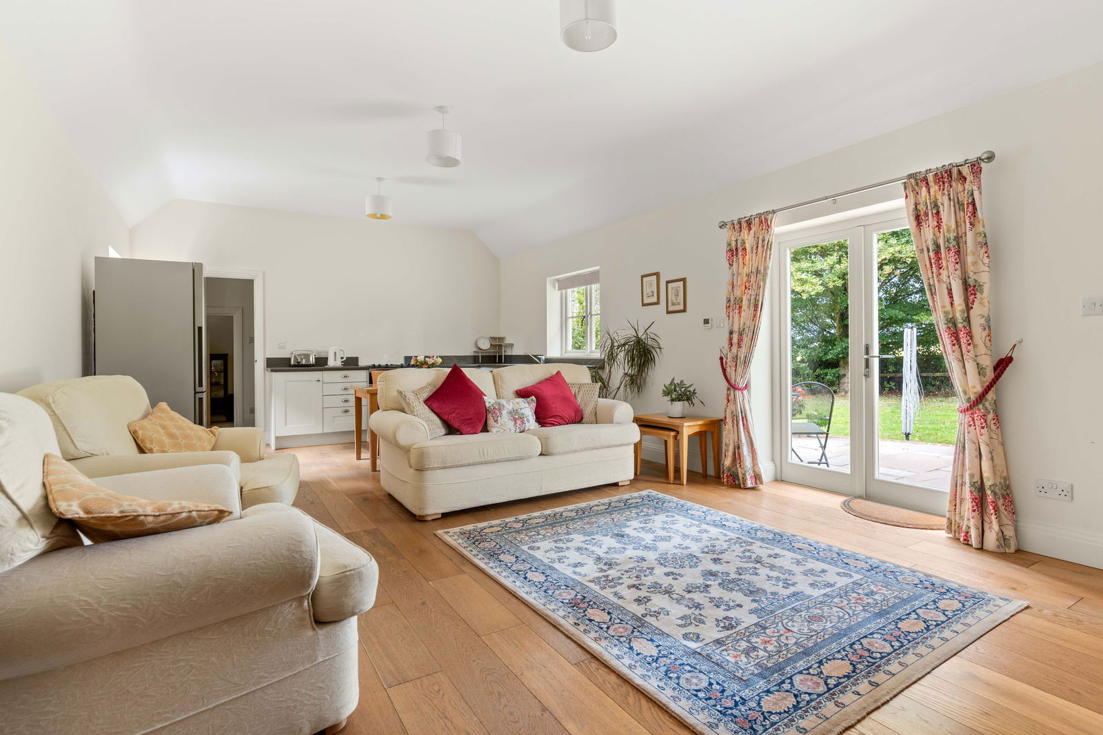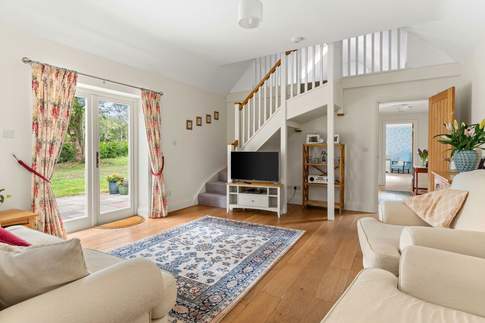 Accessed via its own private front door from the charming cobblestone driveway, the annex is a stunning and highly versatile addition to Bradley Springs. There is also an internal connecting door to the main house, allowing the space to function independently or as an integrated extension of the home—ideal for a variety of living arrangements. The heart of the annex is a spacious open-plan kitchen and living area, thoughtfully zoned to create a welcoming and functional layout. The kitchen comfortably accommodates a dining table for four, while the lounge area is arranged to take full advantage of the picturesque views through patio doors, overlooking the garden and open farmland beyond. The ground floor also features a modern shower room, a separate utility room, and a large double bedroom, providing a complete and convenient living space on one level. A staircase leads to a mezzanine floor, where a generous landing opens into a second double bedroom, ideal for guests or family members seeking a more private retreat. Whether used for multi-generational living, as accommodation for an au pair, or for long-term visitors, the annex offers comfort, privacy, and flexibility rarely found in properties of this kind.