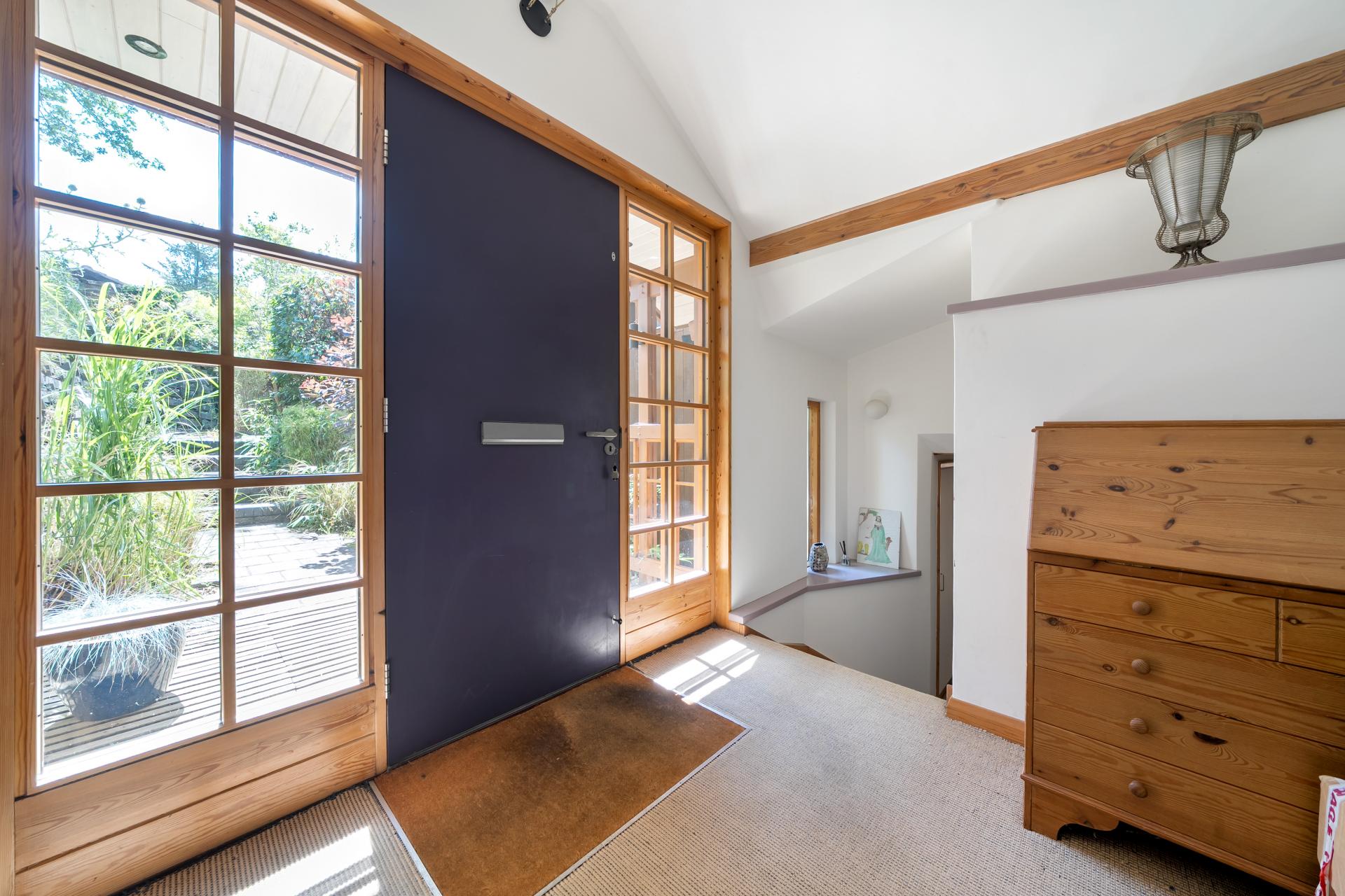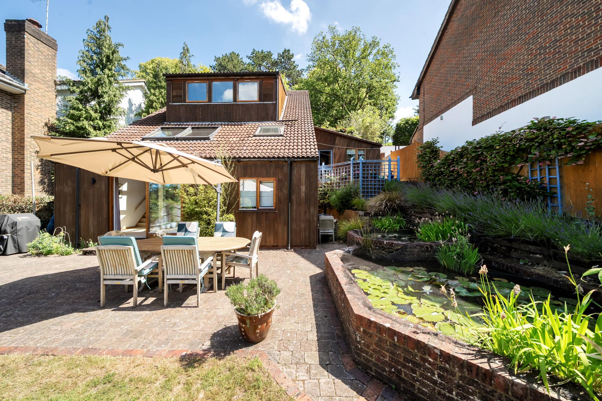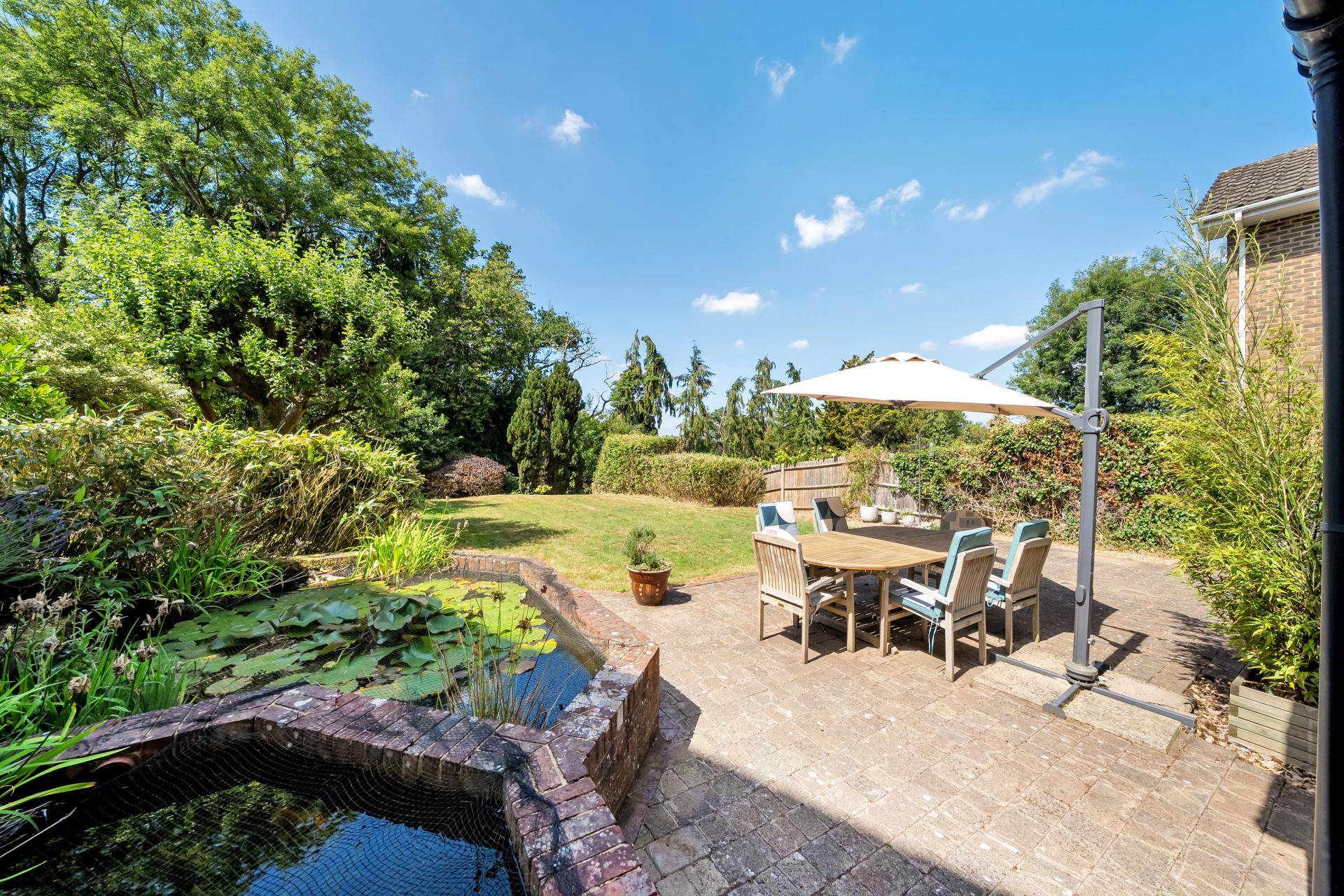 A lobby from the kitchen leads to an upper terrace with views of the ornamental ponds and access to the garden. The lobby also leads to the utility room, keeping laundry and household tasks conveniently tucked away.