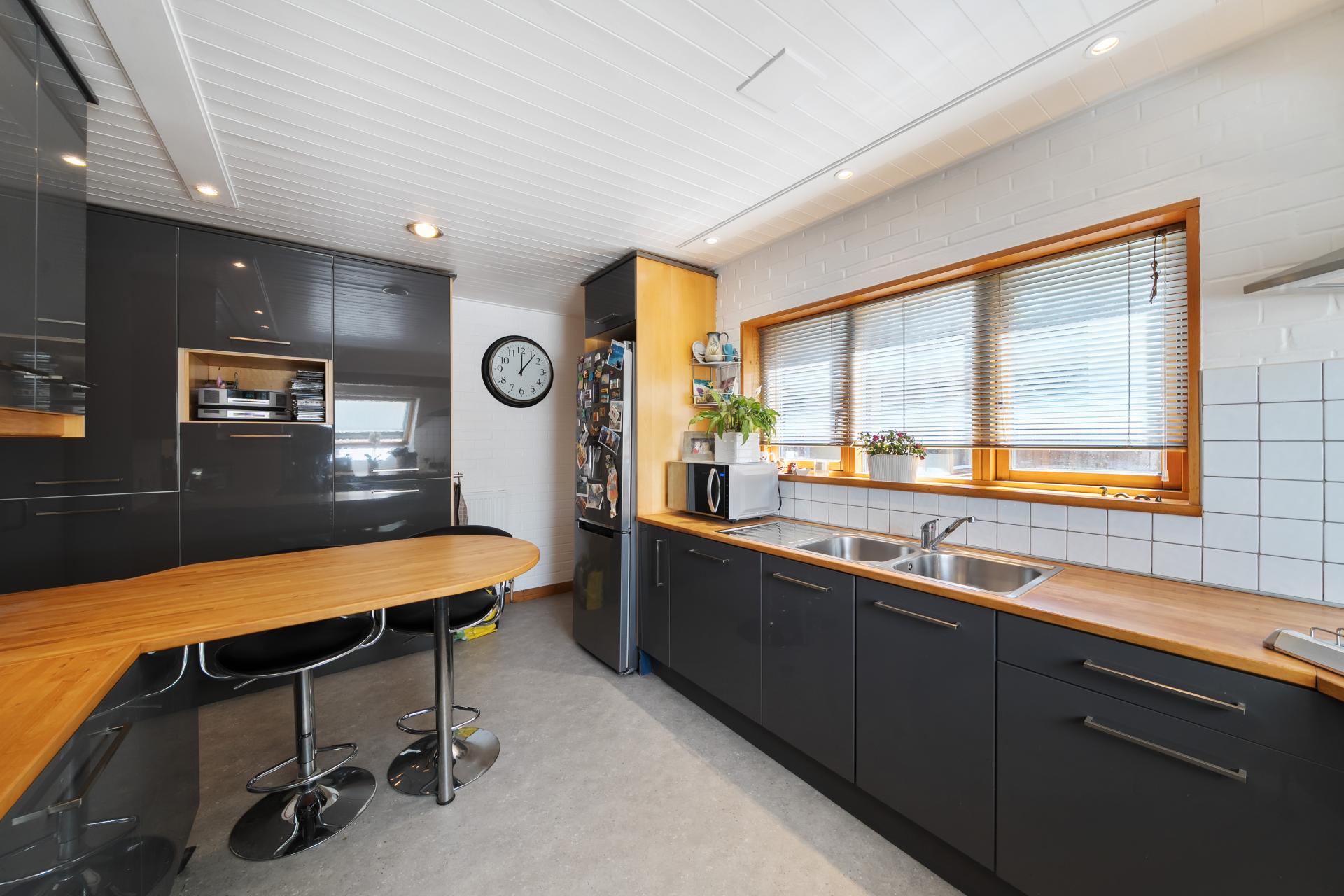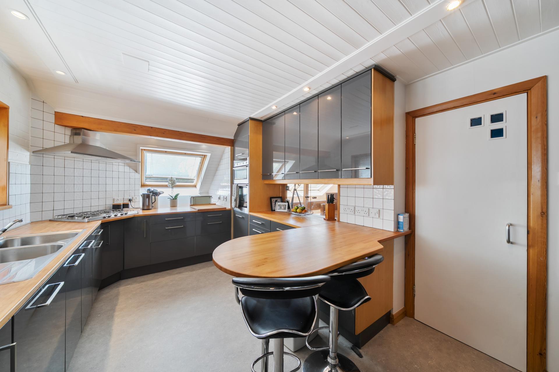 Adjacent to the dining room is a well-proportioned, generously fitted kitchen, with a double aspect. Plentiful beech work tops, including a deep surface into the window recess offering overall substantial work surface. Additional workspace is provided by the peninsular breakfast bar with cupboards below. A large bank of floor to ceiling cupboards provides additional ample storage space.