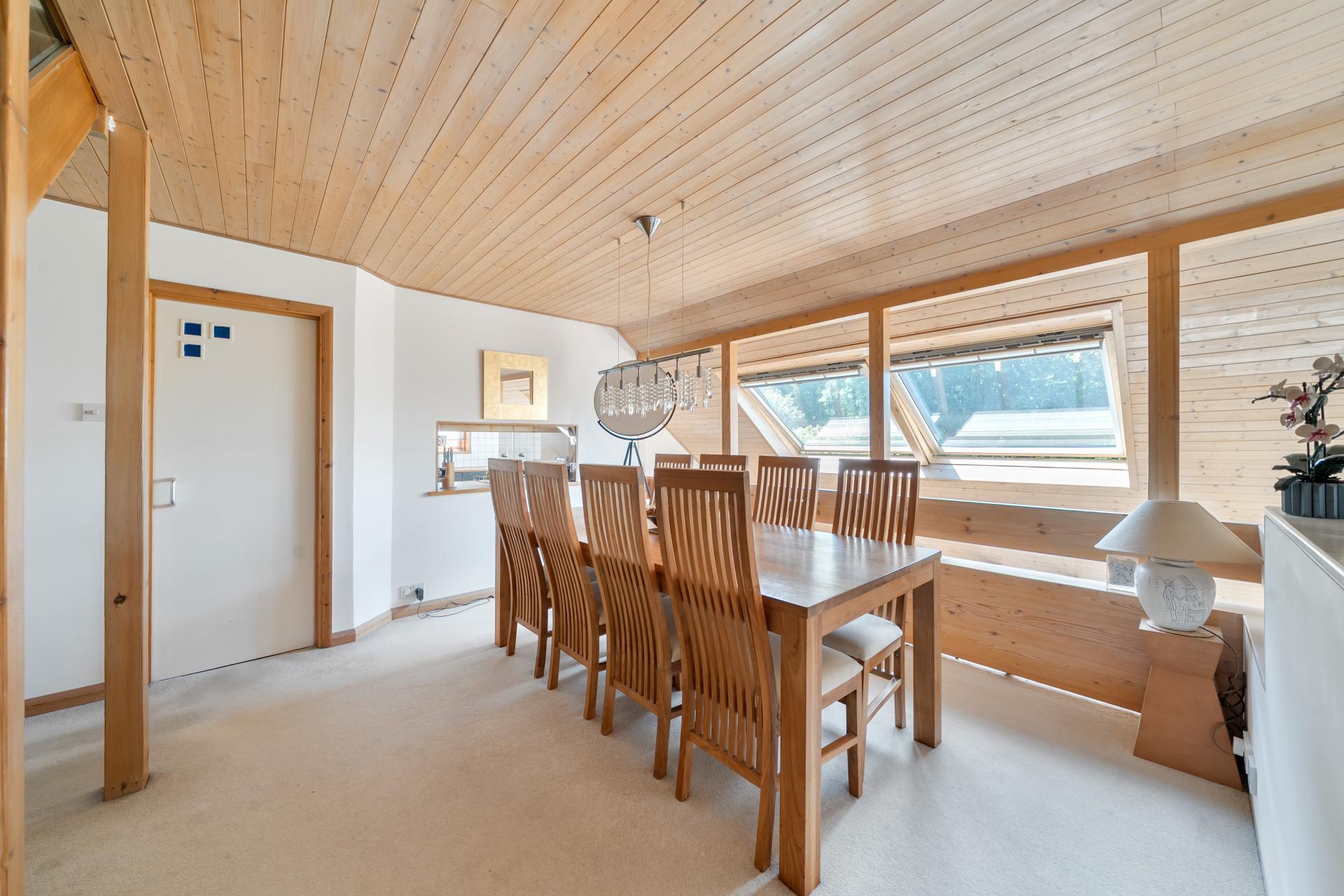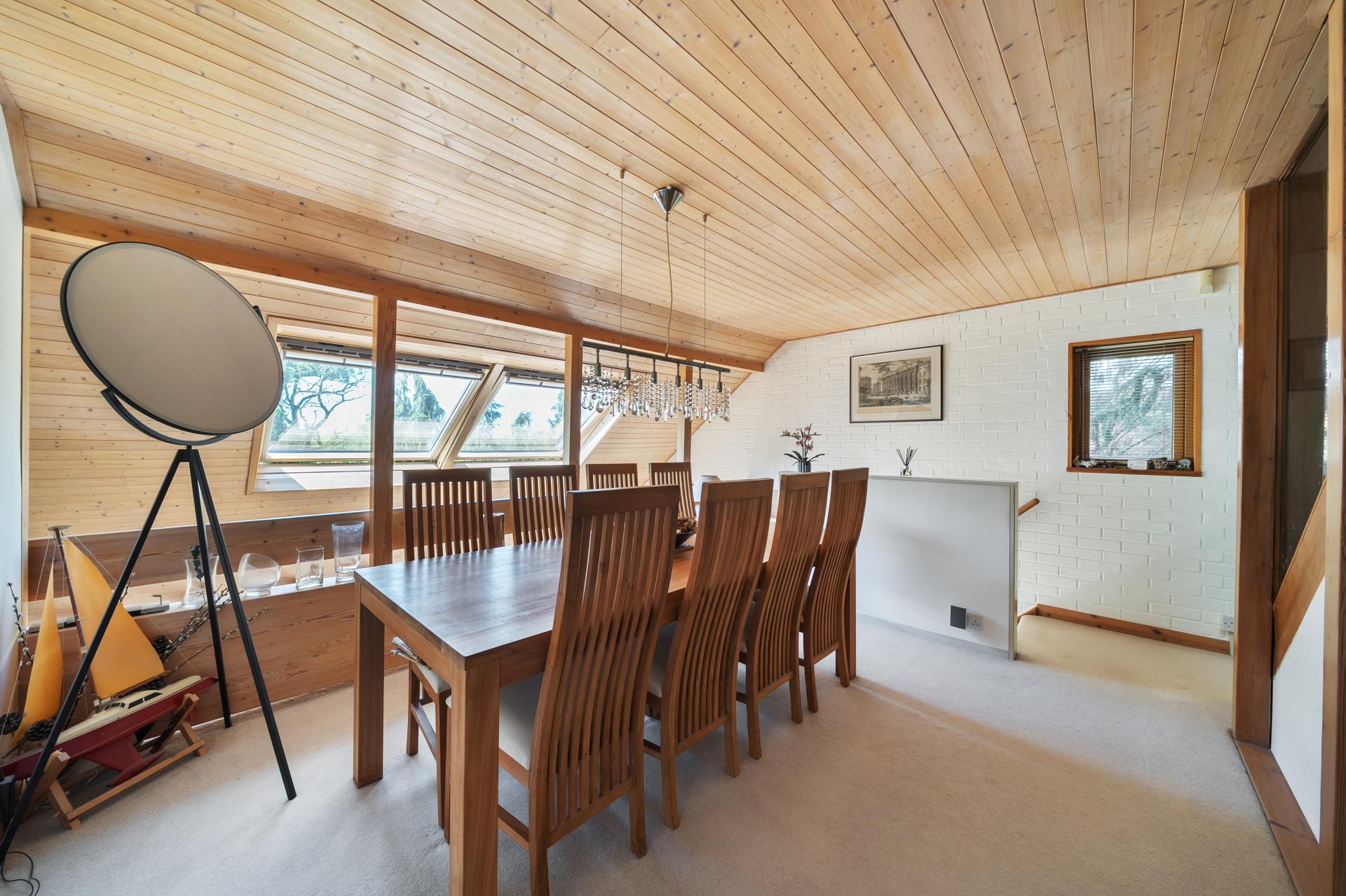 Upon entering the property, you are welcomed by a generous entrance hall, complete with built-in storage. A cloakroom with WC and wash basin is located off the hallway. Double doors from the hall lead to a spacious dining room which sets an impressive tone, enhanced by a galleried overlook into the lounge below and natural light streaming through Velux windows, creating a bright and open atmosphere.