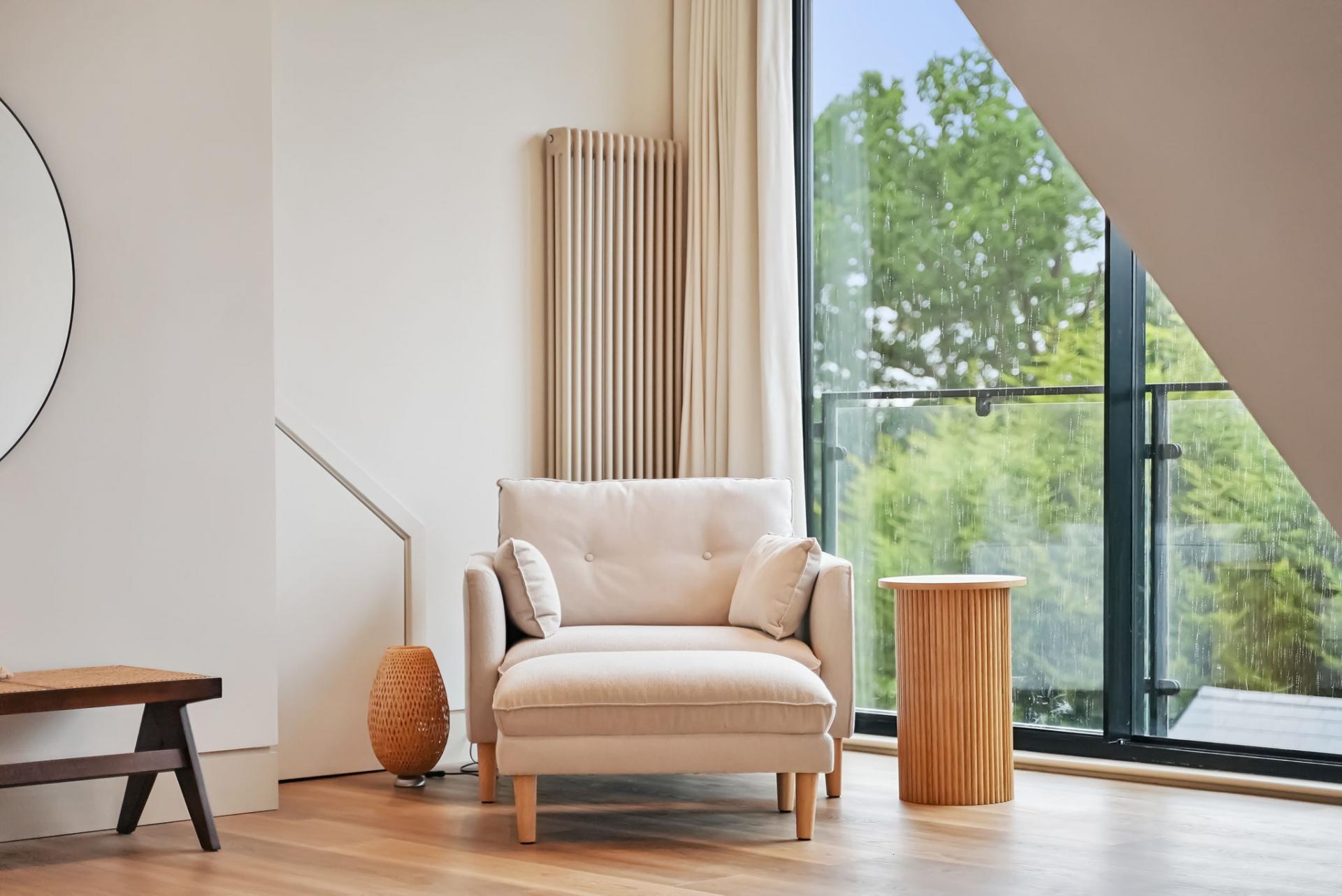 The top floor is a true sanctuary – perfect for use as a principal suite or private guest quarters. The bedroom area features oak veneer panelling, ambient bedside lighting, and eaves storage running the perimeter. A tranquil sitting area enjoys open views via full-height sliding glass doors with a Juliette balcony, looking across the open fields beyond.