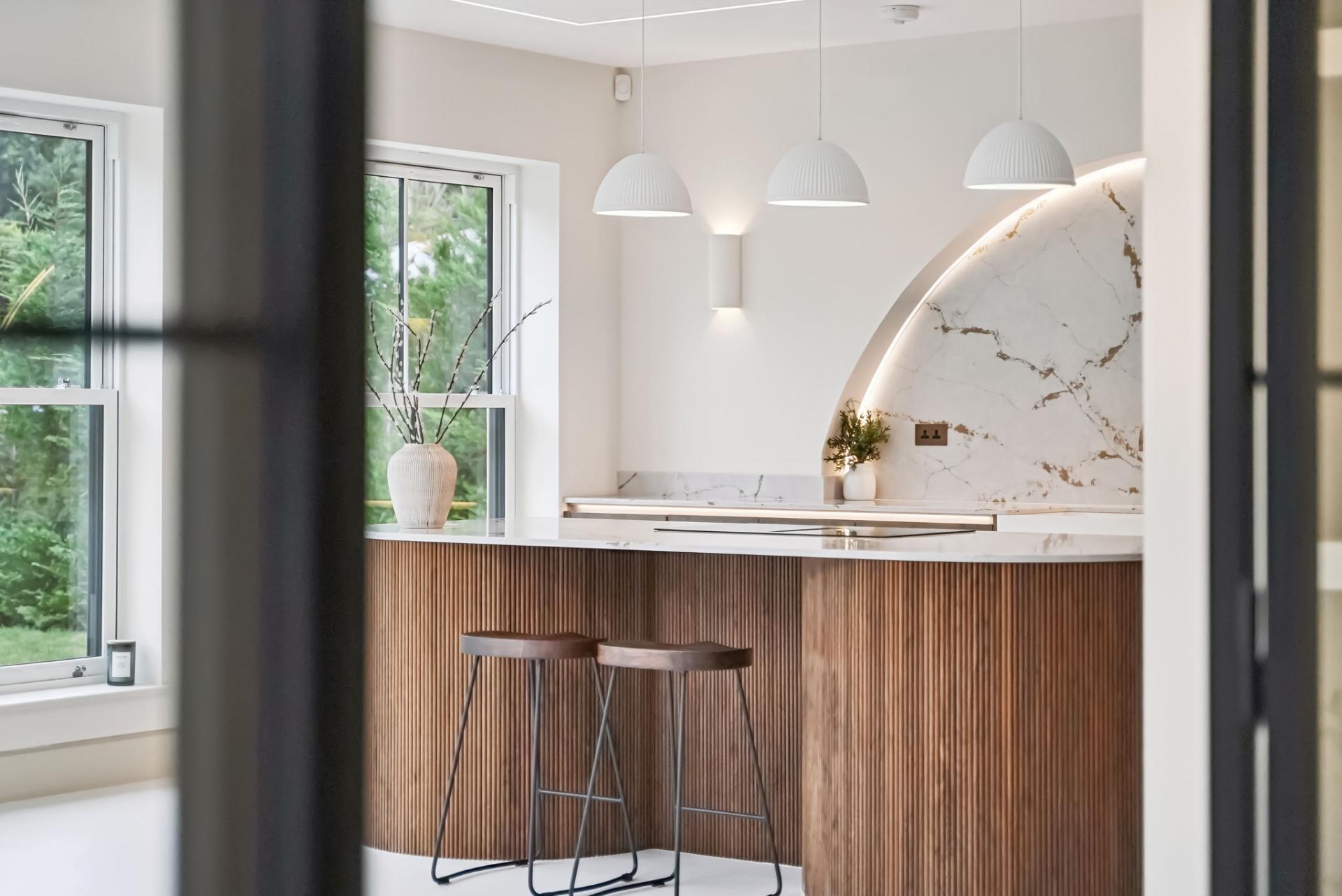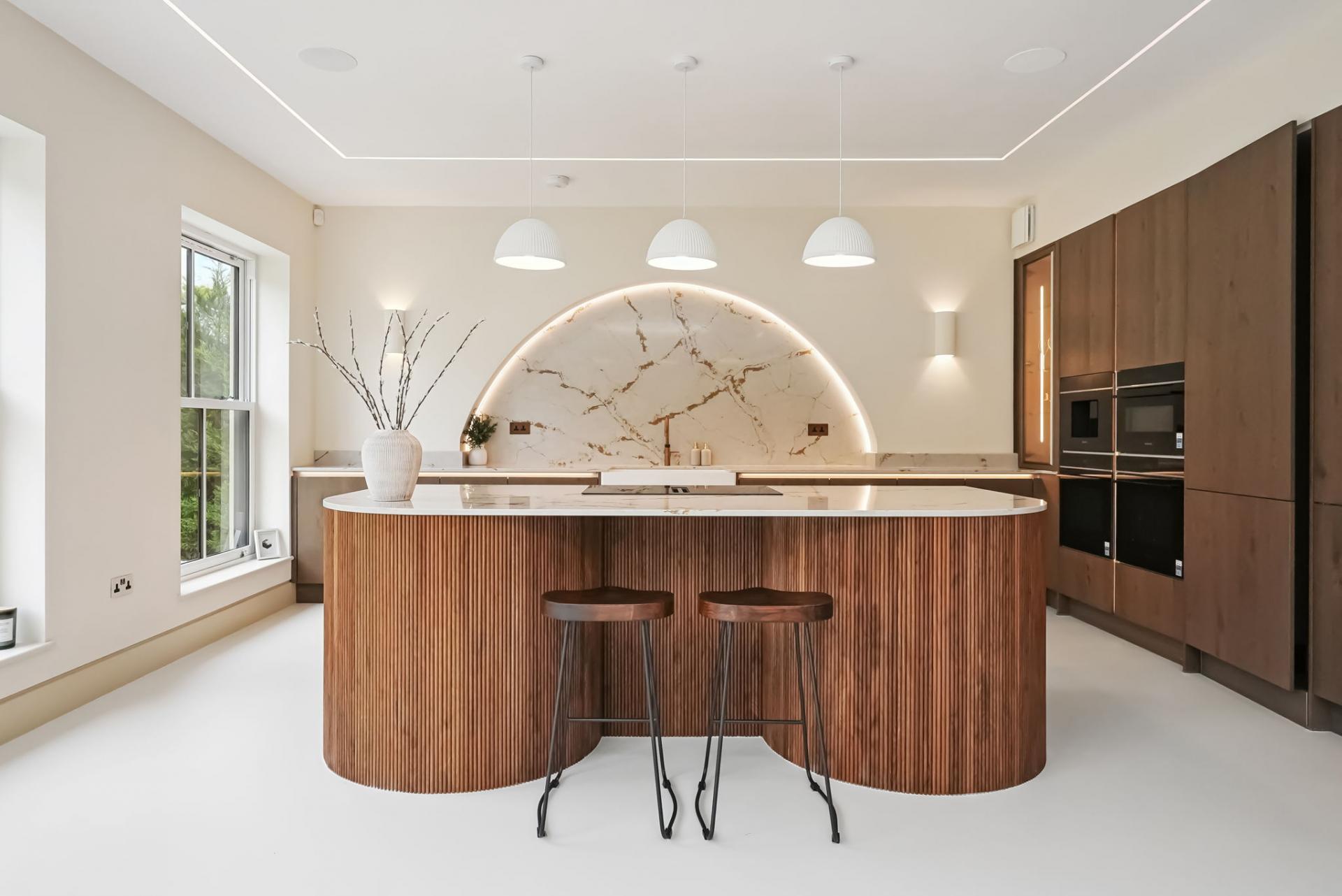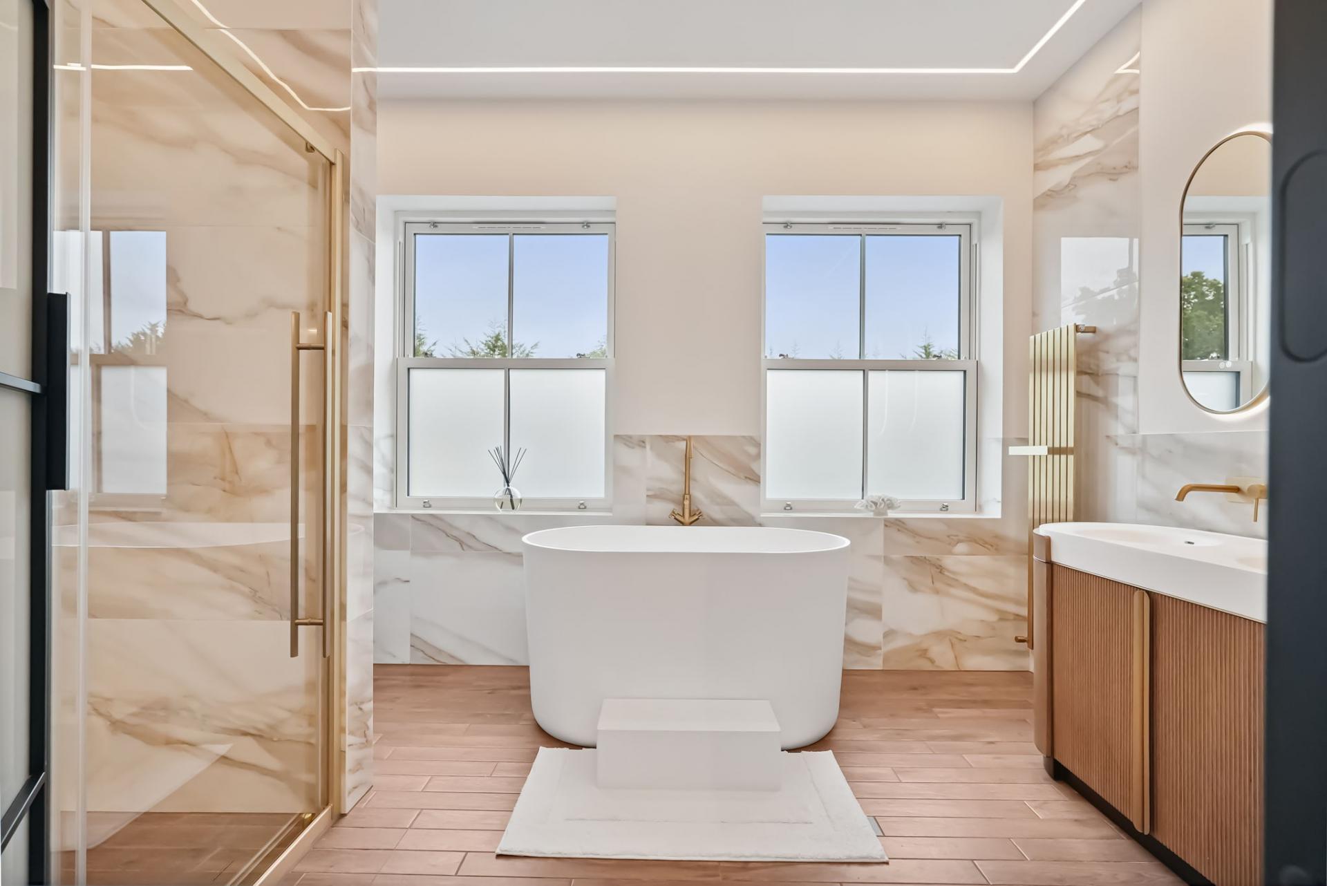 A bespoke walk-through dressing room with fluted wardrobes leads to a spectacular en-suite walk-in wet room, fitted with a ‘Lusso’ fluted resin stone bath, freestanding tap, and Carrera marble tiles – a showpiece of design and indulgence.