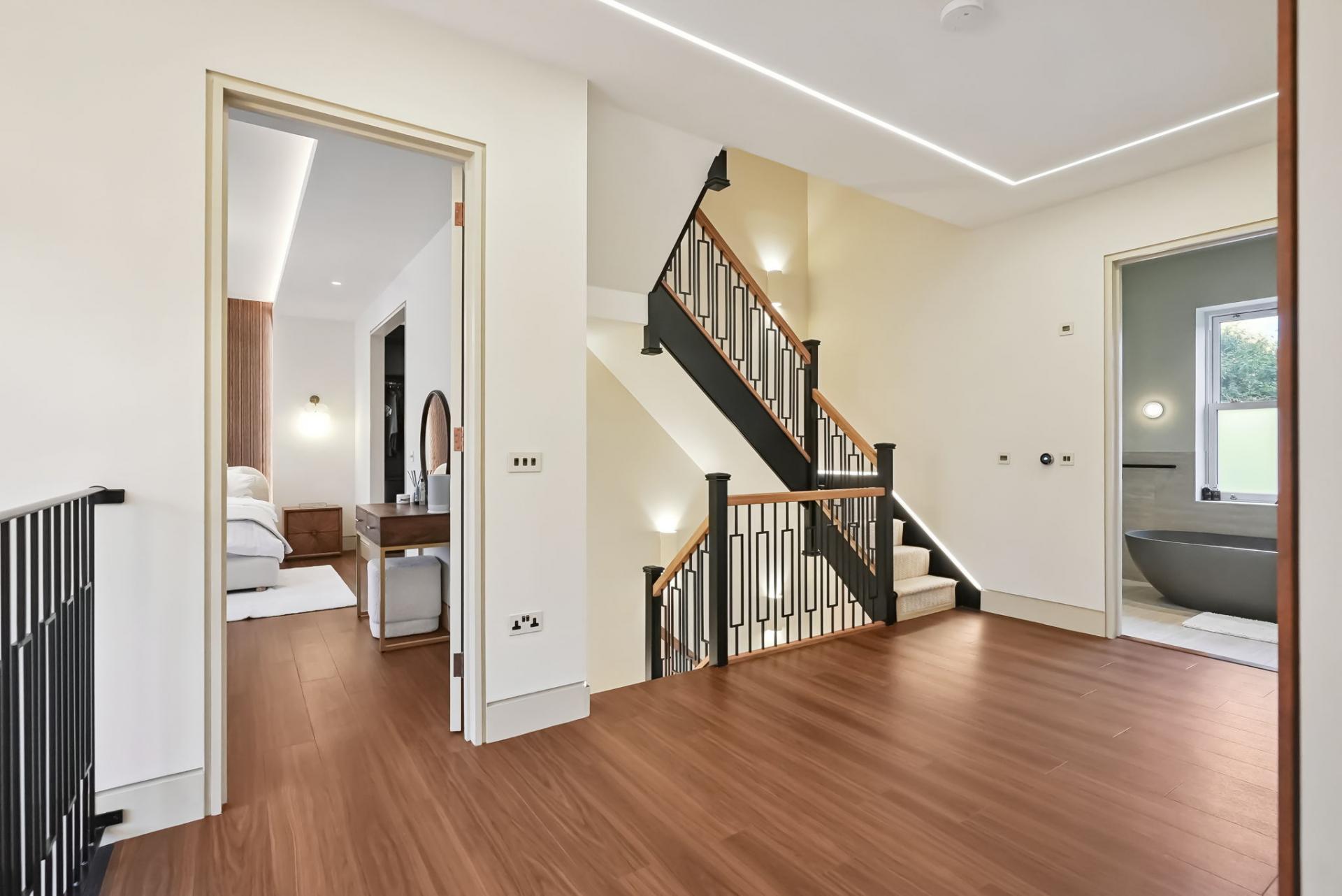 An ornate turning staircase leads to a beautifully lit first-floor landing, where light pours through a large feature window. The principal bedroom suite is a triumph, complete with bespoke headboard, media wall, walk-in dressing area, and a luxurious en-suite shower room featuring smoked oak & Carrara marble resin basins, brushed gold ‘Lusso’ fittings, and walnut cladding.