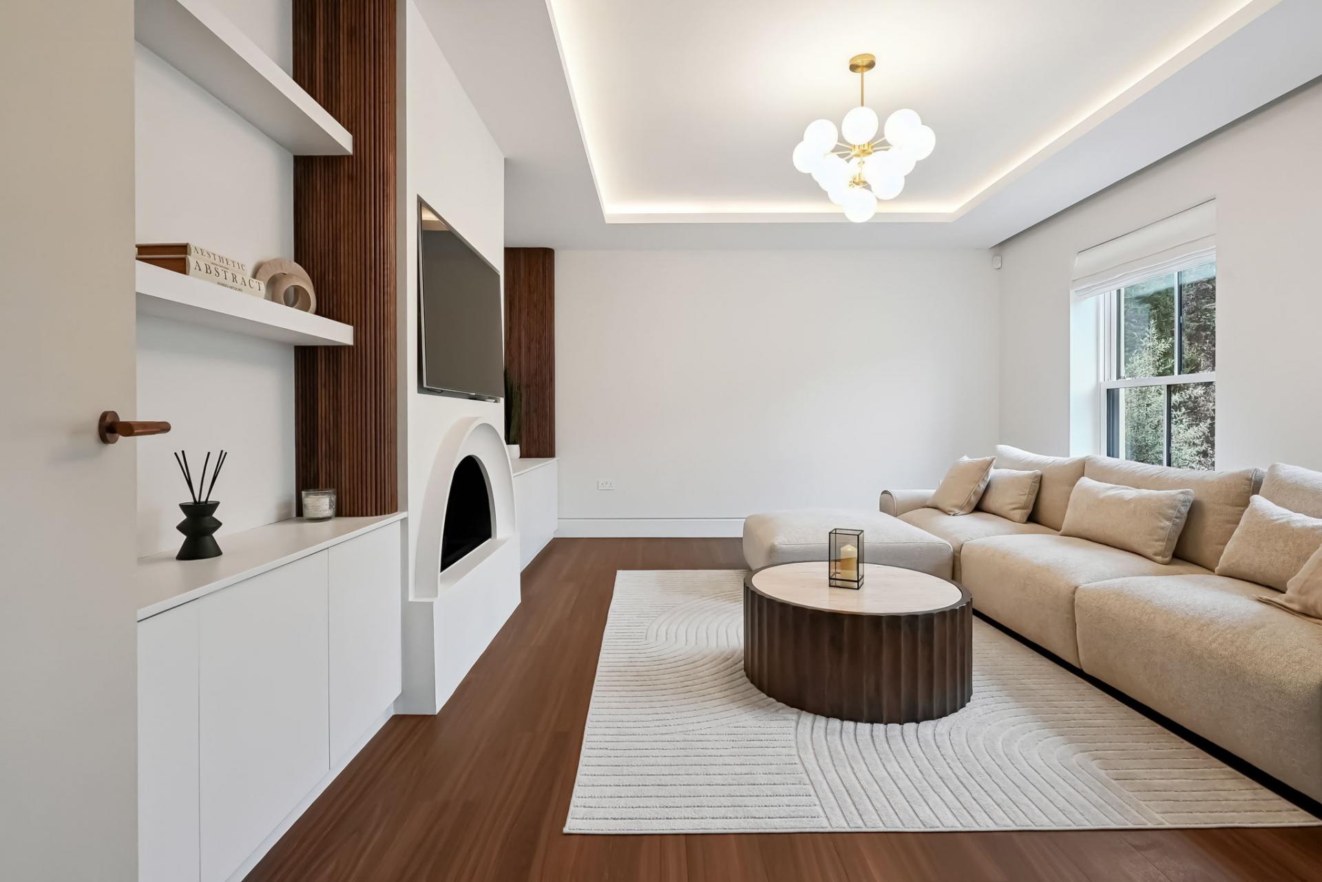 The formal lounge is a standout, with elegant bespoke cabinetry, ambient lighting, a recessed TV unit, and a unique arched bio-ethanol fireplace. A stylish home office with fitted cabinetry provides the perfect work-from-home environment, while an additional reception room or ground floor bedroom features LED ceiling lighting and underfloor heating.