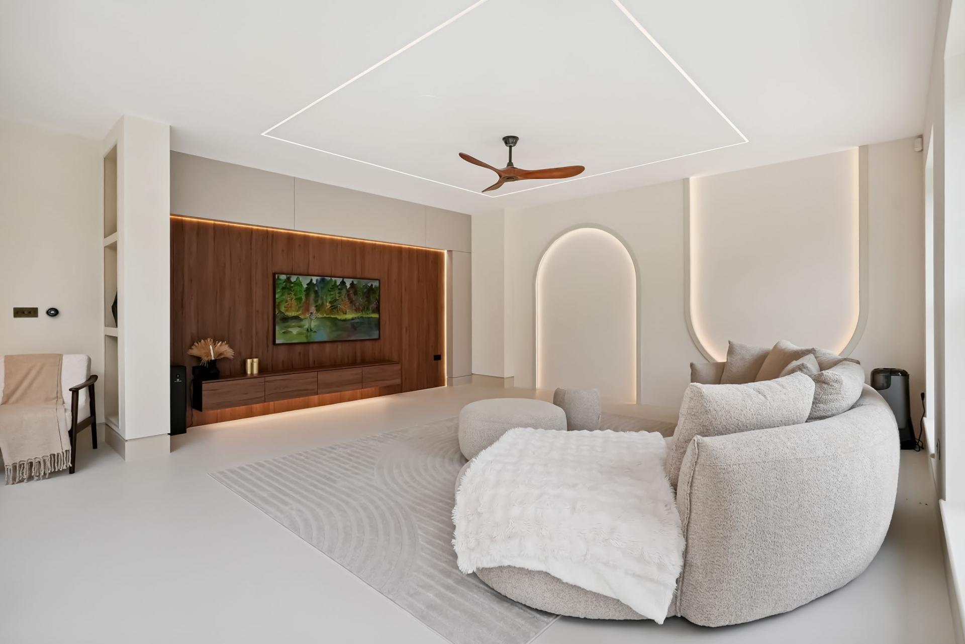 At the heart of the home is the incredible open-plan kitchen/dining/living space. Designed with entertaining and family life in mind, the kitchen is fitted with a high-end, custom-designed range of ‘Nolte’ units and ‘Siemens’ appliances, including two dishwashers, an espresso machine, smart ovens, and a vented induction hob. An impressive island unit is crowned by pendant lighting, while a curved ‘Halo’ LED ceiling feature with circular skylight defines the dining area. The adjoining lounge features elegant cashmere and walnut décor and concealed cabinetry, creating a serene, sophisticated living space.