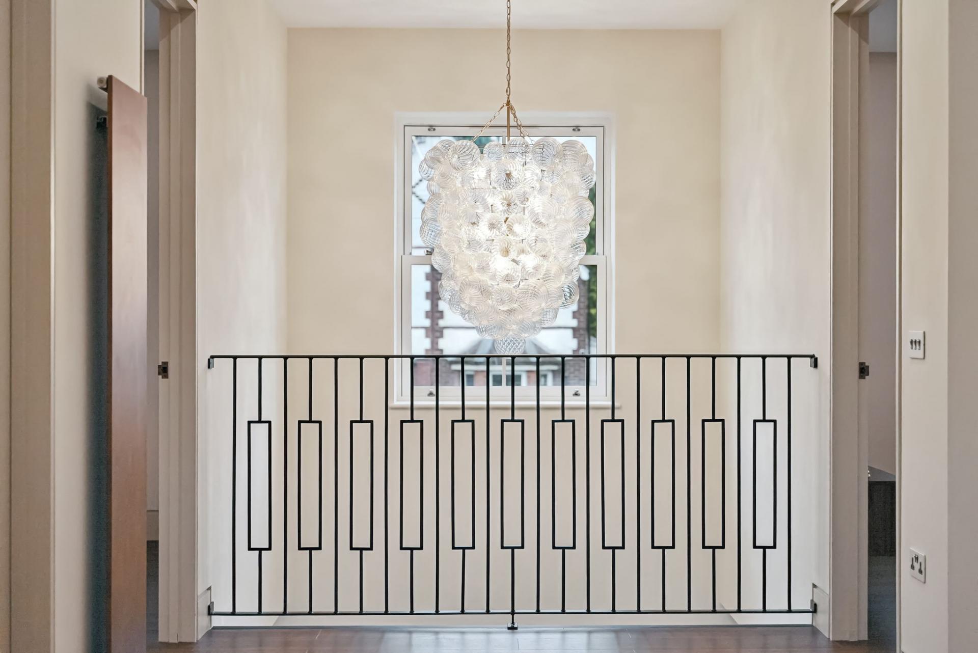 Step into the grand entrance hall, where a vaulted ceiling and a statement bubble chandelier greet you, complemented by black wrought iron balustrades with oak handrails and a cleverly designed glass-enclosed wine store beneath the stairs. The hallway is just a taste of the exquisite features to come.