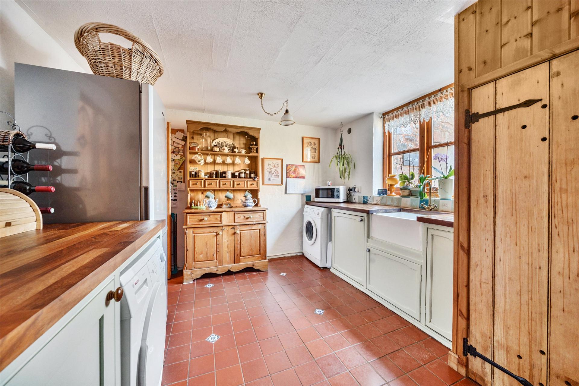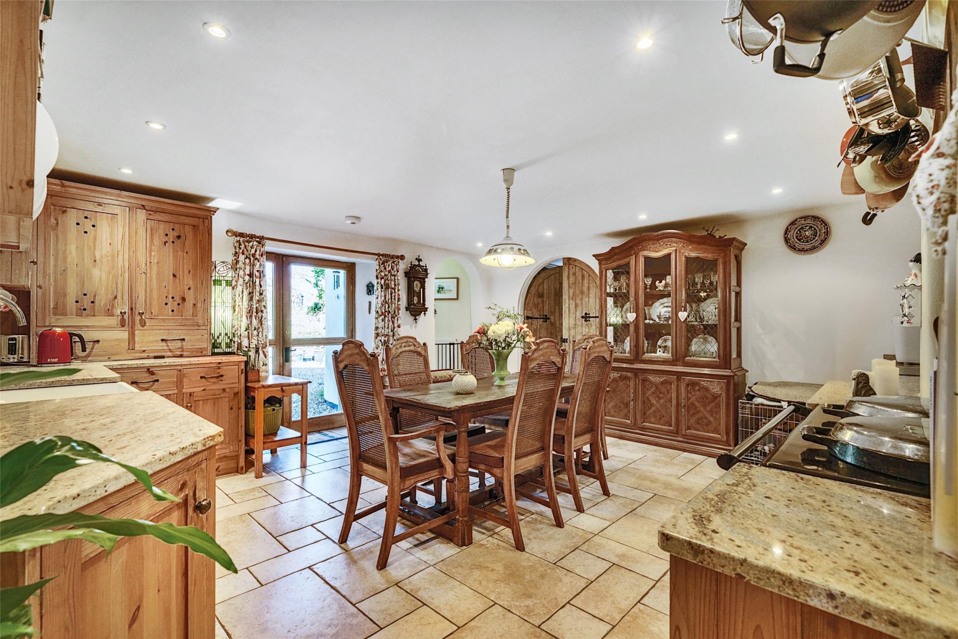 A welcoming kitchen/dining room lies at the heart of the home, featuring a traditional oil-fired Aga and a range of solid wooden units, with ample space for family dining. A clear glass oak door offers a lovely outlook and access to the garden. Adjoining the kitchen is a generous utility room with a convenient WC.