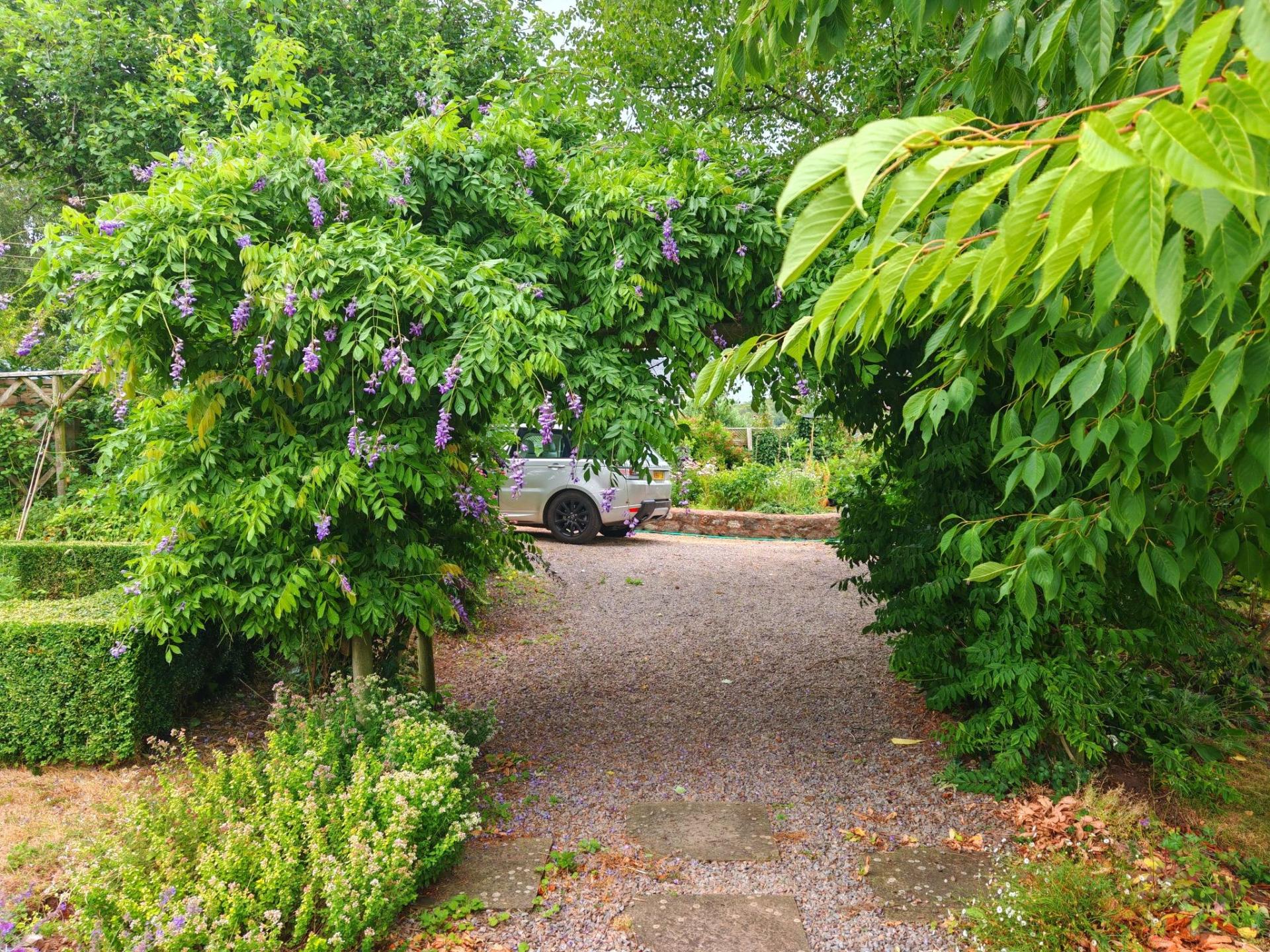 The gardens are based on cottage garden design, with trees, shrubs and mainly perennial flowers such as cowslip, hellebores and snowdrops in the spring, to foxgloves, delphinium, roses, geranium, etc. which attract a multitude of pollinating insects. Wildlife finds a quiet haven here attracted to the vegetation and two large ponds connected by a waterfall. The summerhouse is frequently used and is so cosy. Frequently walking in this area, the country lanes, farm tracks and nearby Grand