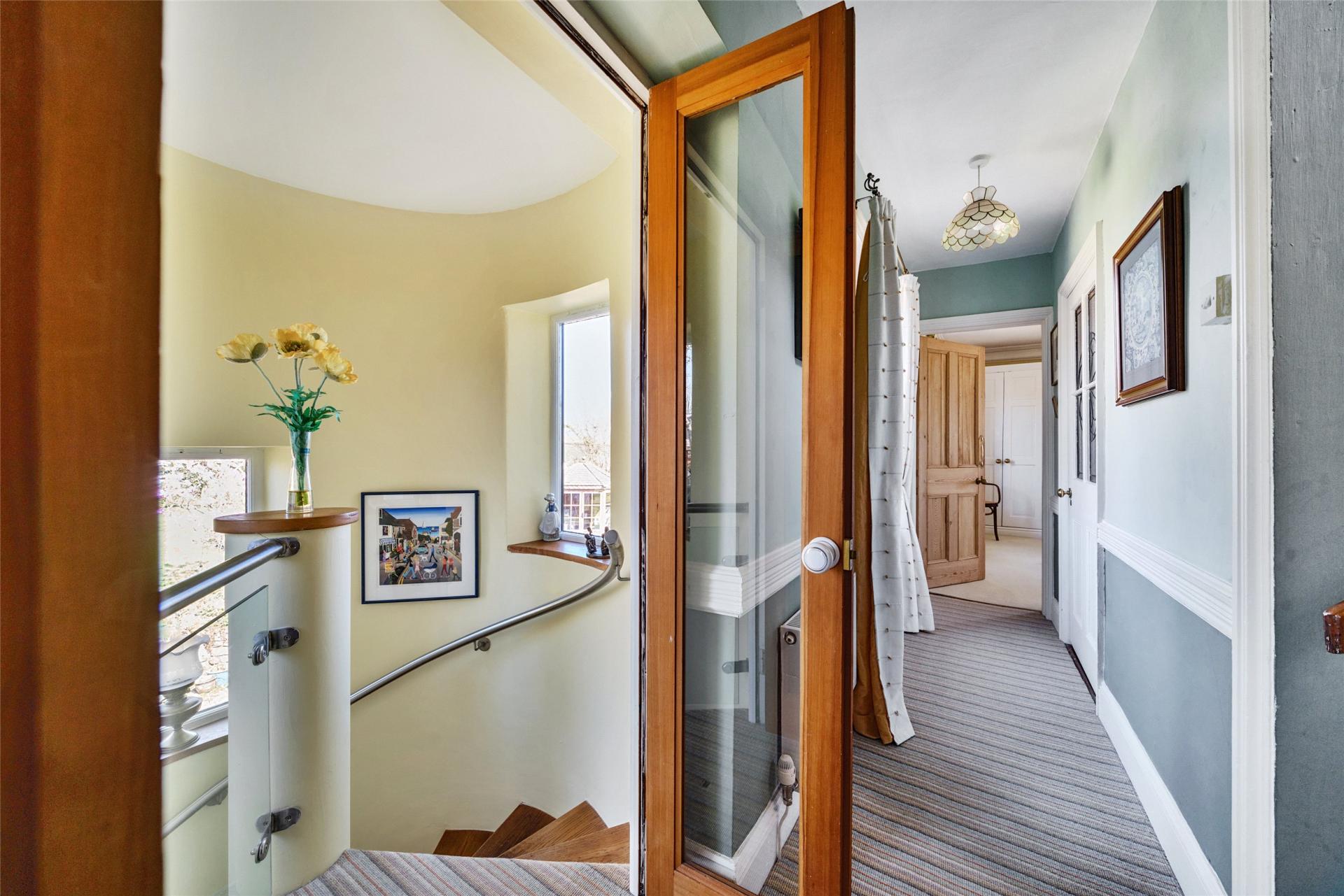 A striking spiral staircase with stainless steel and glass balustrades rises to the first floor, where a spacious second sitting room enjoys wonderful garden views. French doors open onto a balcony, an ideal spot to relax, whether indoors or out. A side door also provides direct access to the village lane and nearby pub.