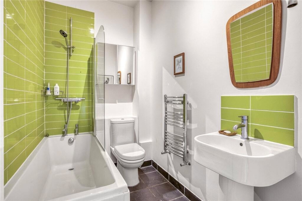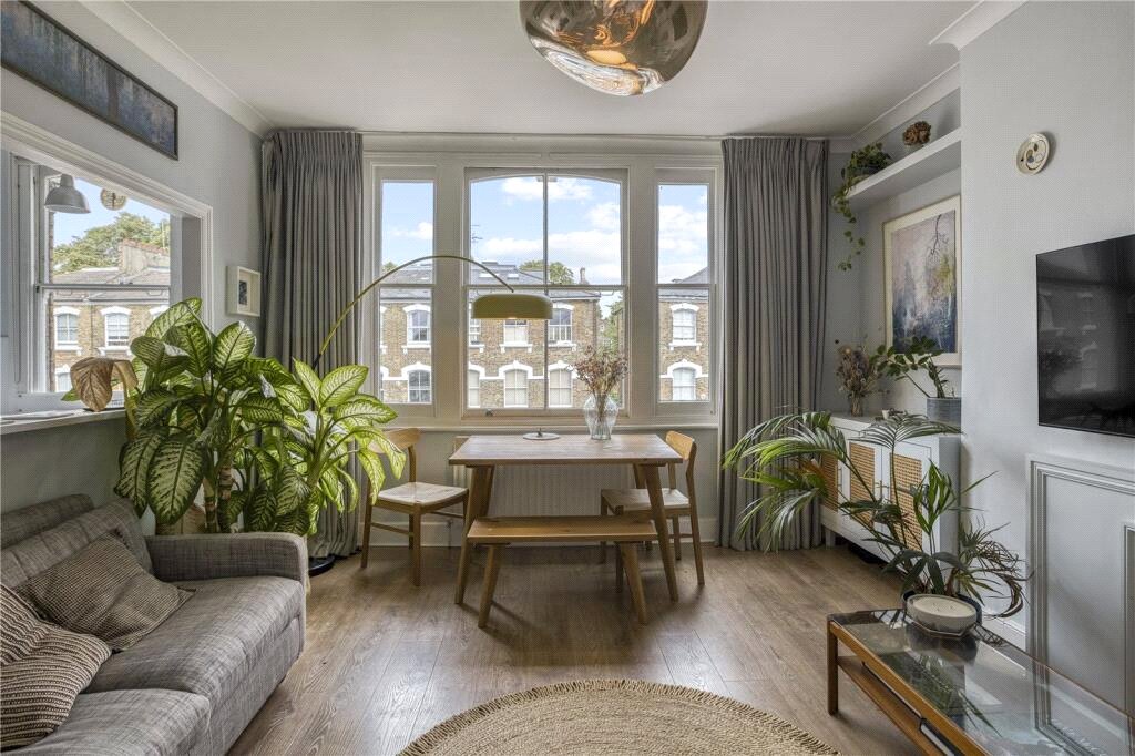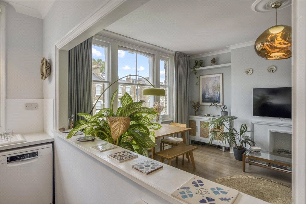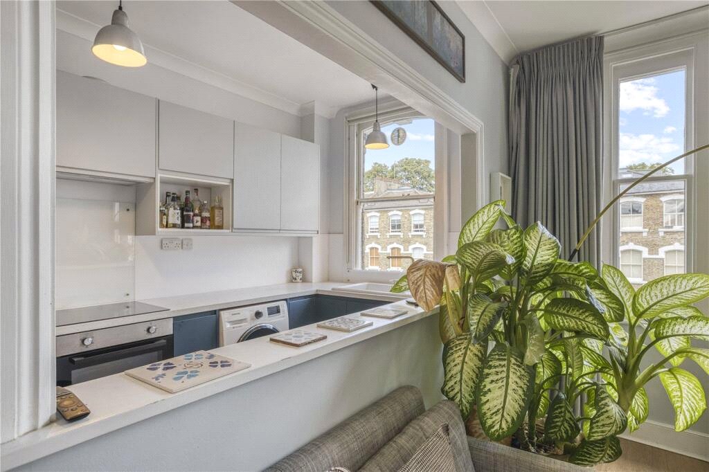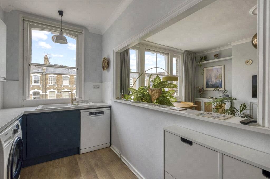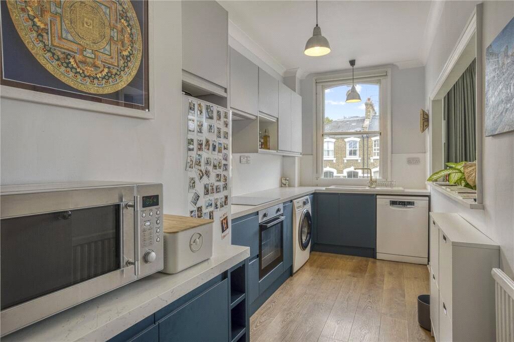 A front-facing reception room, enhanced by lofty ceilings and large sash windows, offers excellent natural light, with the kitchen set parallel to provide a sense of separation whilst retaining a bright and airy feel.