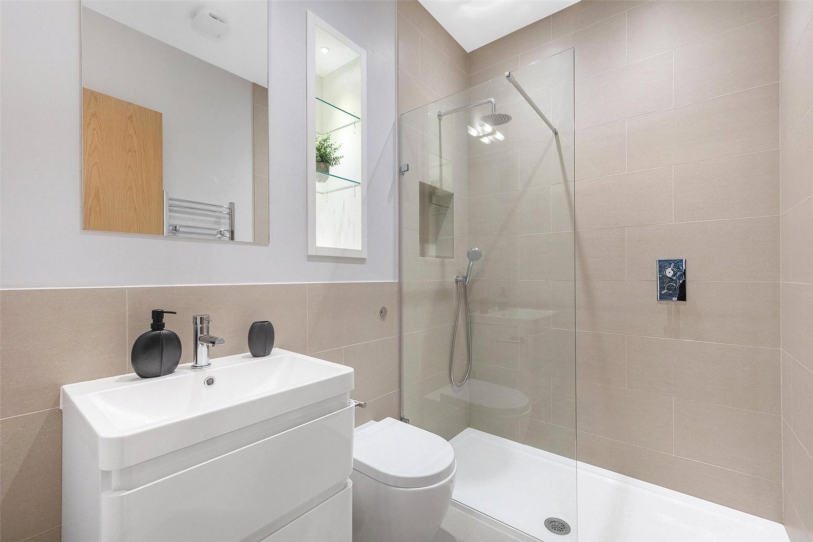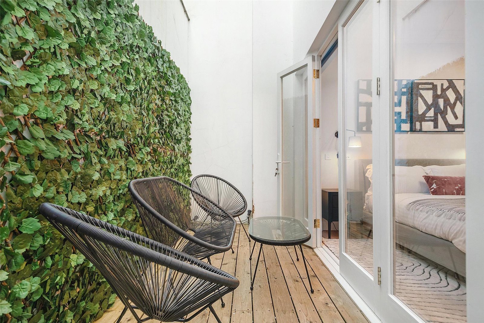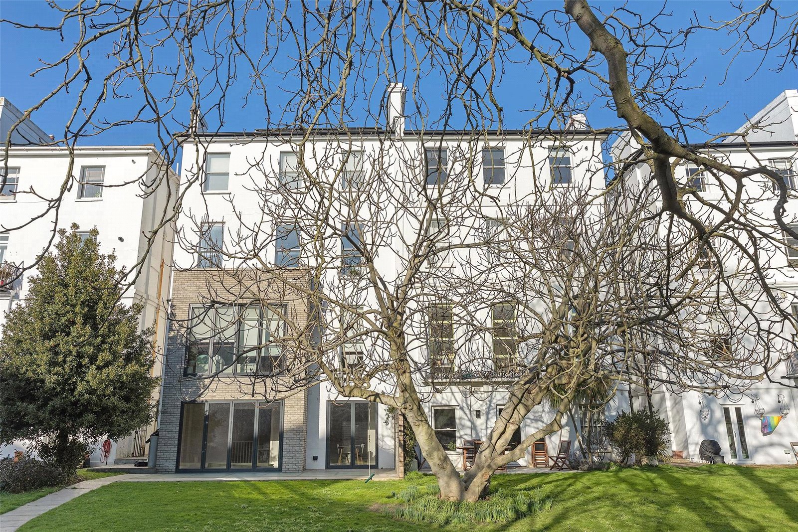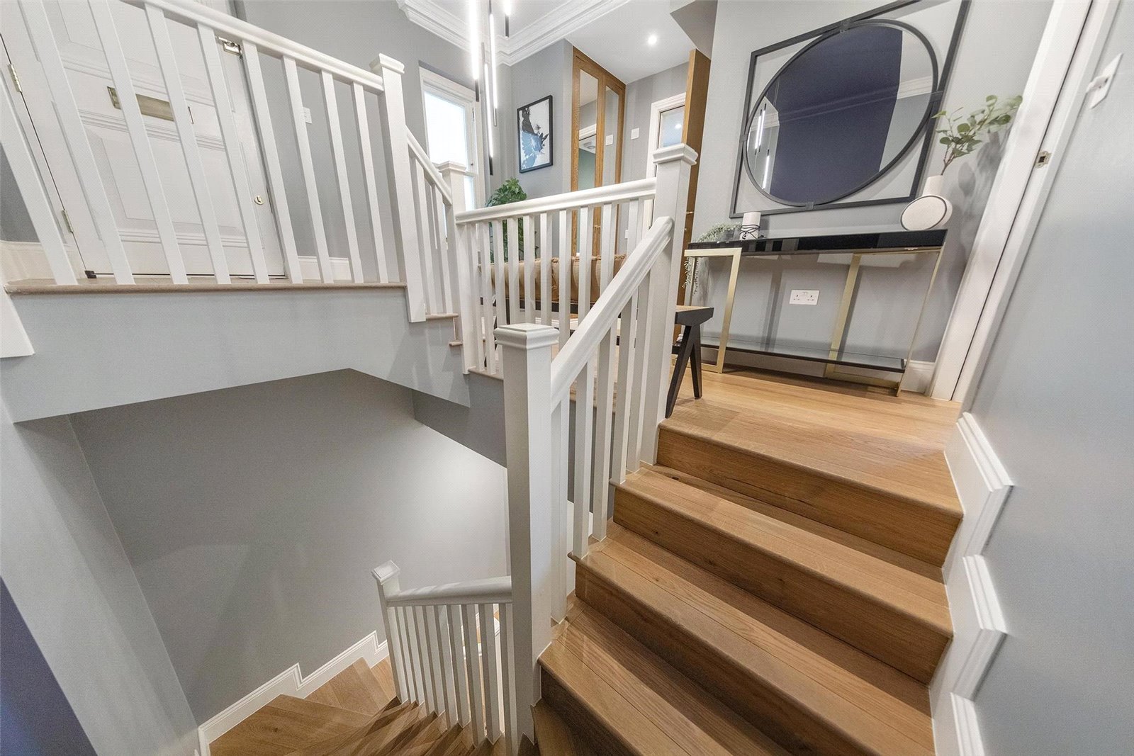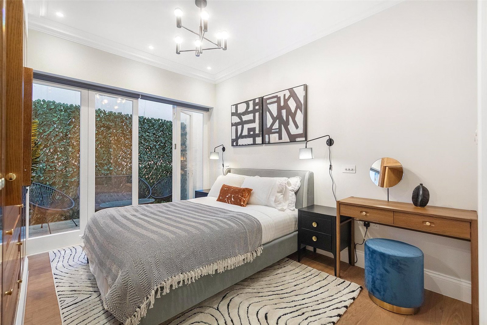 As you descend to the lower ground floor you will find two double bedrooms, an ensuite and a family bathroom that services the other bedroom. The bathrooms are fitted with Delamere & Lassen Wenge vanity units and porcelain tiles, renowned for their durability and moisture resistance. Both bedrooms are bathed in natural light that floods through the almost floor-to-ceiling windows and afford plenty of storage and space. The principal bedroom benefits from bi-folding doors that open onto the private patio, providing a serene sanctuary to relax in.